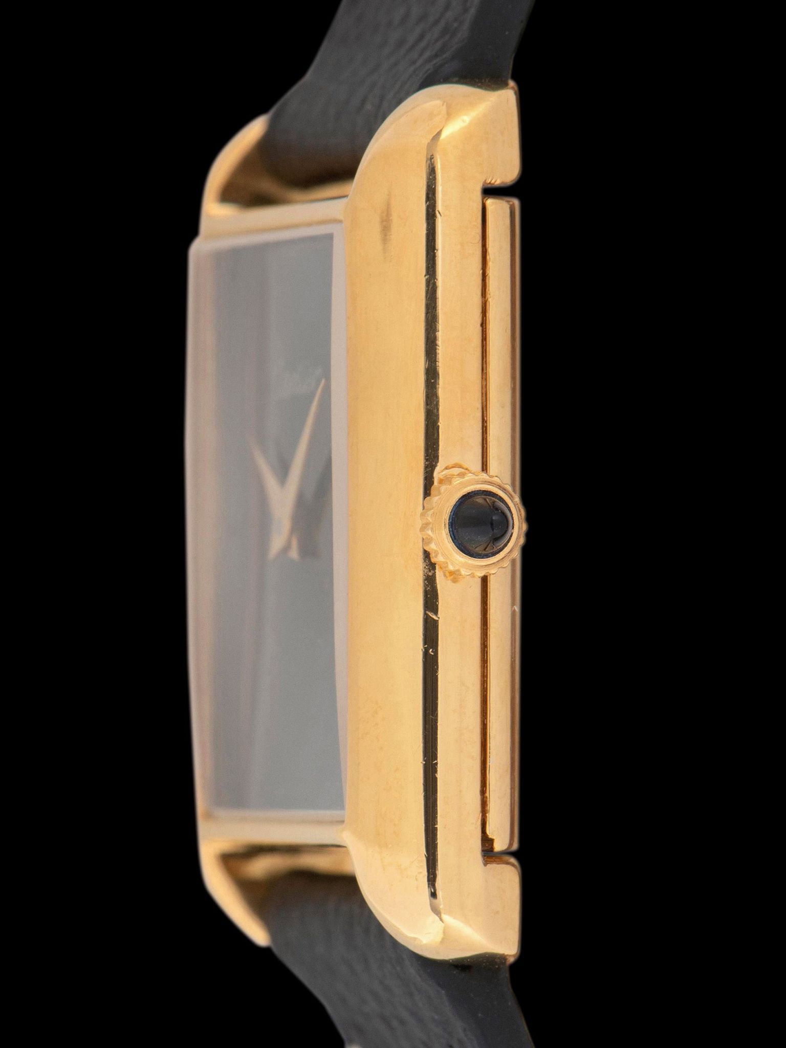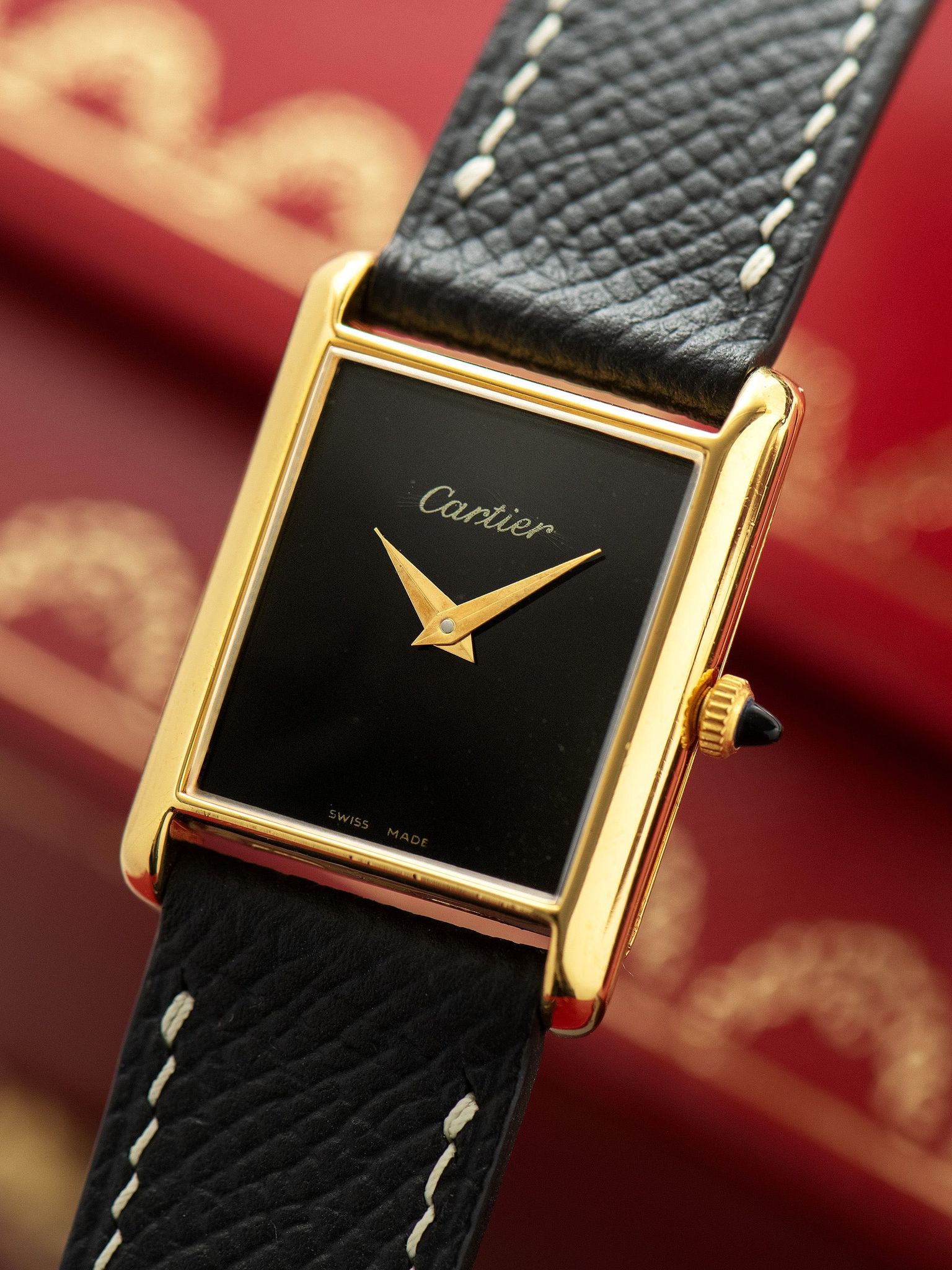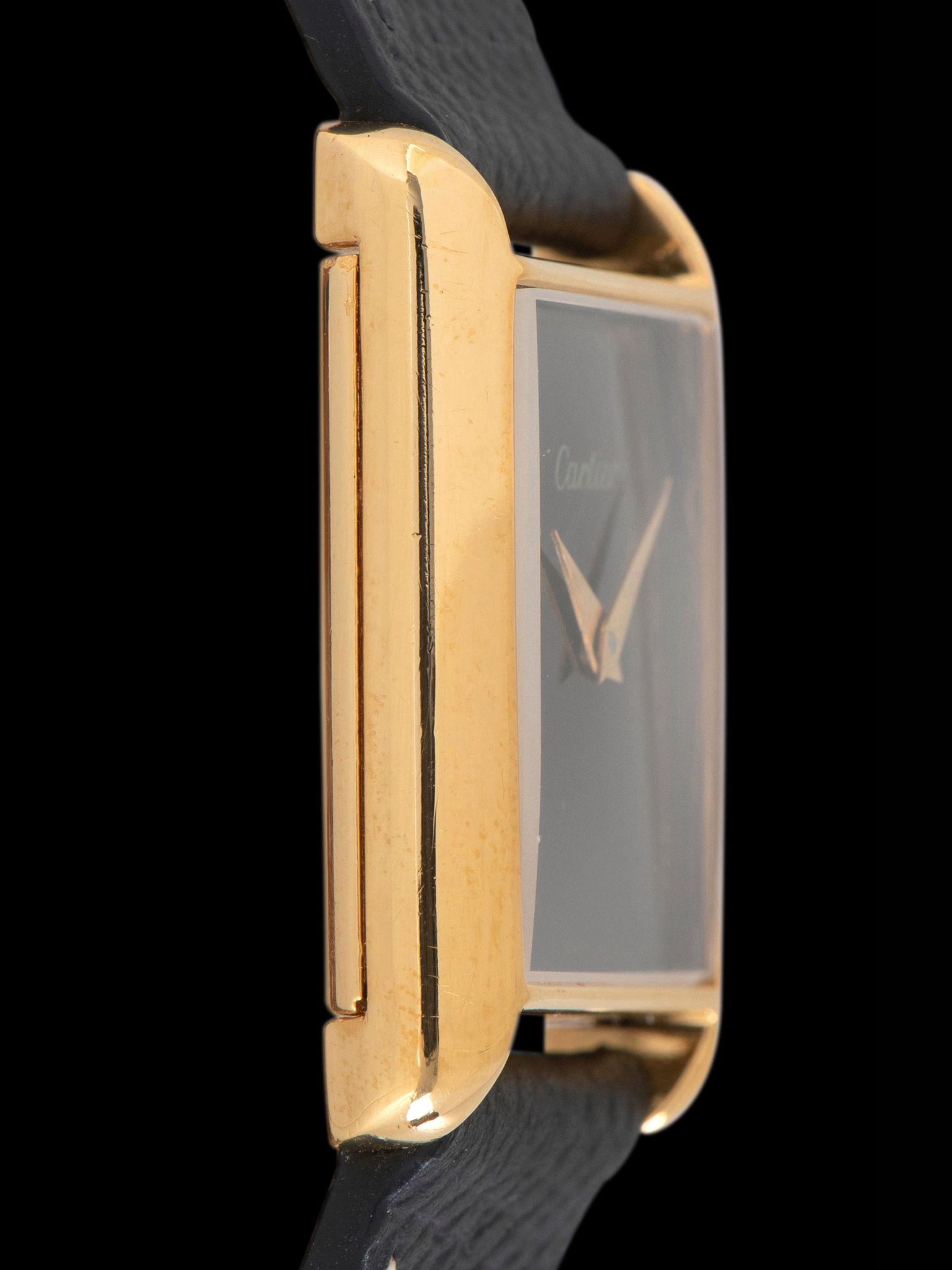 The classic and simple black dial is in excellent vintage condition, with some light spots of age and areas of spidering in the lacquer, however, these elements of age are mostly invisible to the naked eye. The original gold dauphine-style hands are also in excellent condition and match the gold "Cartier" and "Swiss Made" type on the dial.