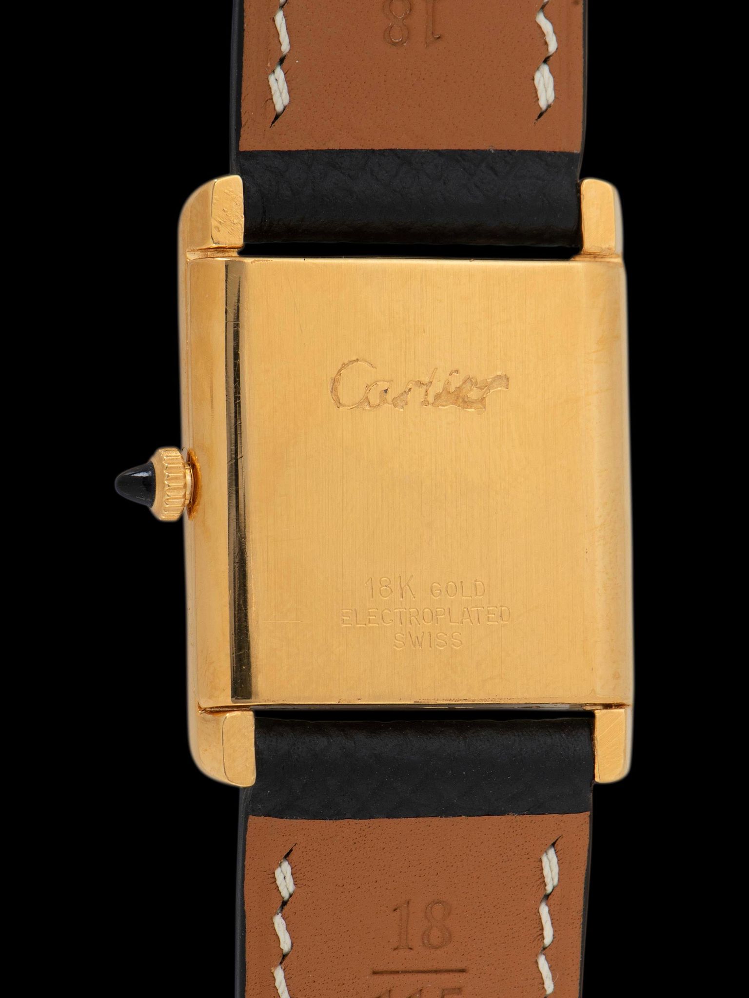 The classic yellow gold-plated case has been lightly polished in the past, retaining the factory finishing in very impressive condition throughout the case and case back with extremely deep factory markings present. The case does show honest signs of gentle use throughout with a small amount of damage present in the "Cartier" name on the case back. The watch retains its original blue sapphire cabochon crown. The watch comes supplied on a two-piece handmade leather strap.