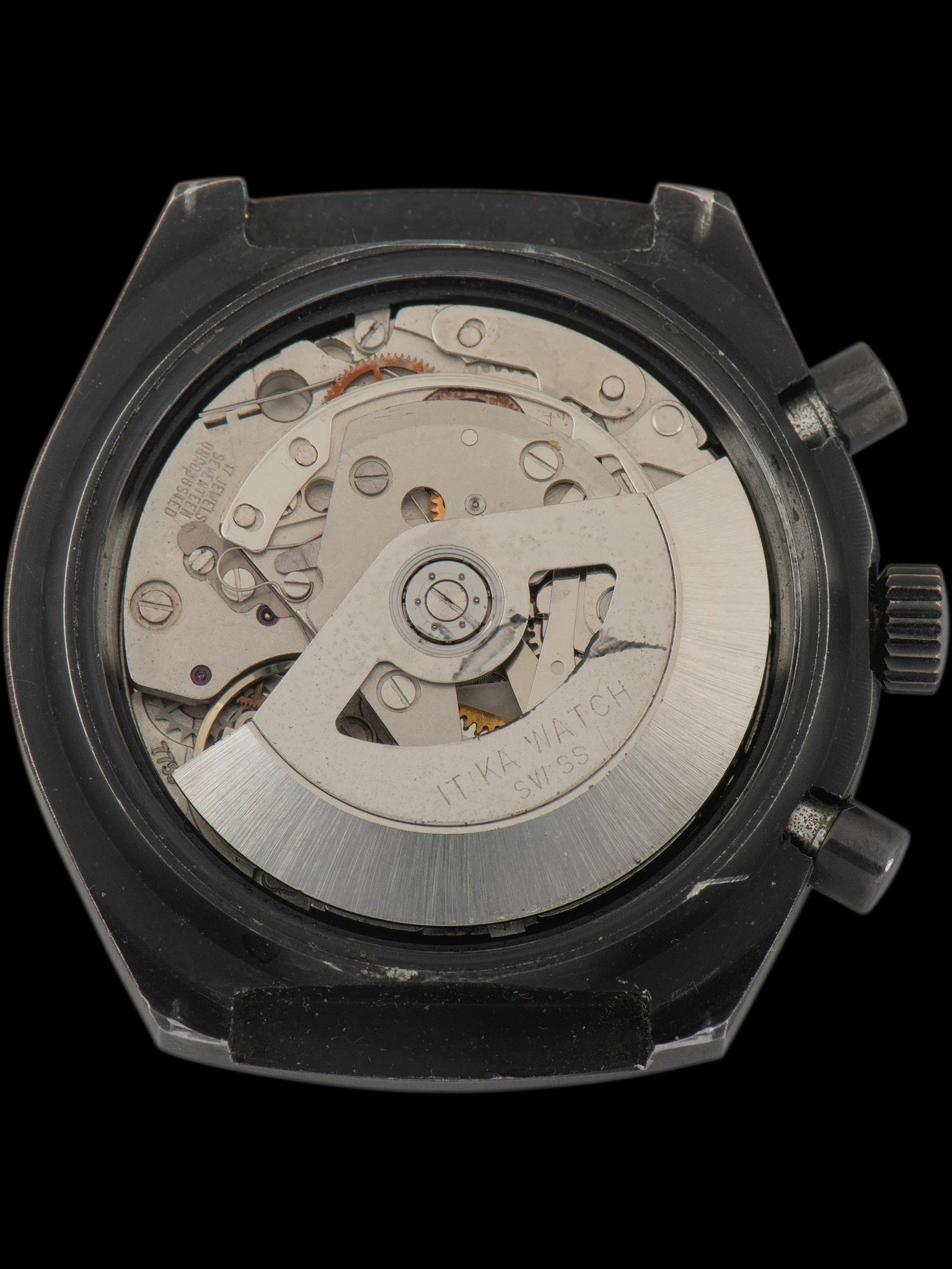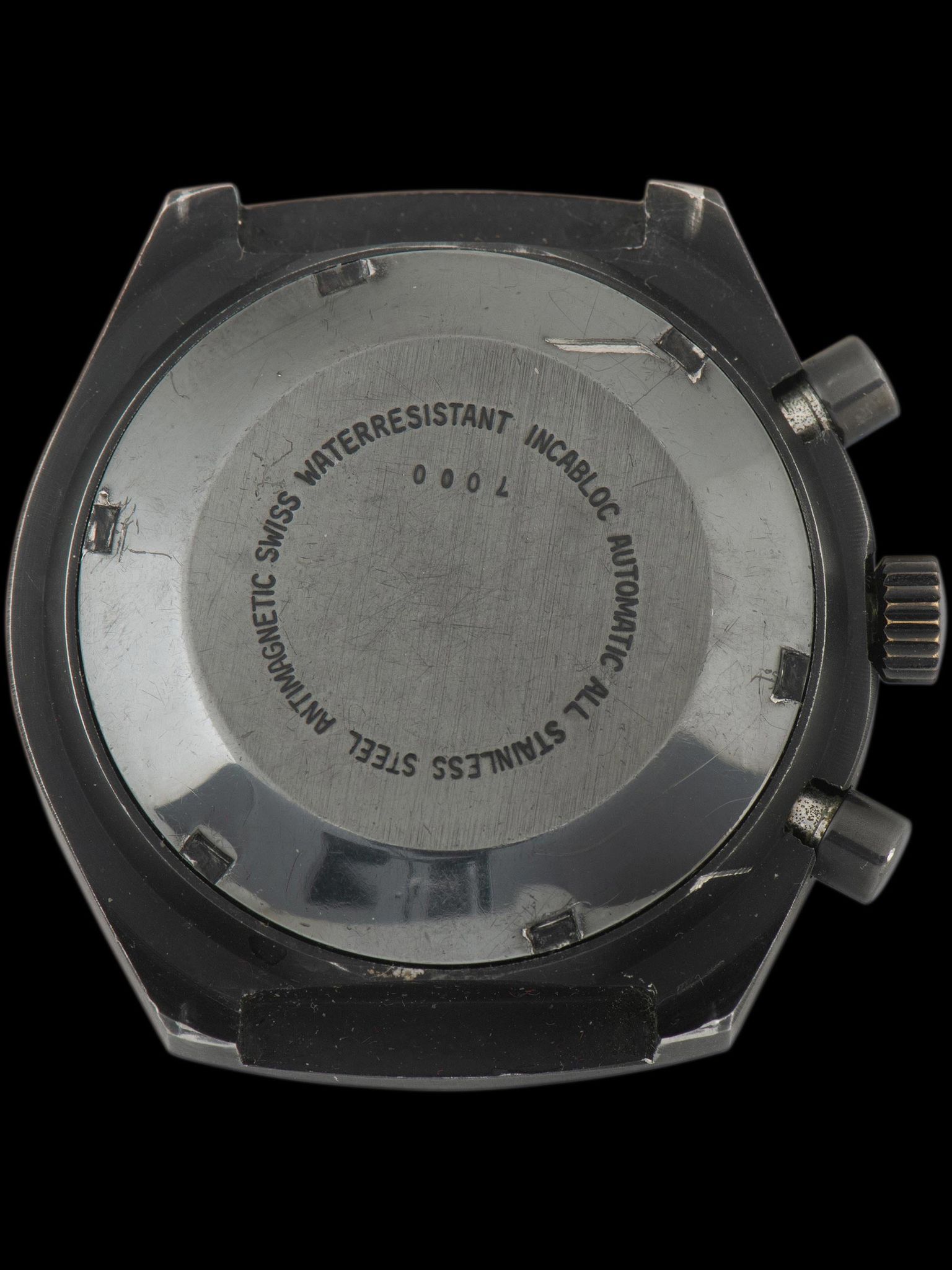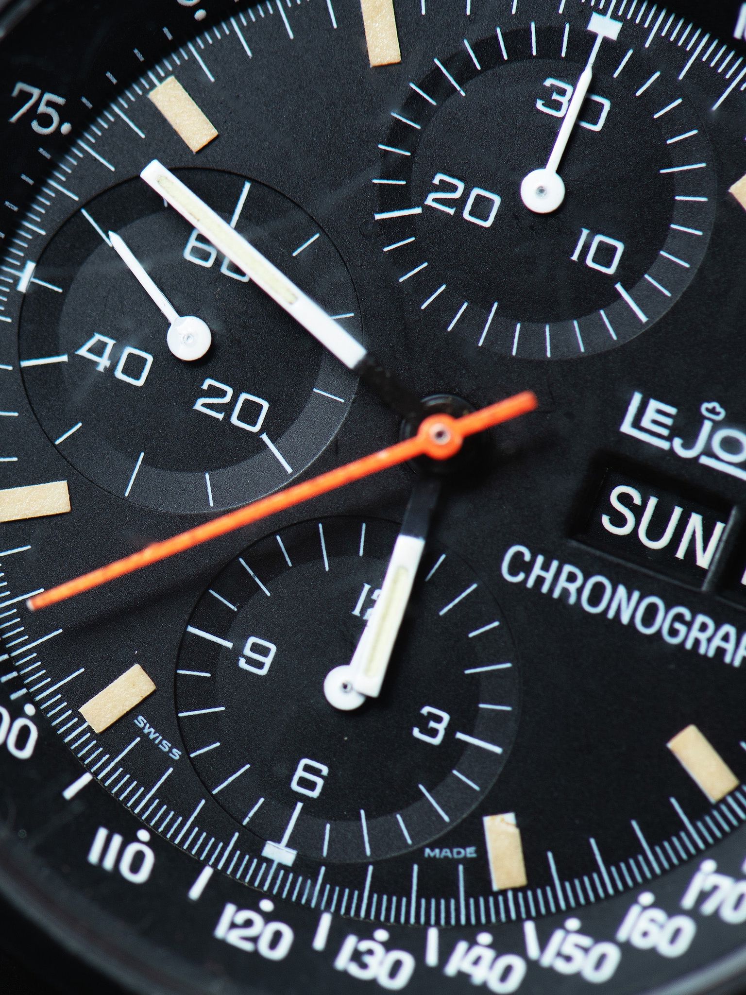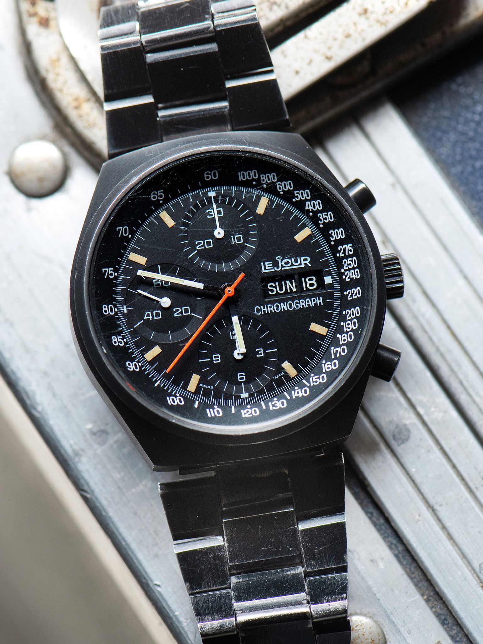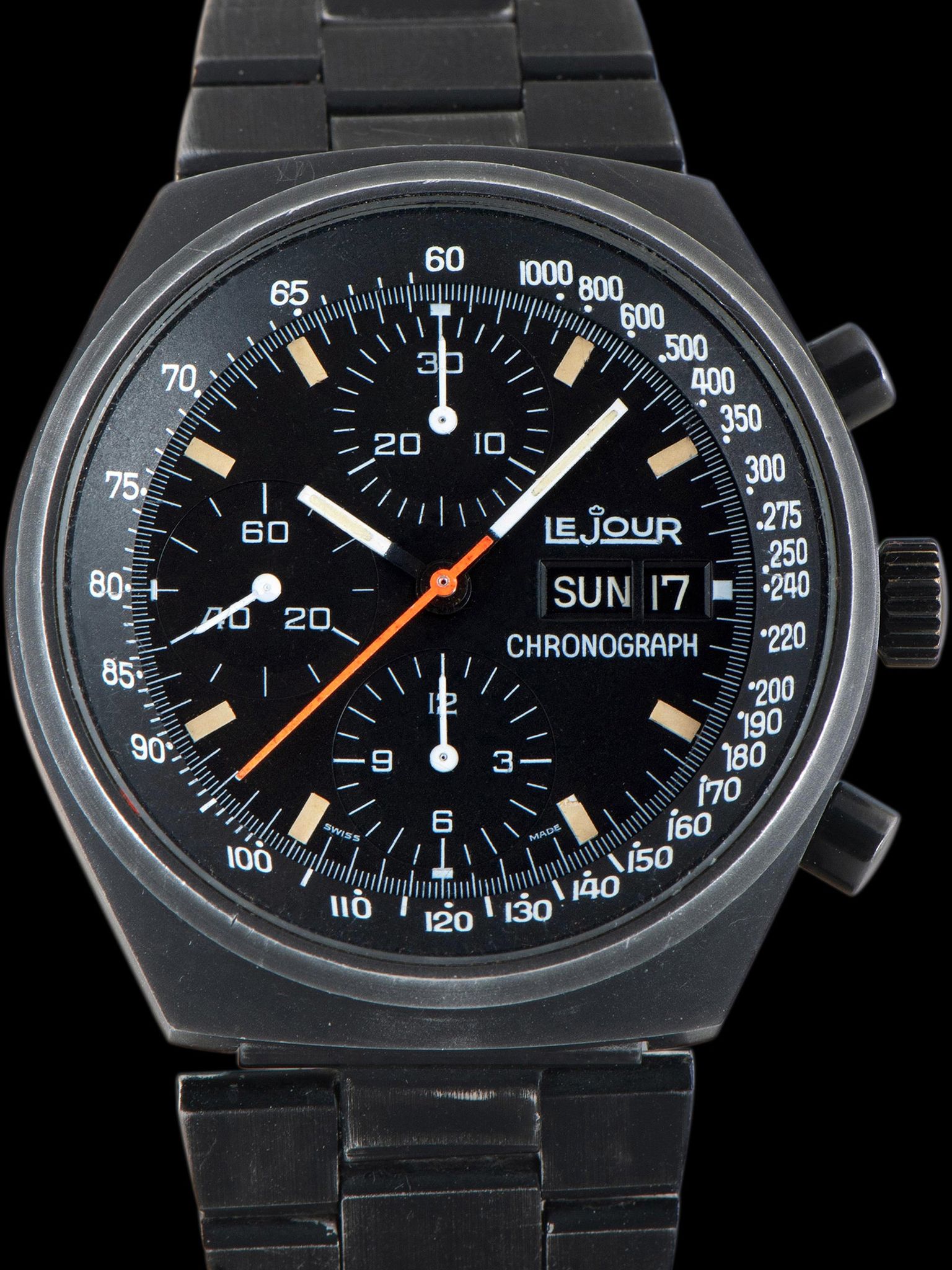 Both the Heuer and the other references, like this LeJour, used the Day-Date Chronograph Valjoux 7750, which is how it got its reference name. Orfina produced some of these references in stainless steel, but most of the sub-branded manufacturers chose to stick with the early black PVD steel case.