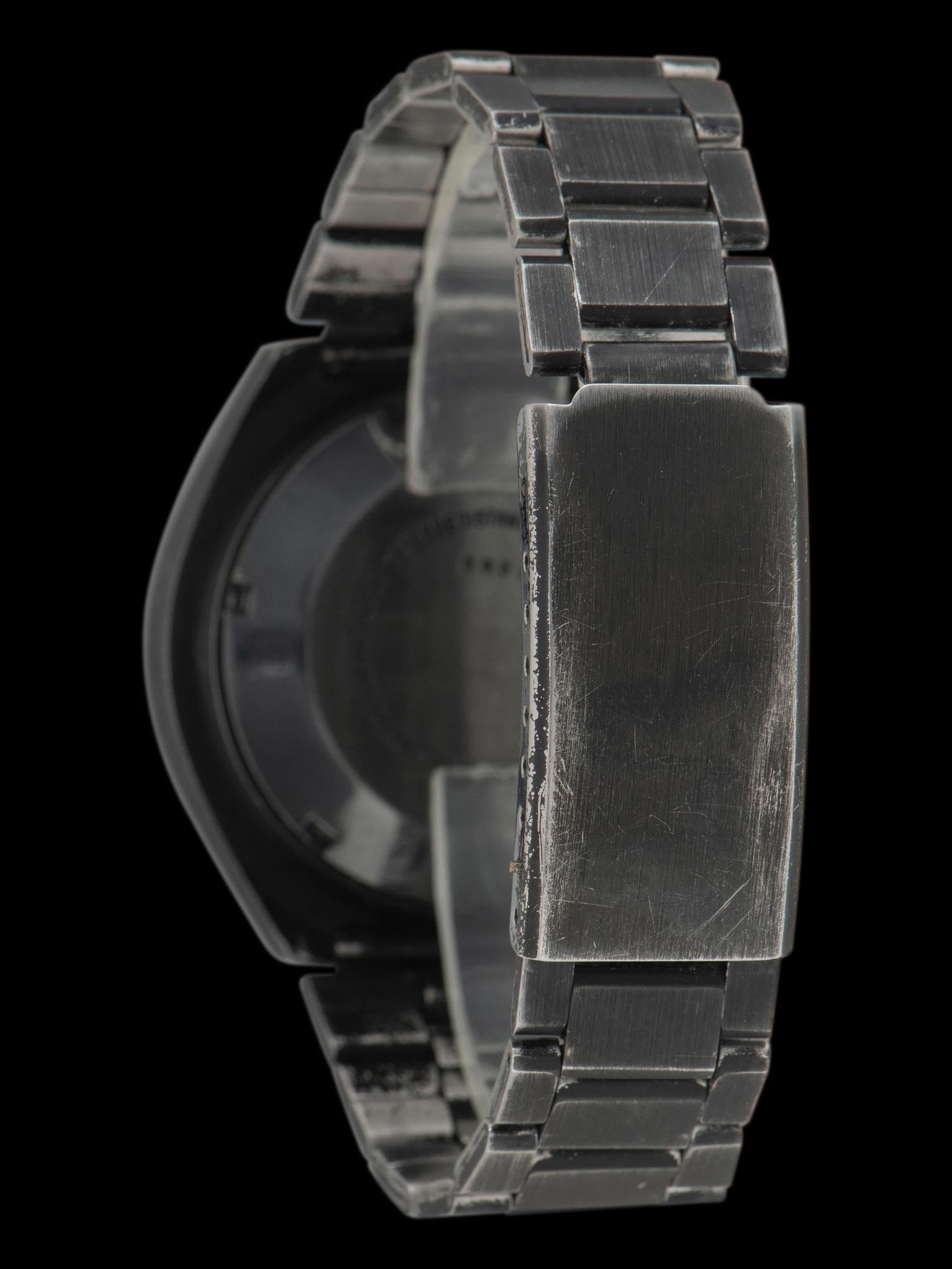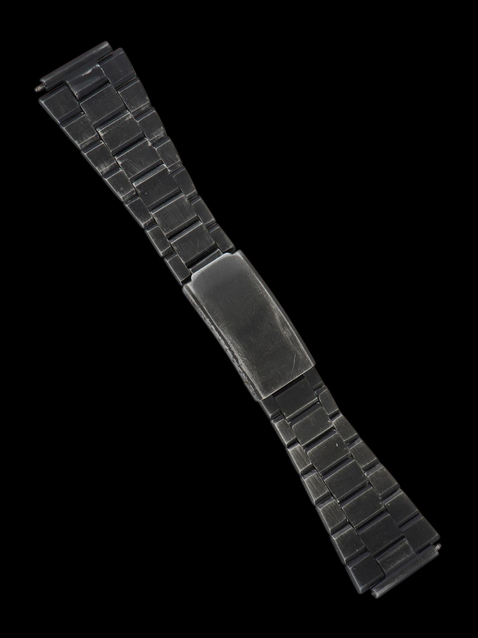 The unpolished case features its original factory PVD finish, featuring crisp edges throughout. The only notable element of age of the case is some subtle greying to the finish on the edges, which is commonly found on early PVD cases. The original mineral glass crystal does show wear and scratches. The case retains its original PVD-finished pump pushers and unsigned crown. The original LeJour bracelet does exhibit some loss of the factory PVD finishing, mostly on the underside of the individual links, and retains 14 links that show minor stretch and will fit up to a 7.25-inch wrist.