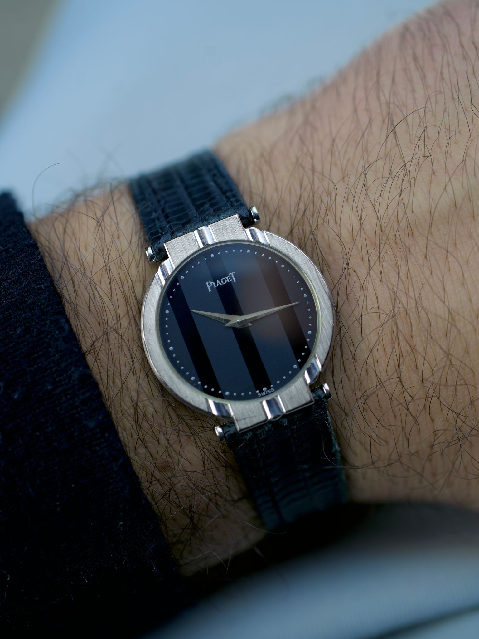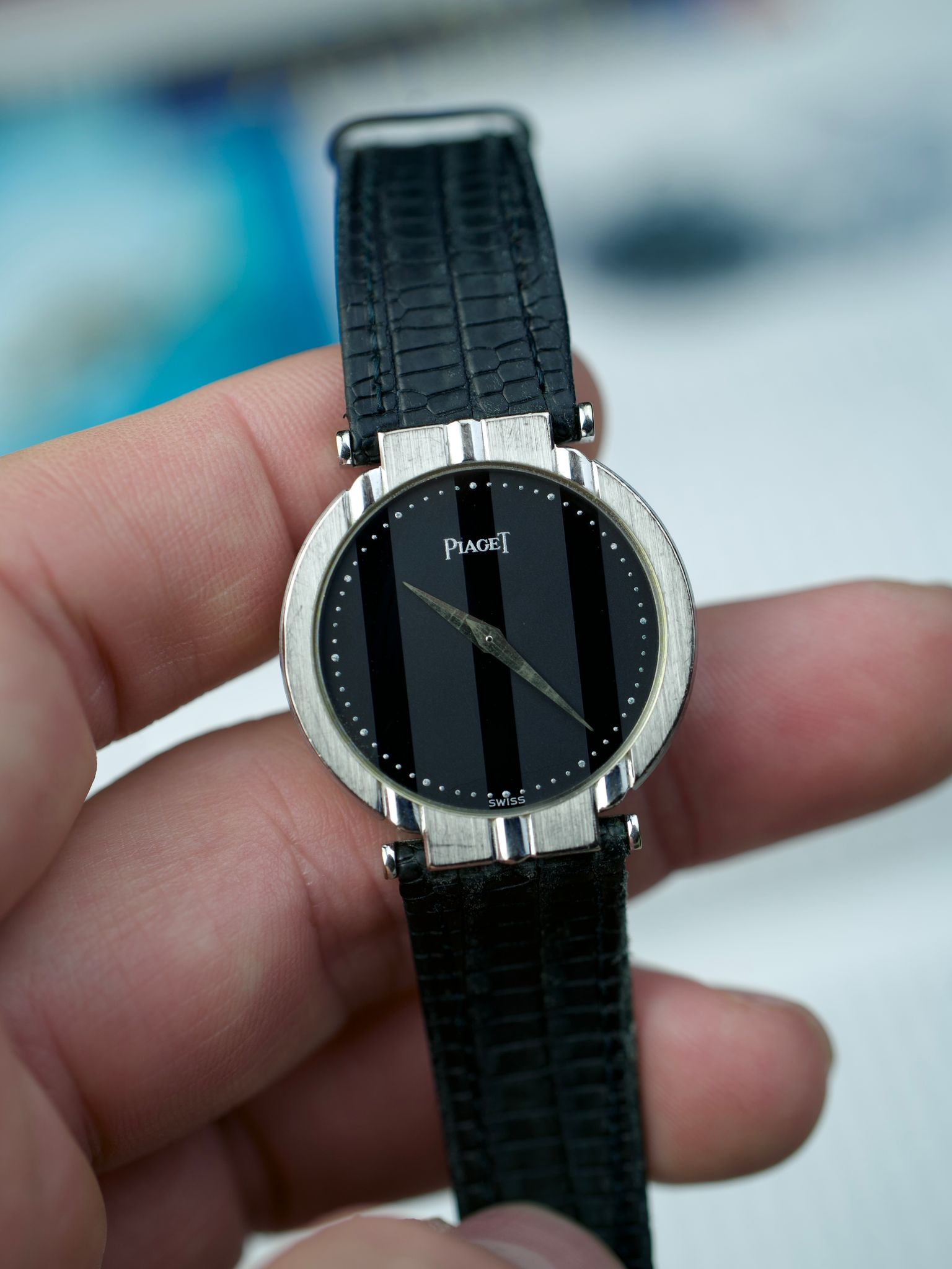 The watch presented here is the Piaget Polo 7273 from the 1980s. The vintage watch measures a beautiful 28 mm and 5 mm flat case in 18 carat white gold. The pin buckle is in white gold as well! The watch features an exceptional Onyx stone dial with matt and shiny strpies! One of only a handful made! Unique piece? Could be!
