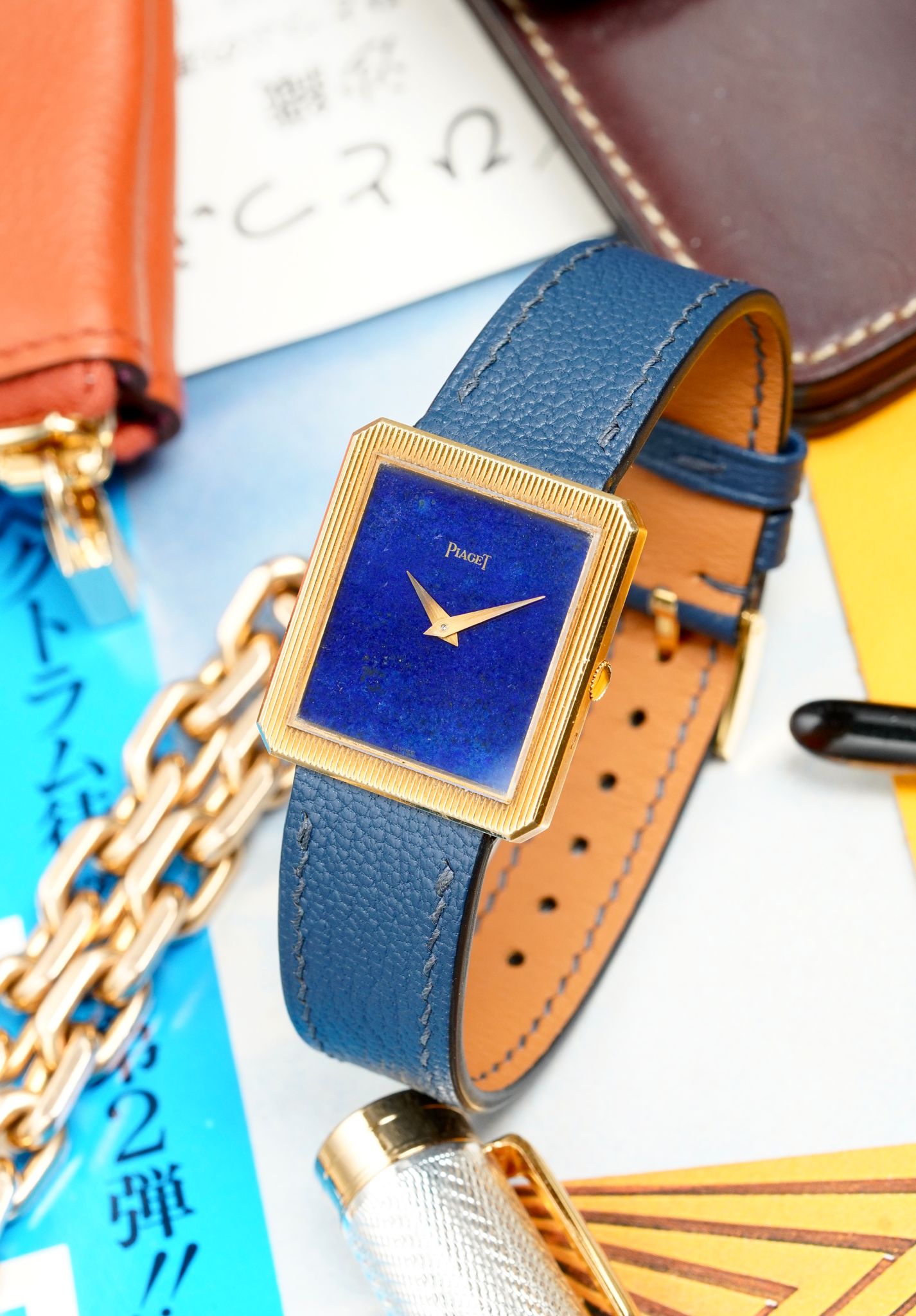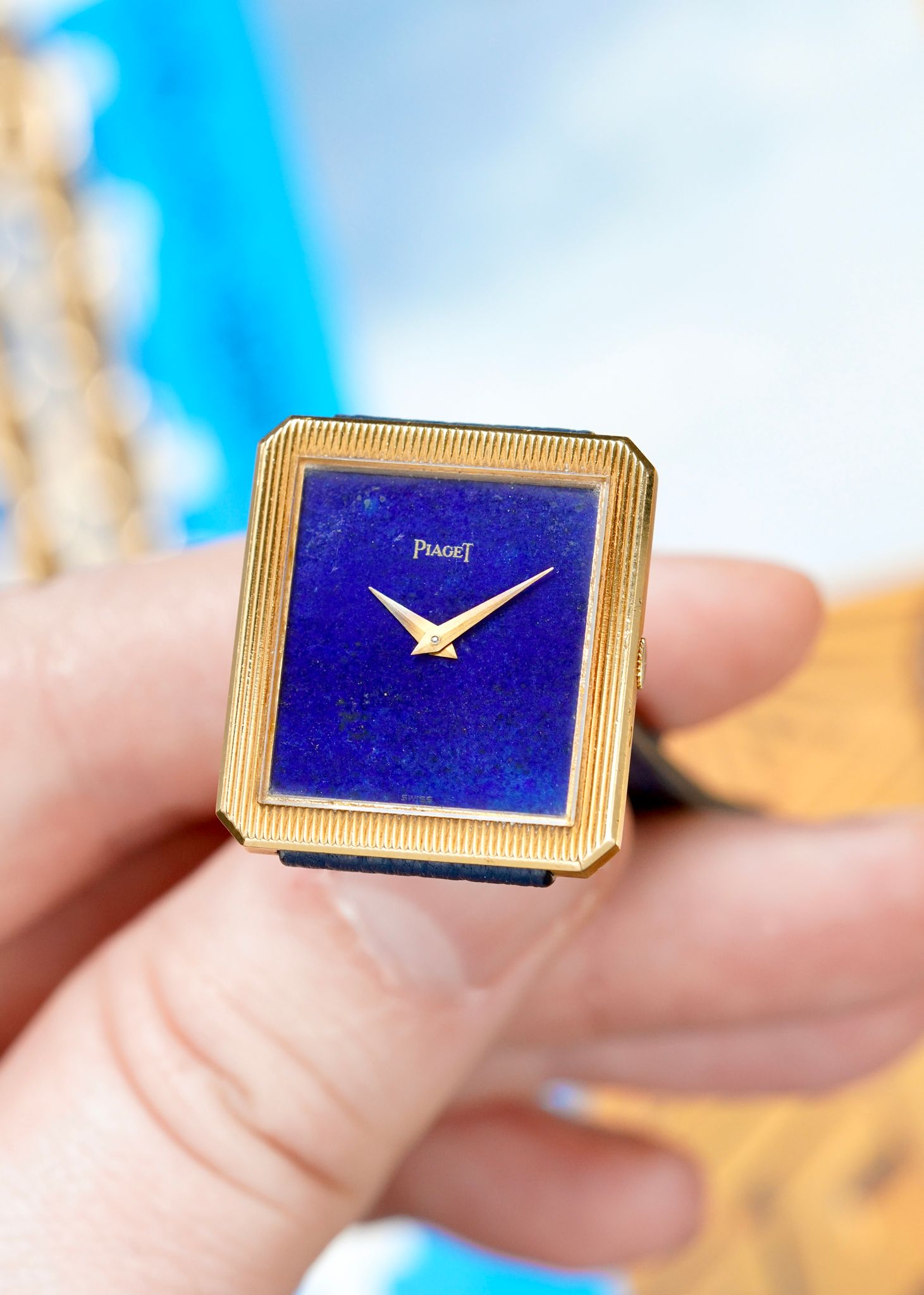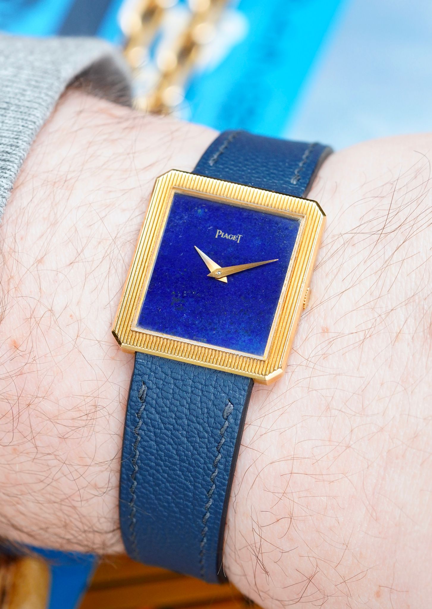 A fabulous 1980s Piaget Protocole ref. 9154 with a beaming blue dial hewn from Lapis Lazuli stone, in flawless condition with zero cracks, unpolished ribbed 18k yellow gold case, and a signed 18K yellow gold pin buckle, powered by the ultra thin manual wind cal. 9P, this configuration of the famous Protocole is one of my personal favorites and hard to find.