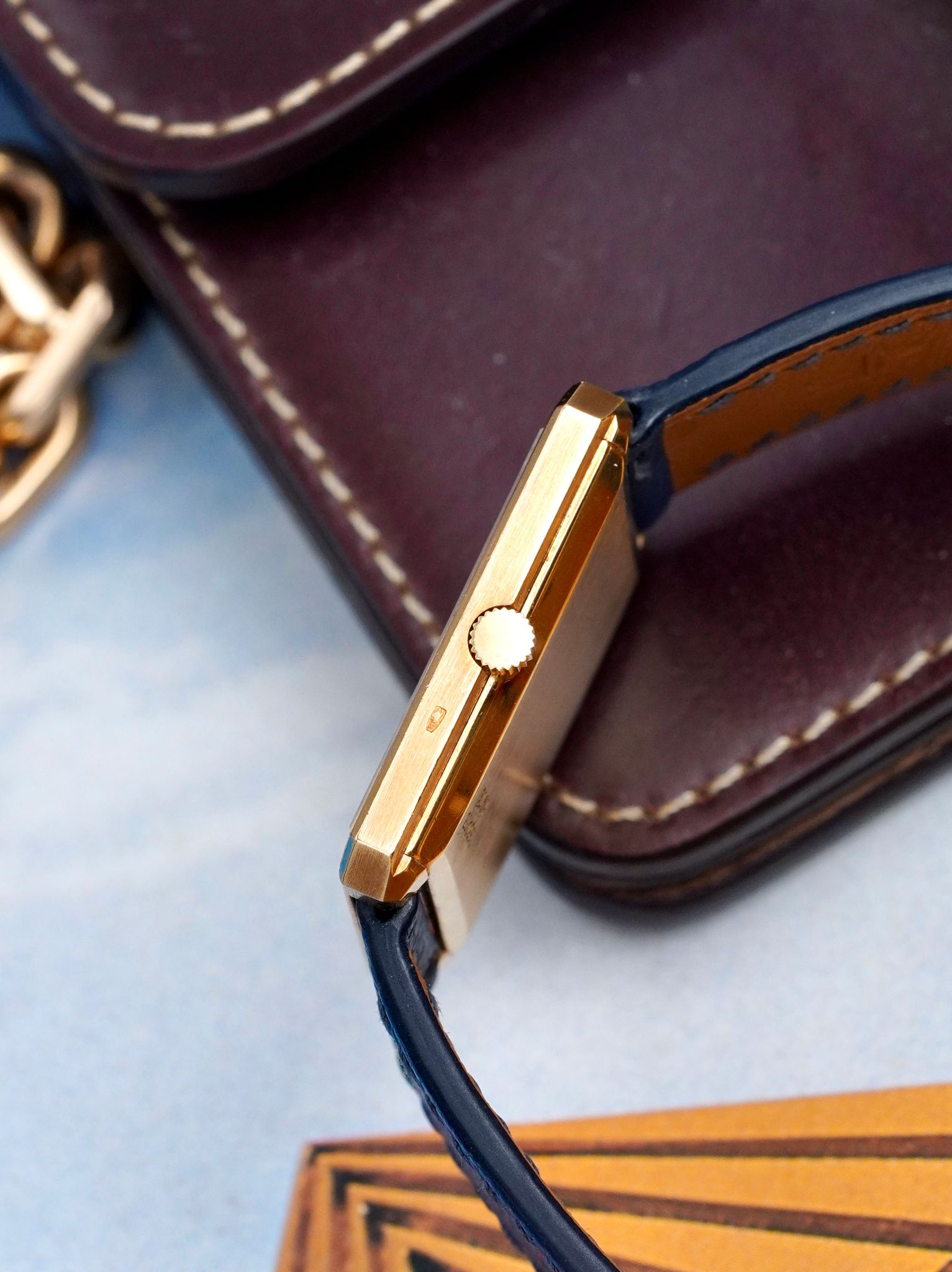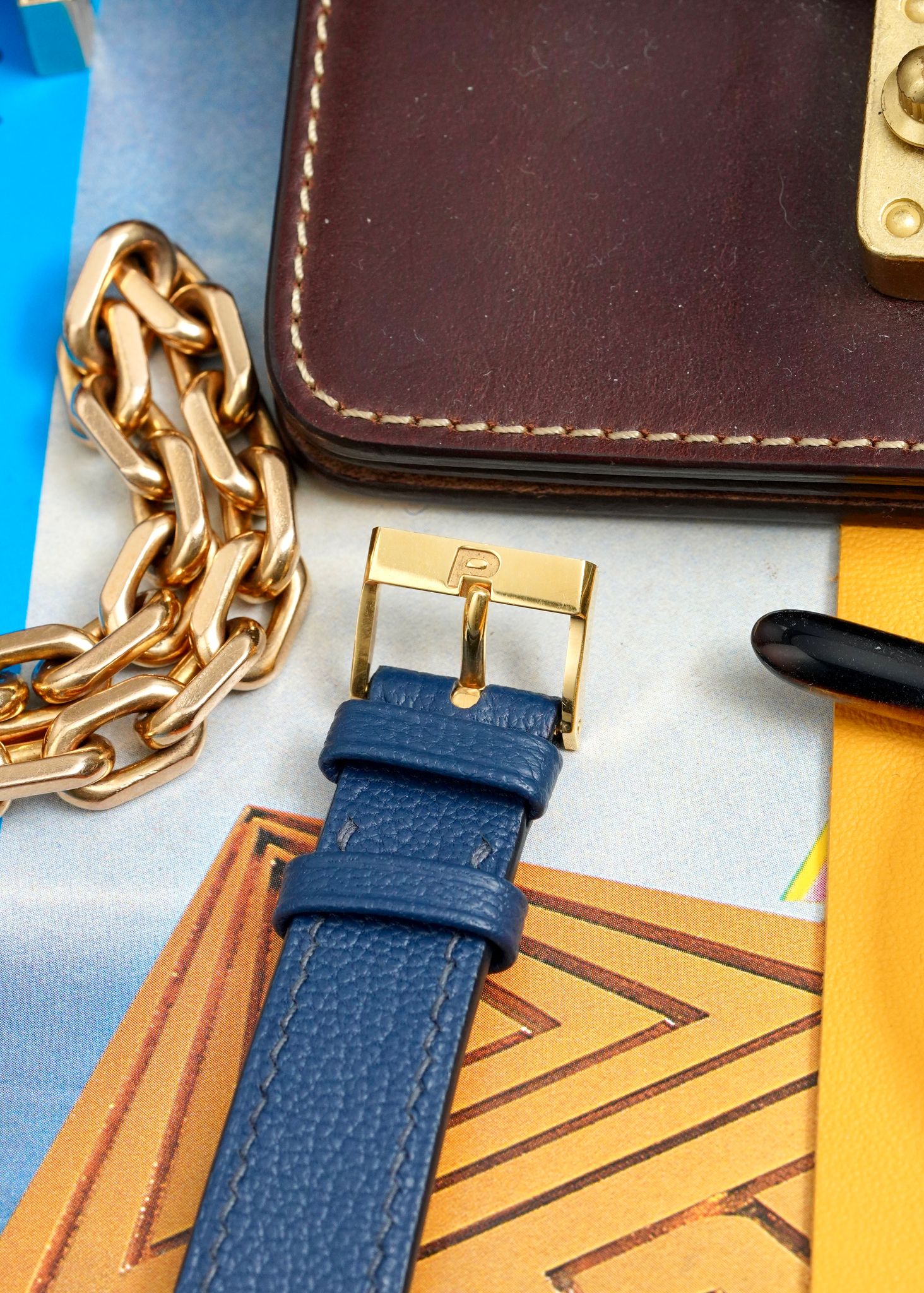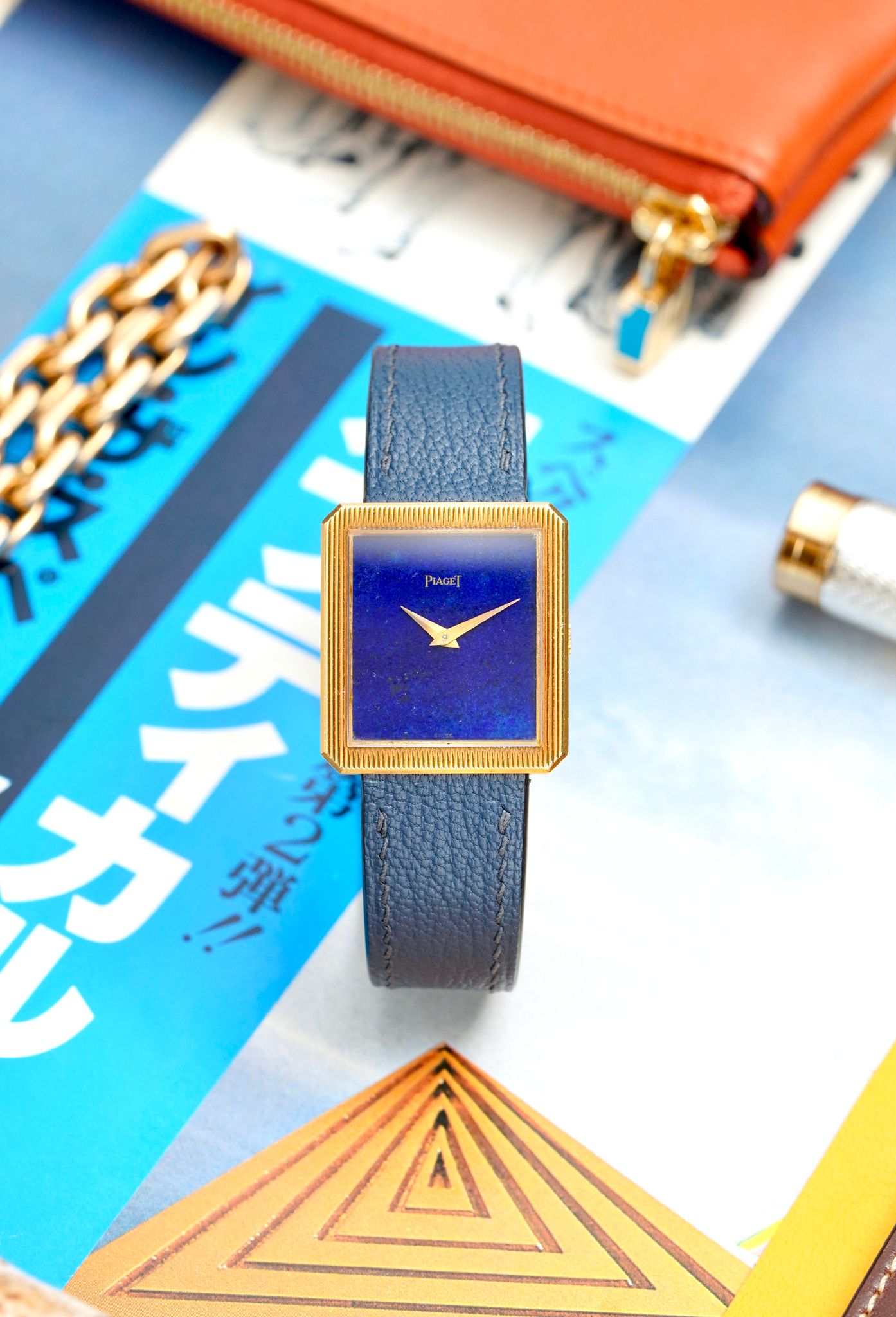 A fabulous 1980s Piaget Protocole ref. 9154 with a beaming blue dial hewn from Lapis Lazuli stone, in flawless condition with zero cracks, unpolished ribbed 18k yellow gold case, and a signed 18K yellow gold pin buckle, powered by the ultra thin manual wind cal. 9P, this configuration of the famous Protocole is one of my personal favorites and hard to find.