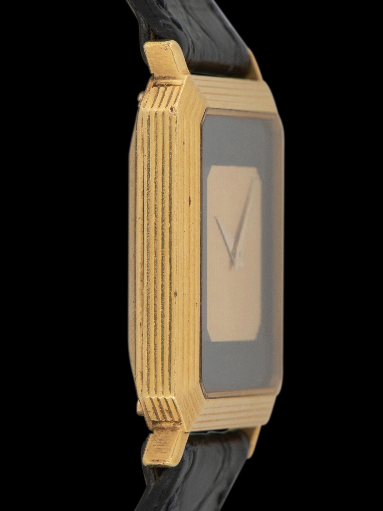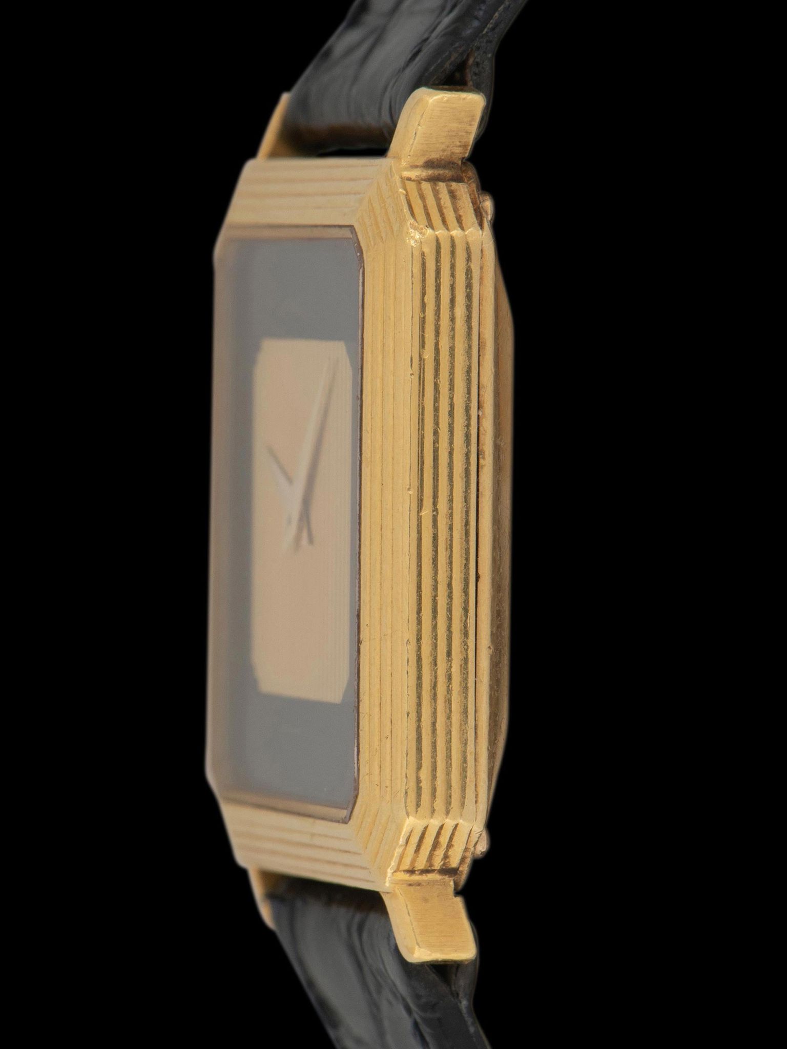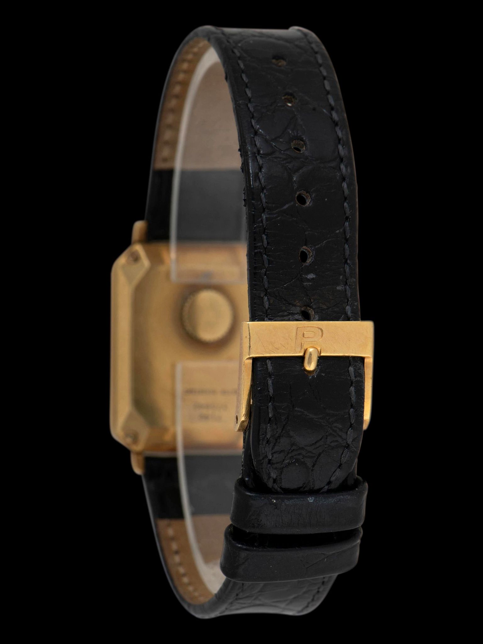 The excellent and intricate multi-stepped 18K yellow gold case exhibits honest signs of use with no notable evidence of previous polishing present. The case back retains its original factory finishing and engravings in crisp condition overall and retains the original 'hidden crown'. The watch comes supplied on a 2pc black leather strap with the original 18K yellow gold Piaget tang buckle.