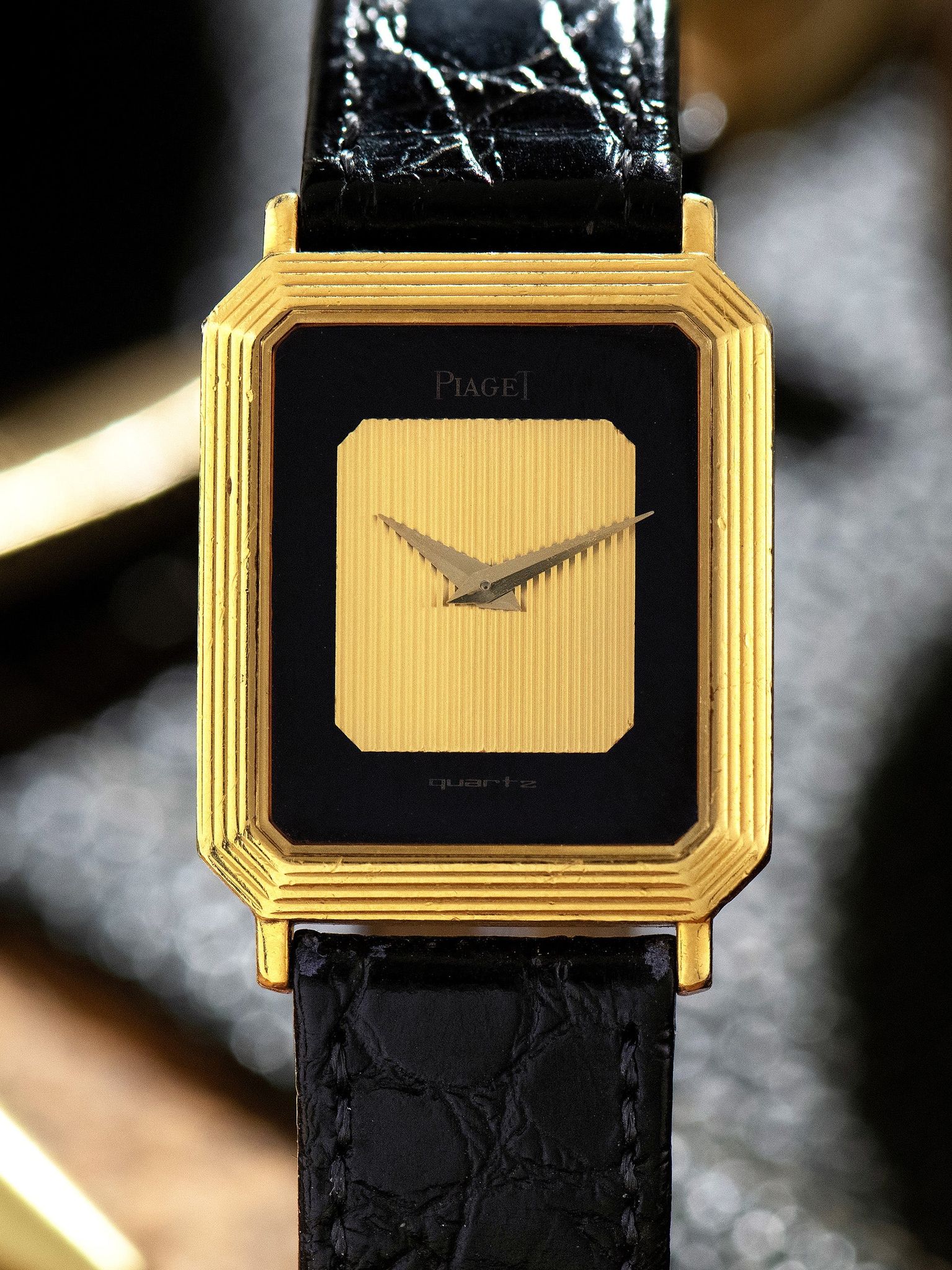 This quartz dress watch from Piaget features a quartz movement with a 'hidden' crown' design for extra sophistication and an onyx stone and gold "tapestry" dial in classic Piaget fashion.