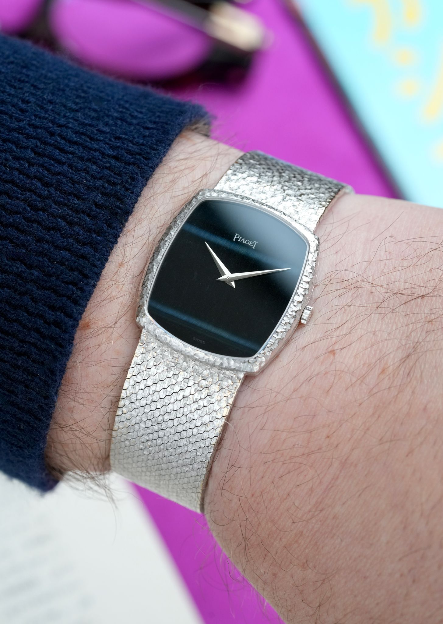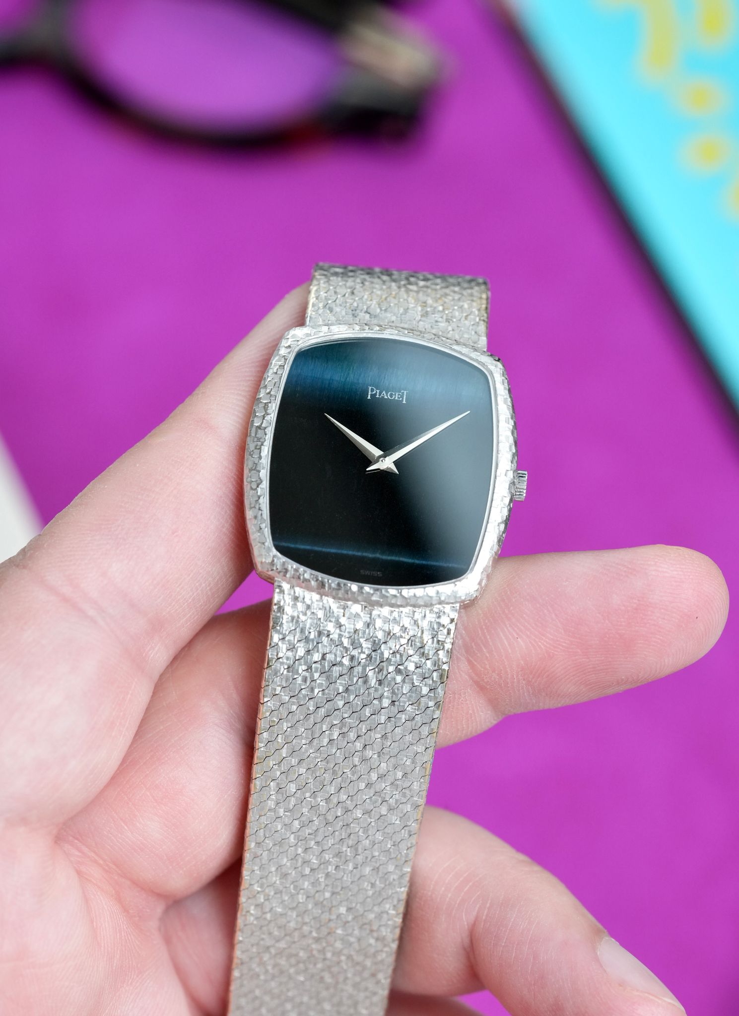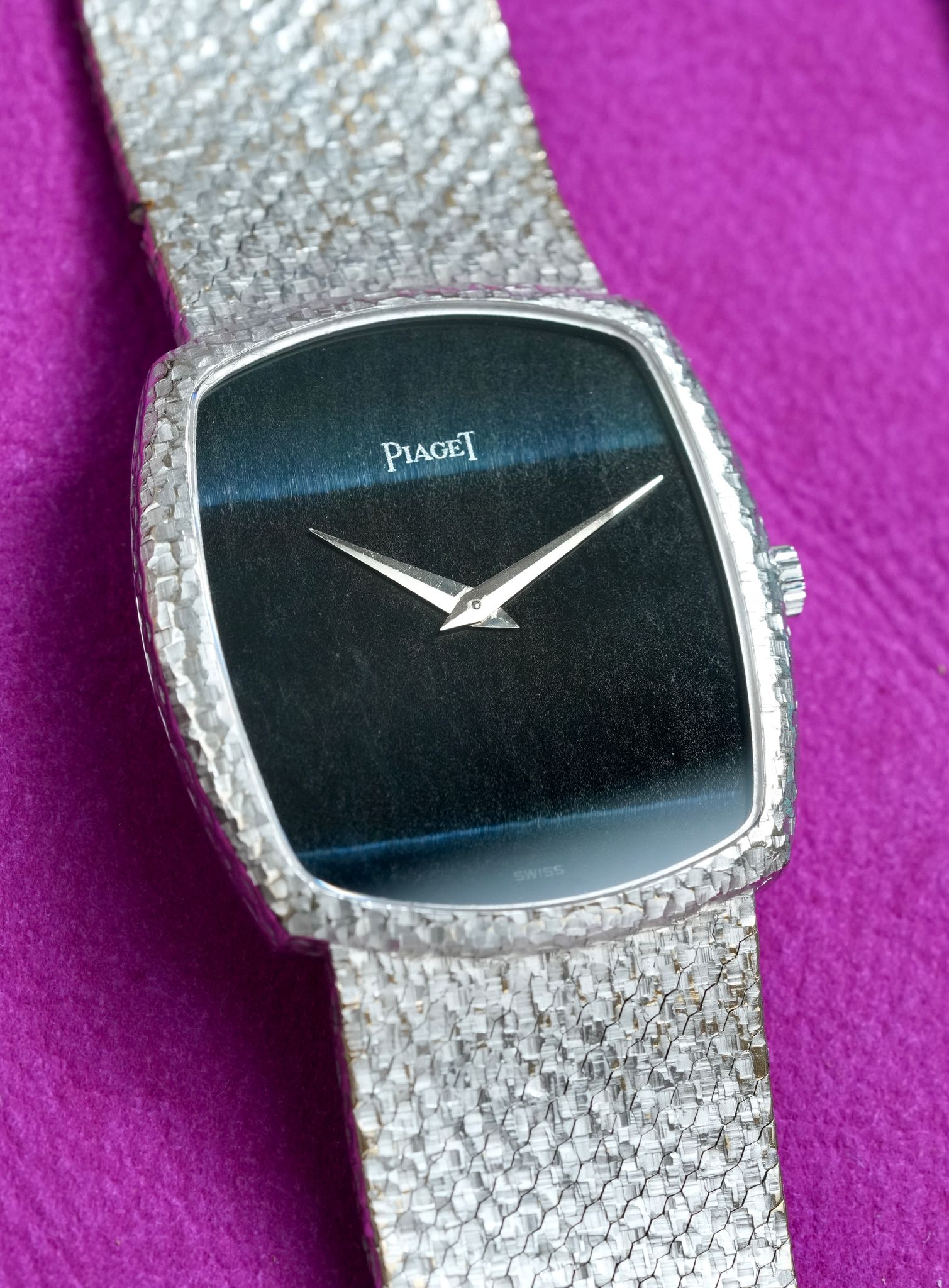 An extravagant 1980s Piaget bracelet watch in 18K white gold with one of the rarest cuts of stone that the maison ever utilized, this dial completely hewn from one solid piece of Falcon Eye, a blue derivative of Tiger Eye, in a 33mm x 31mm case, dauphine hands, signed crown, all in 95 grams of hammer finished gold from top to bottom, powered by the ultra thin manually wound Piaget caliber 9P.