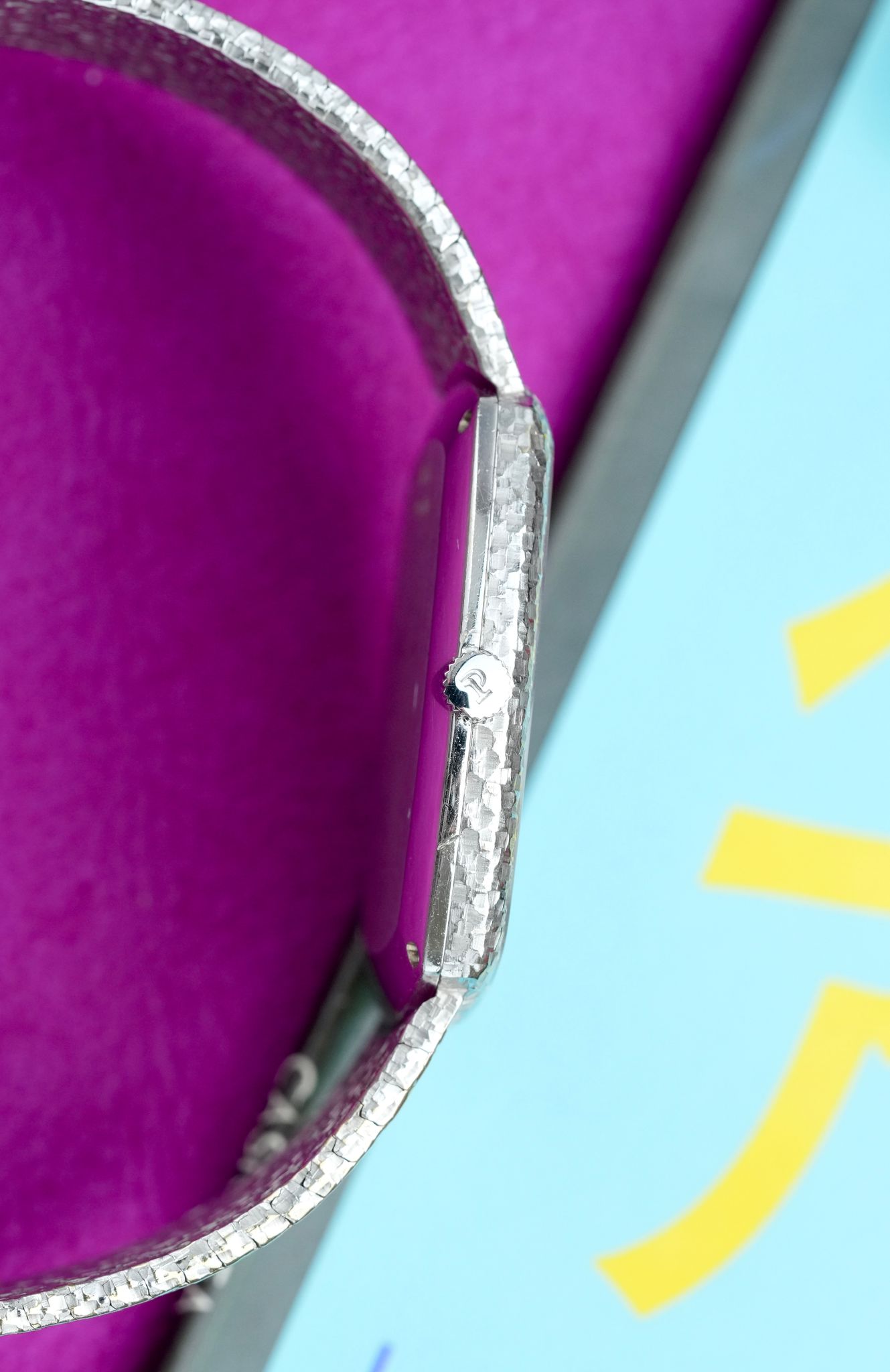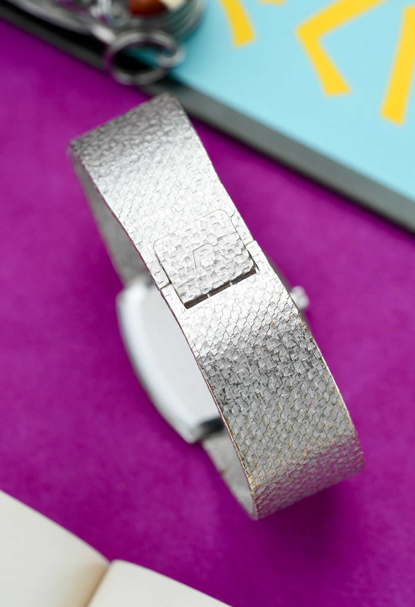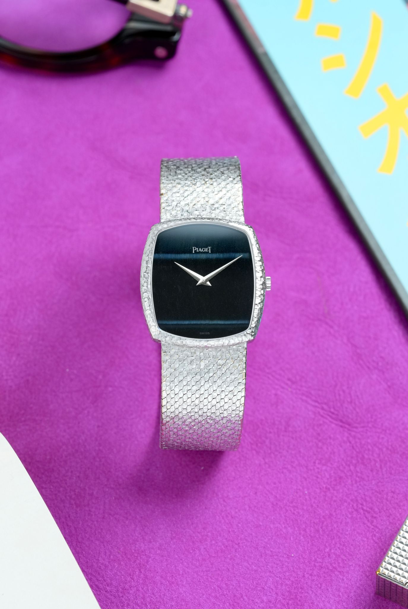 An extravagant 1980s Piaget bracelet watch in 18K white gold with one of the rarest cuts of stone that the maison ever utilized, this dial completely hewn from one solid piece of Falcon Eye, a blue derivative of Tiger Eye, in a 33mm x 31mm case, dauphine hands, signed crown, all in 95 grams of hammer finished gold from top to bottom, powered by the ultra thin manually wound Piaget caliber 9P.