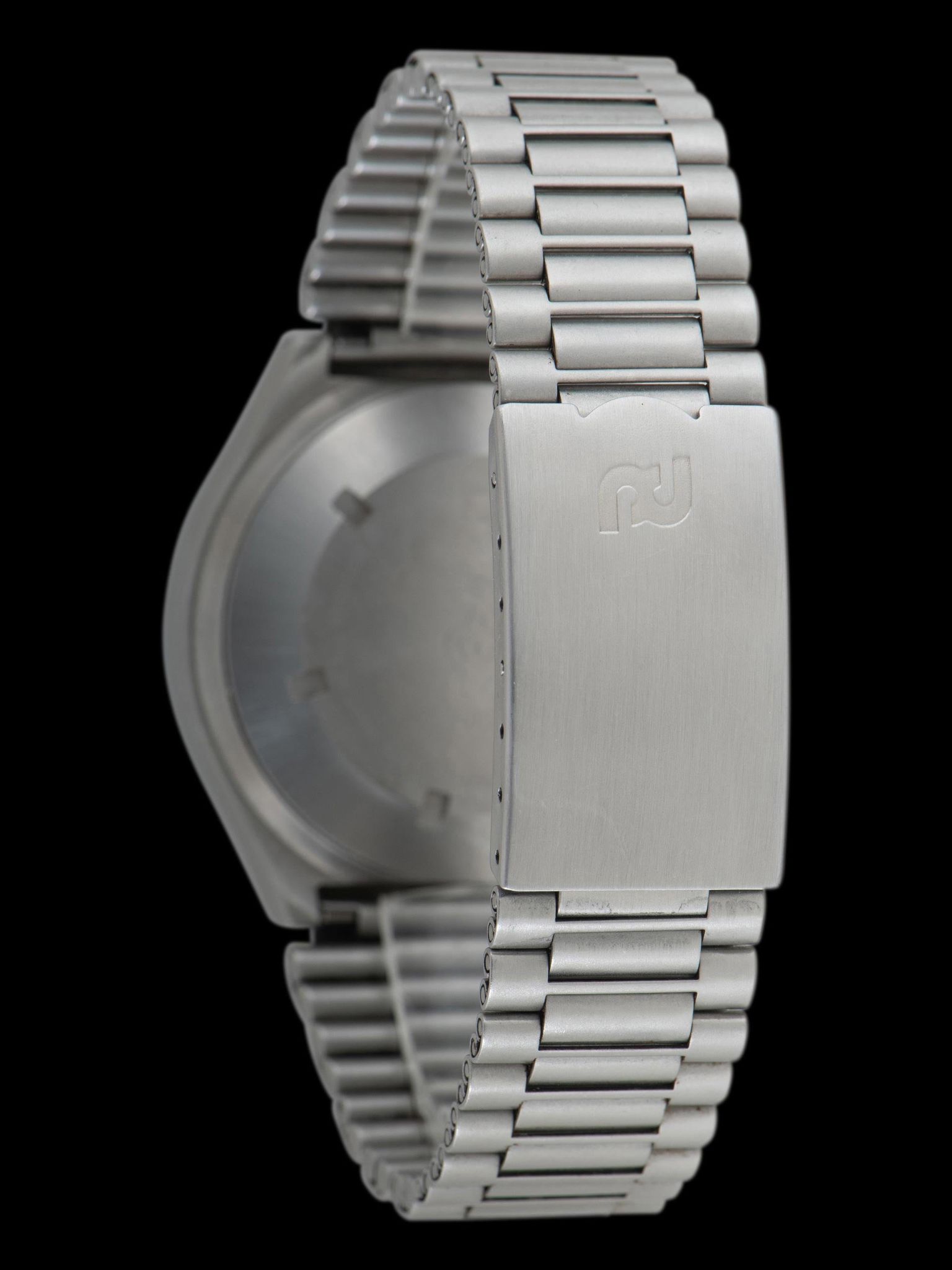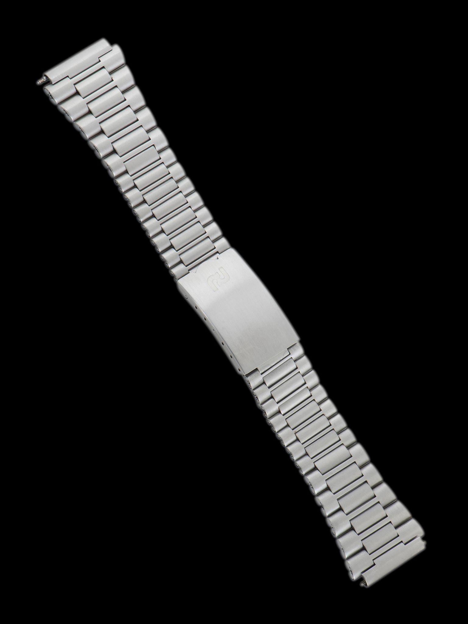 The case is in excellent condition and mostly retains its antireflective brushed finishing —with a slight polish on the top of the bezel near the crystal edge— with nominal signs of previous use present. The case retains its original crown with the Porsche Design logo and pump pushers. The original mineral glass crystal does exhibit some minor wear and faint scratches. The unpolished case back is in excellent condition, showing all of its original factory engravings. The watch comes supplied with its original Porsche Design stainless steel bracelet, which is in impressive condition and retains 24 links that show almost no stretch and will fit up to a 7 1/2-inch wrist.