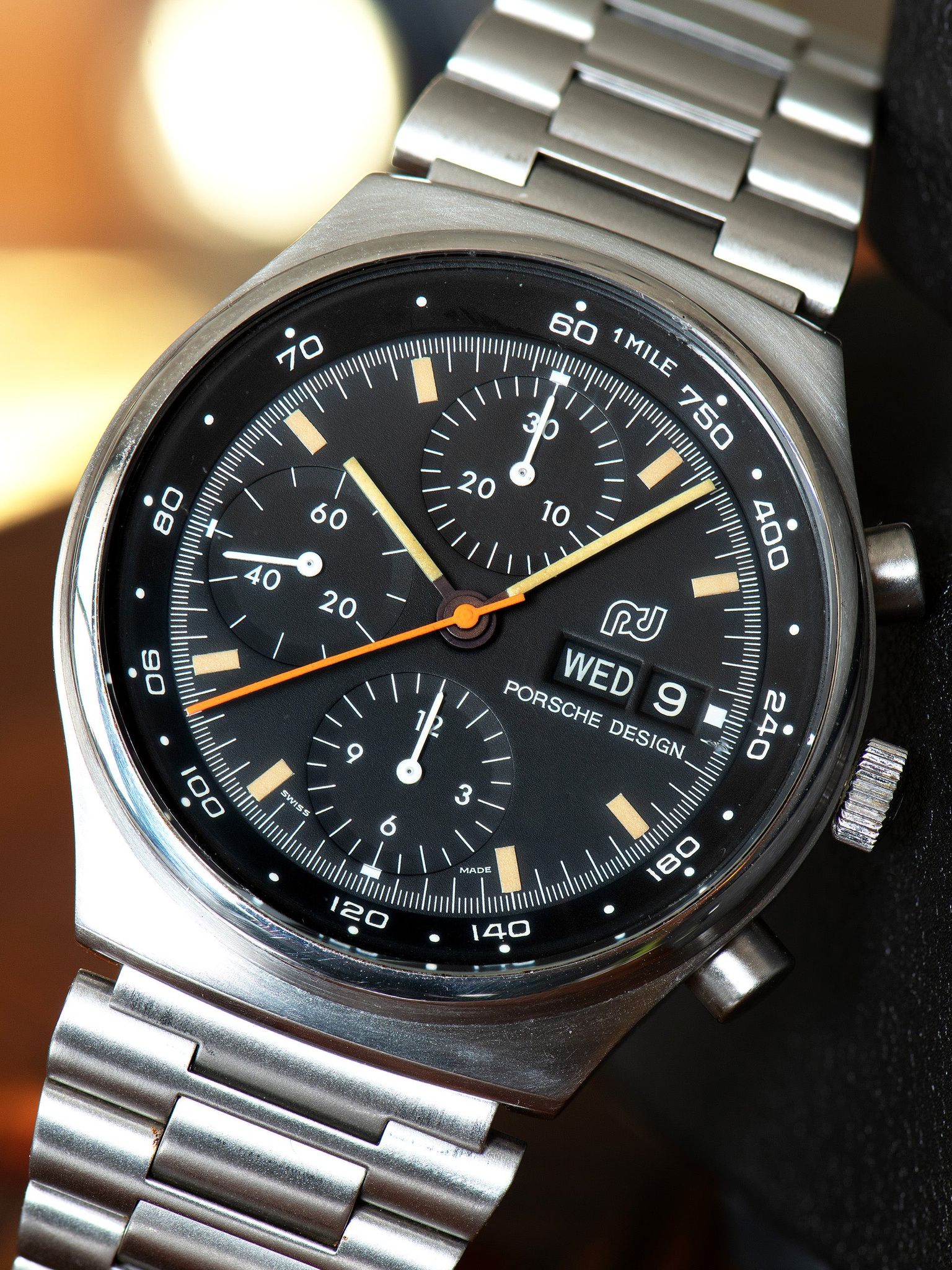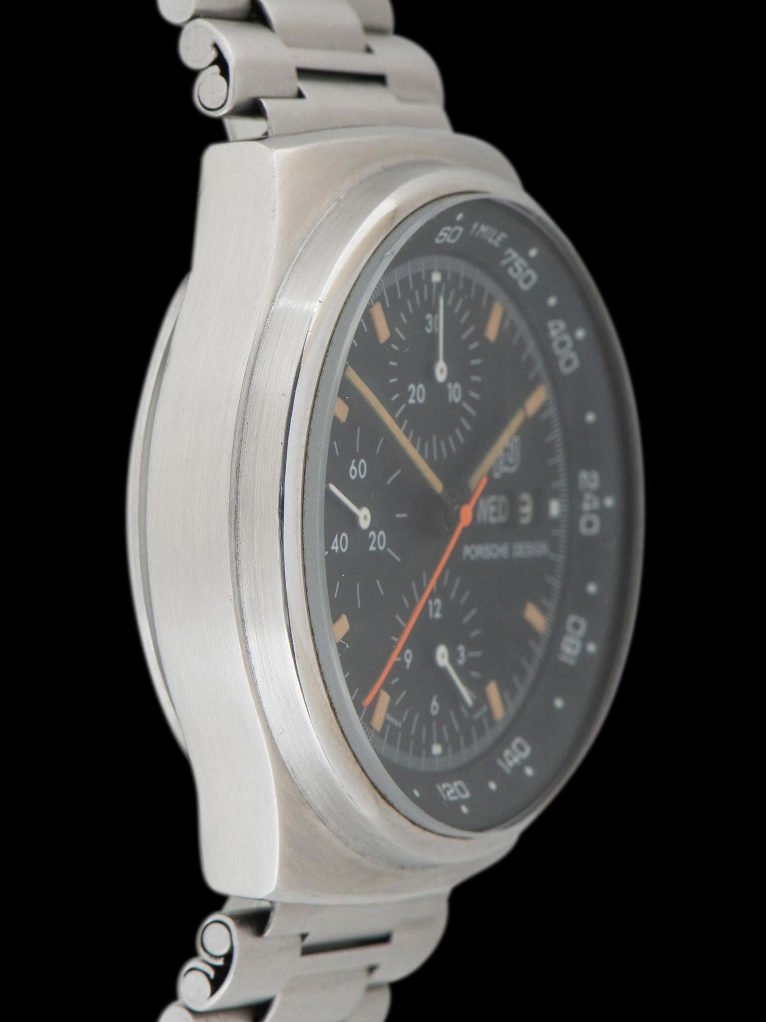 And what a beautiful example this is, featuring a 40mm case with a screw-down case back, mineral crystal, Internal tachymeter bezel, and black dial with tritium luminous indexes. It's especially rare to find one like this, with its original bracelet, the case fully intact and unpolished (with the exception of the very top of the bezel, which was lightly polished), and featuring its original finish. This is a clean example with dial and hand lume that have aged to a vintage-perfect dark pumpkin coloration—and an especially perfect way to get into Porsche Design for anyone who likes stainless steel finishes over PVD black ones.