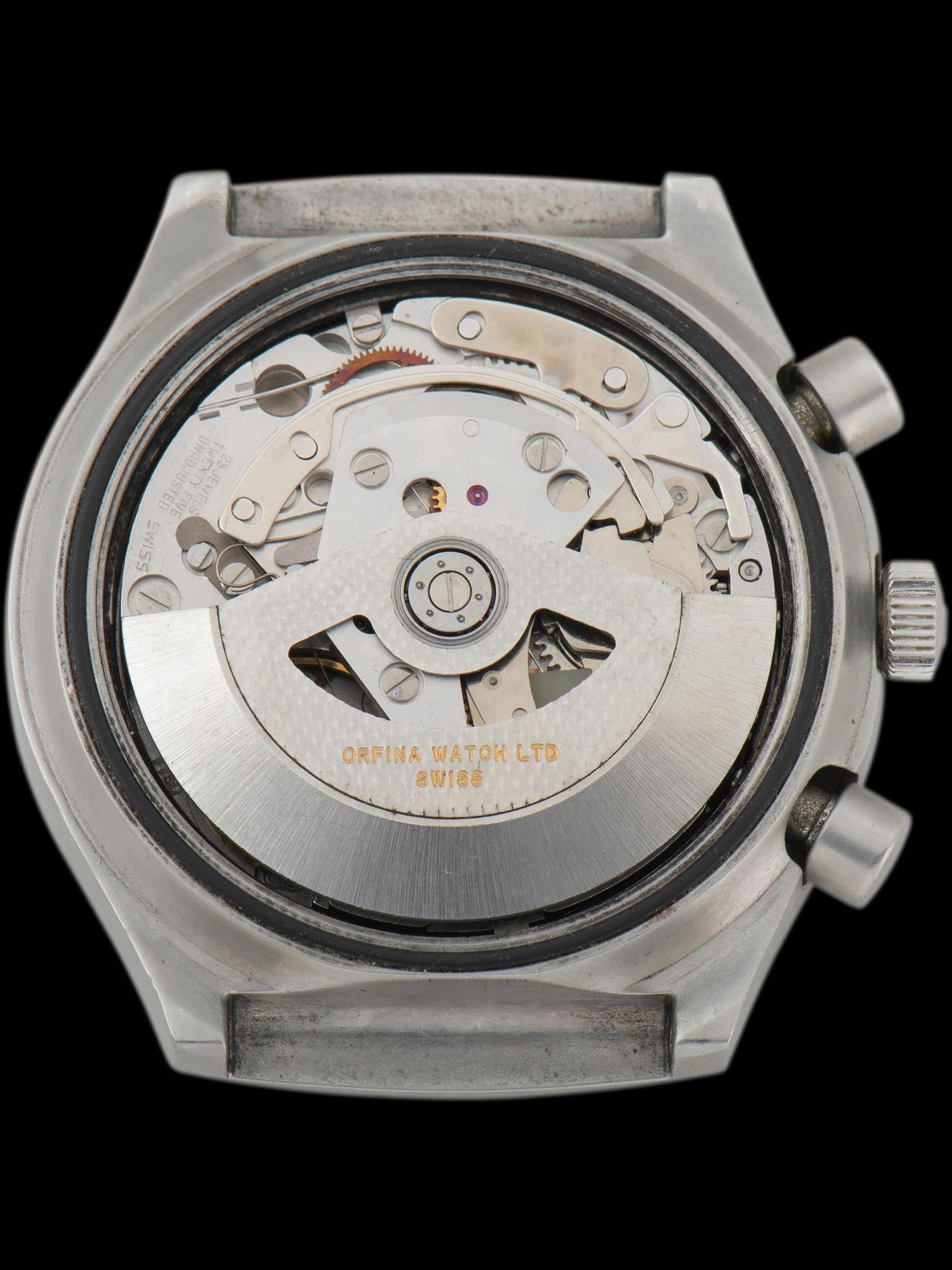 The watches utilized the automatic day-date chronograph Valjoux 7750 movement which, from a complication perspective, packs a mighty punch. Orfina produced these references in stainless steel with two finishes. A black PVD variant like the one seen on Maverick's wrist, and a bead-blasted anti-reflective stainless steel like we have here.