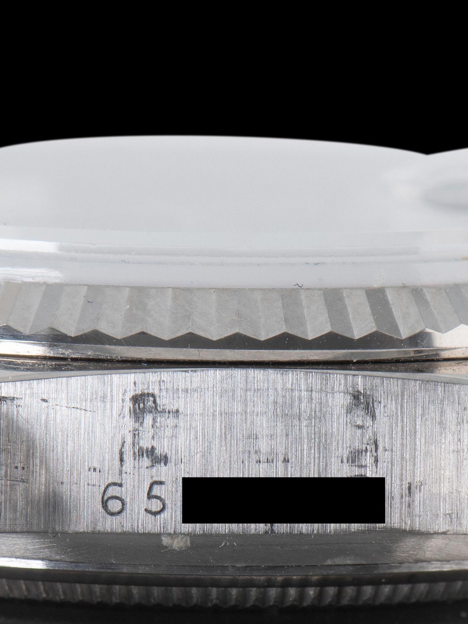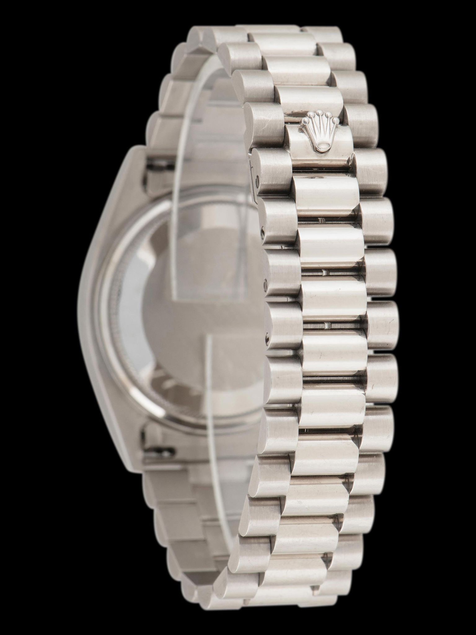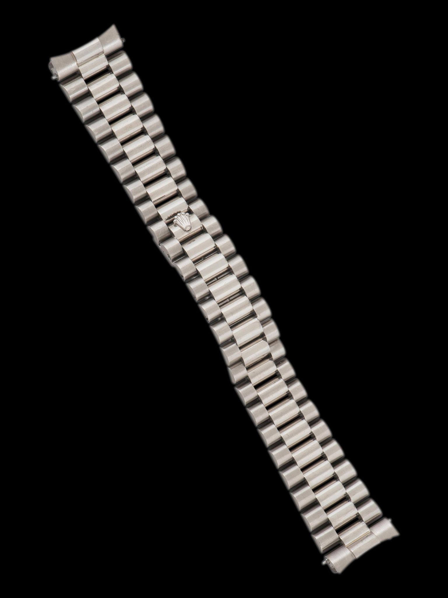 The 18K white gold case remains remarkably well-preserved, showing extremely crisp edges with thick dimensions throughout. The 18K white gold fluted bezel also remains in excellent condition, displaying sharp angles and edges, with no notable wear present. The case retains its original two-dot white gold twin-lock crown, which has achieved a warm color from age. The era-correct 18K white gold Rolex 8385 President bracelet dates slightly later than the watch and retains 23 links that exhibit nominal stretch and will fit up to a 7.25-inch wrist.