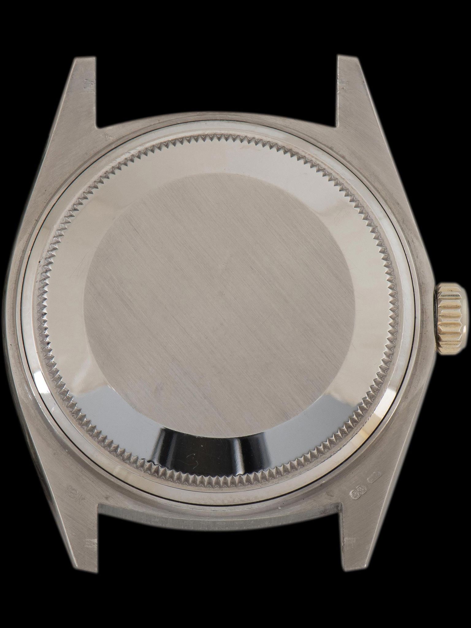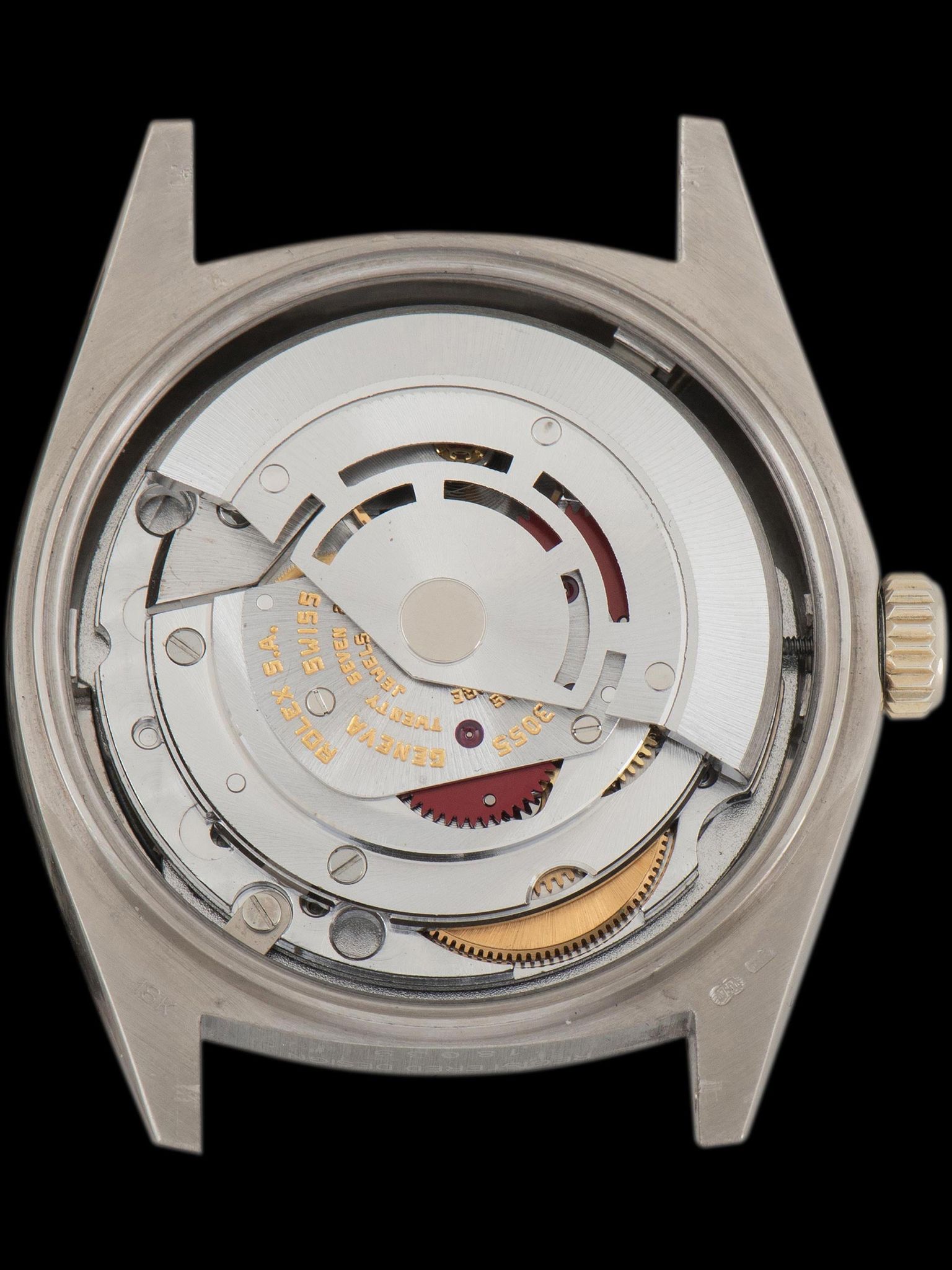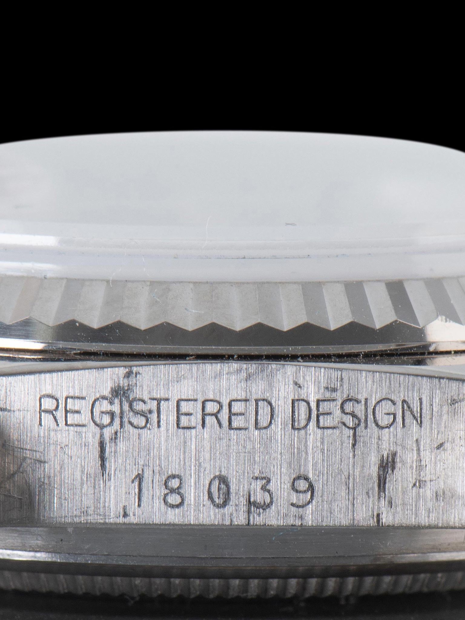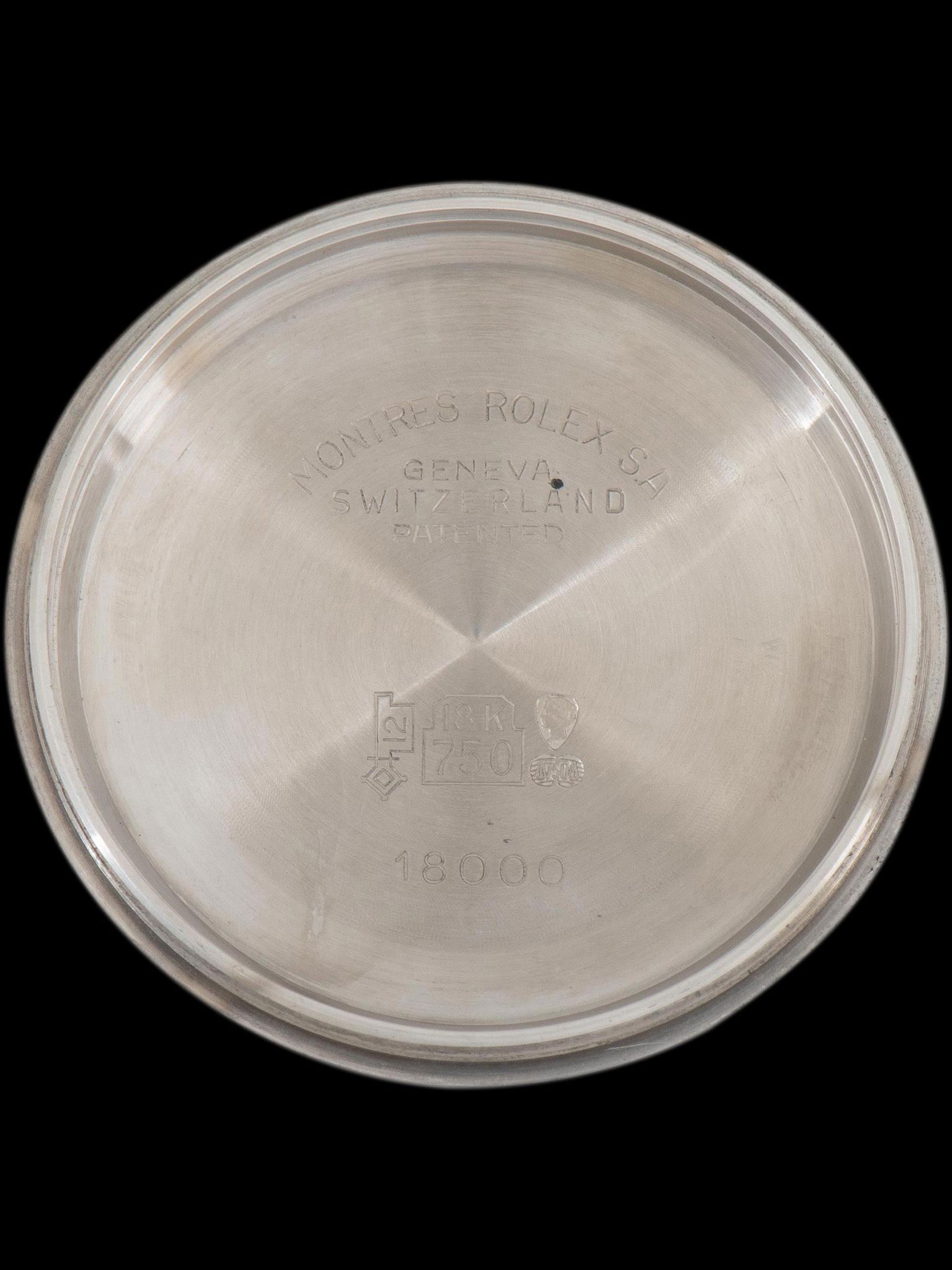 The 18K white gold case remains remarkably well-preserved, showing extremely crisp edges with thick dimensions throughout. The 18K white gold fluted bezel also remains in excellent condition, displaying sharp angles and edges, with no notable wear present. The case retains its original two-dot white gold twin-lock crown, which has achieved a warm color from age. The era-correct 18K white gold Rolex 8385 President bracelet dates slightly later than the watch and retains 23 links that exhibit nominal stretch and will fit up to a 7.25-inch wrist.