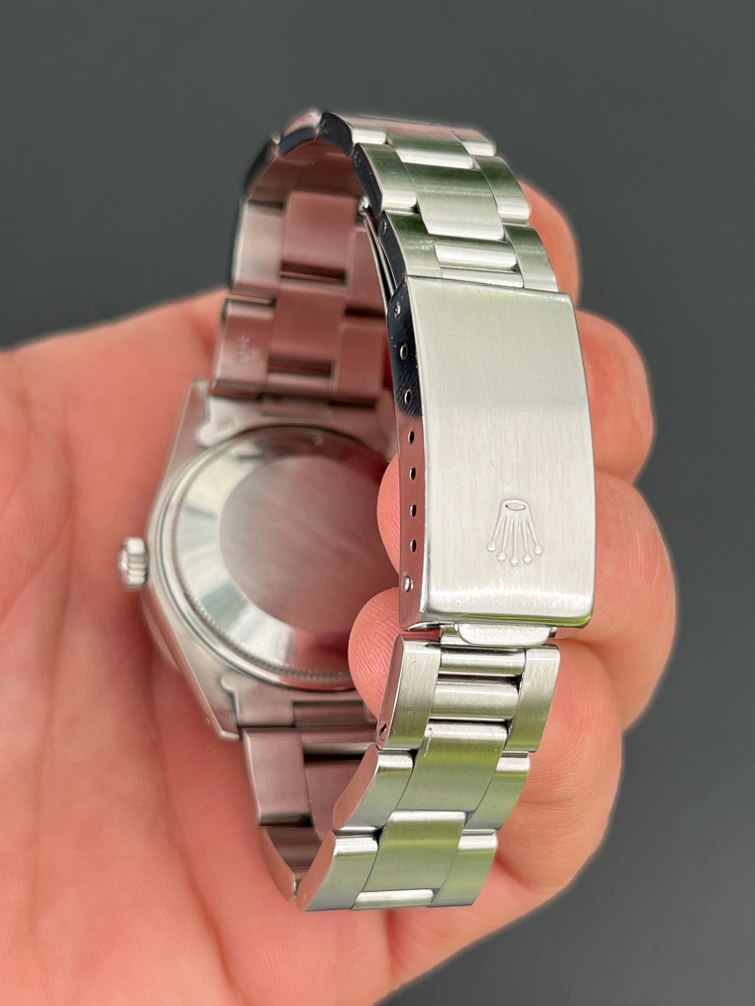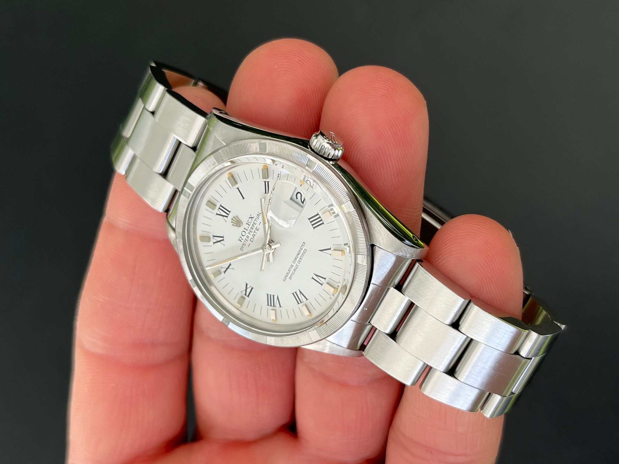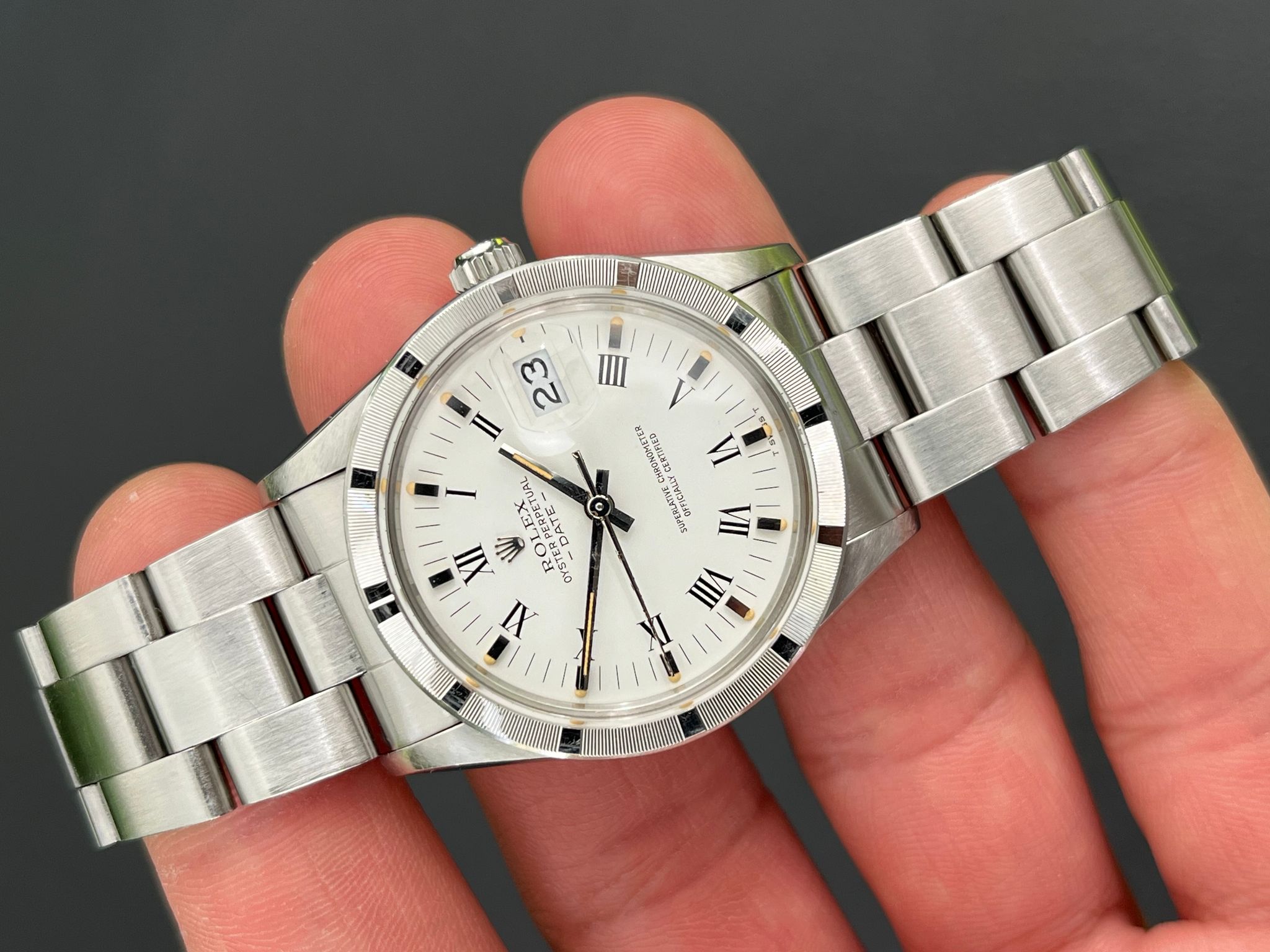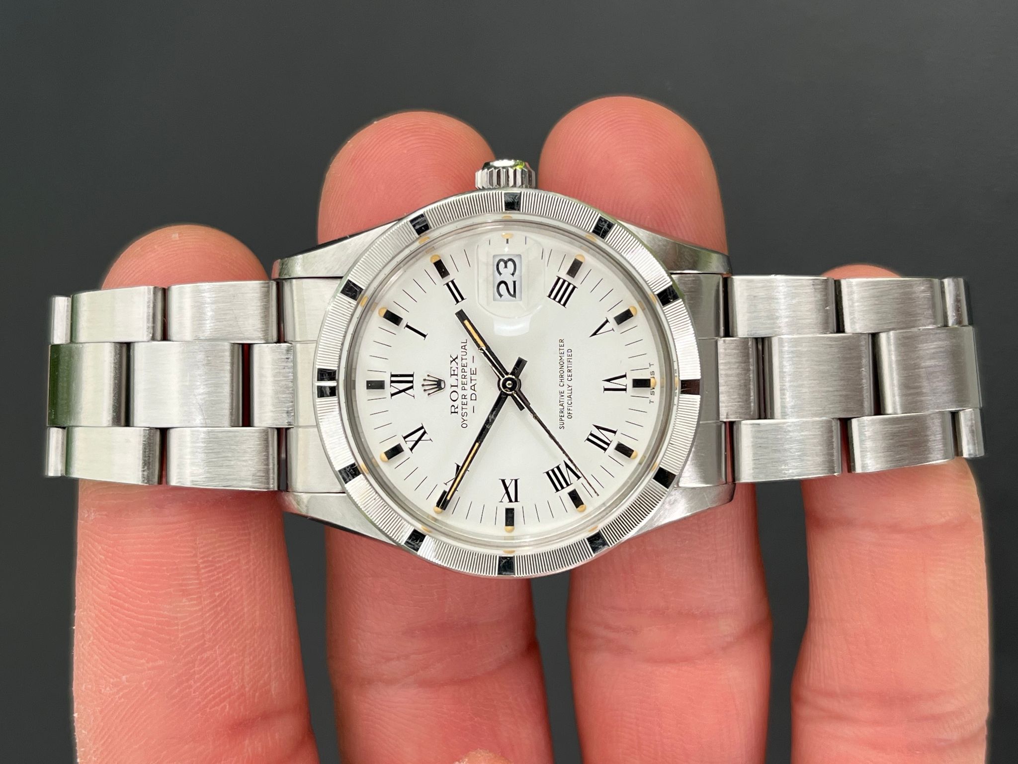 The vintage Rolex Date reference 15010 is a striking timepiece that perfectly balances classic refinement with unique character. Featuring a crisp white Roman dial, this example stands out with its beautifully aged pumpkin patina, adding warmth and depth to its aesthetic. The 34mm stainless steel case, paired with its signature engine-turned bezel, remains in excellent condition, showcasing sharp lines and minimal wear. Powered by the reliable automatic Rolex caliber 3035 movement with a quickset date function, this watch combines vintage charm with everyday practicality. A rare find in such well-preserved condition, this 15010 is a must-have for collectors who appreciate timeless design and unique patina.