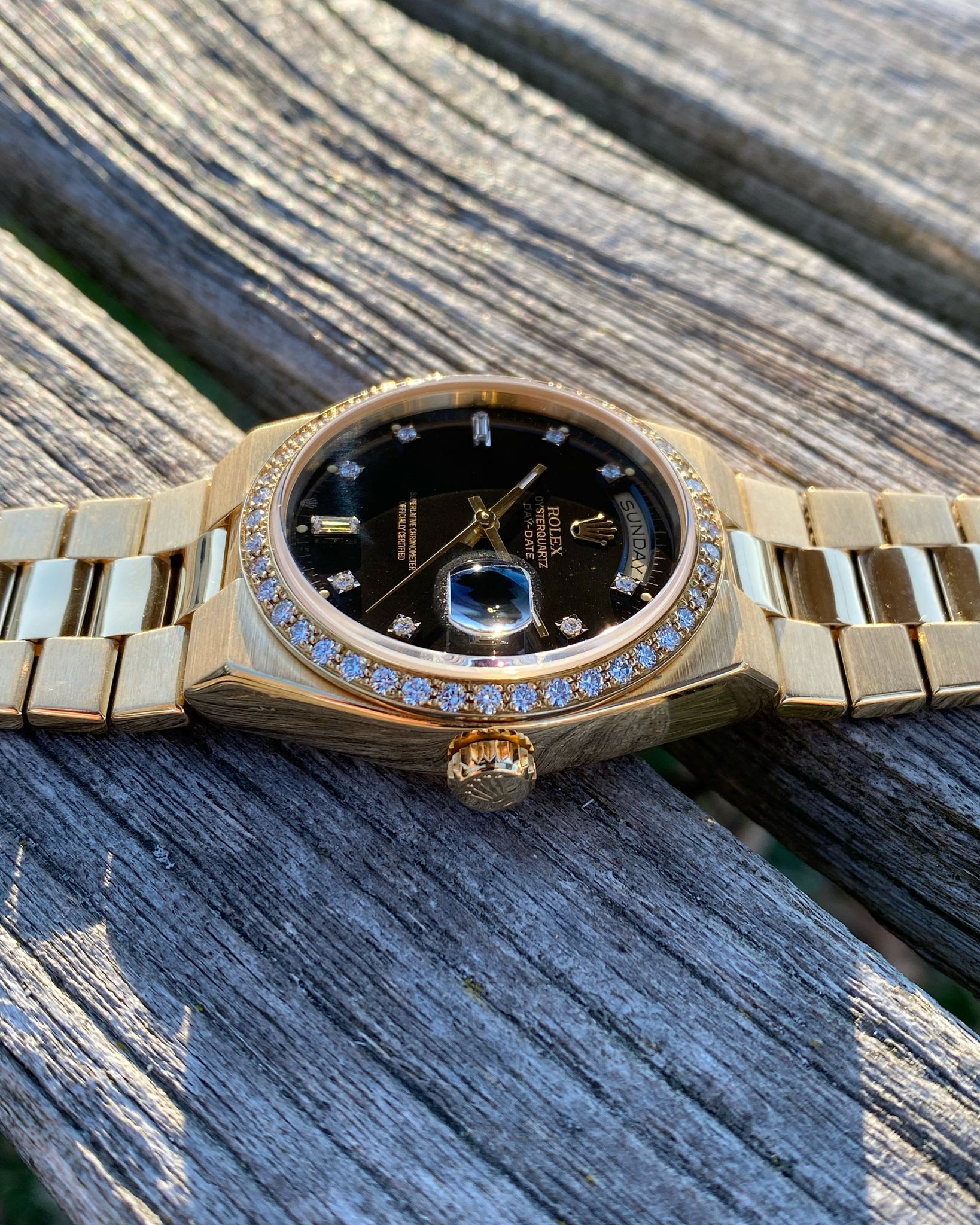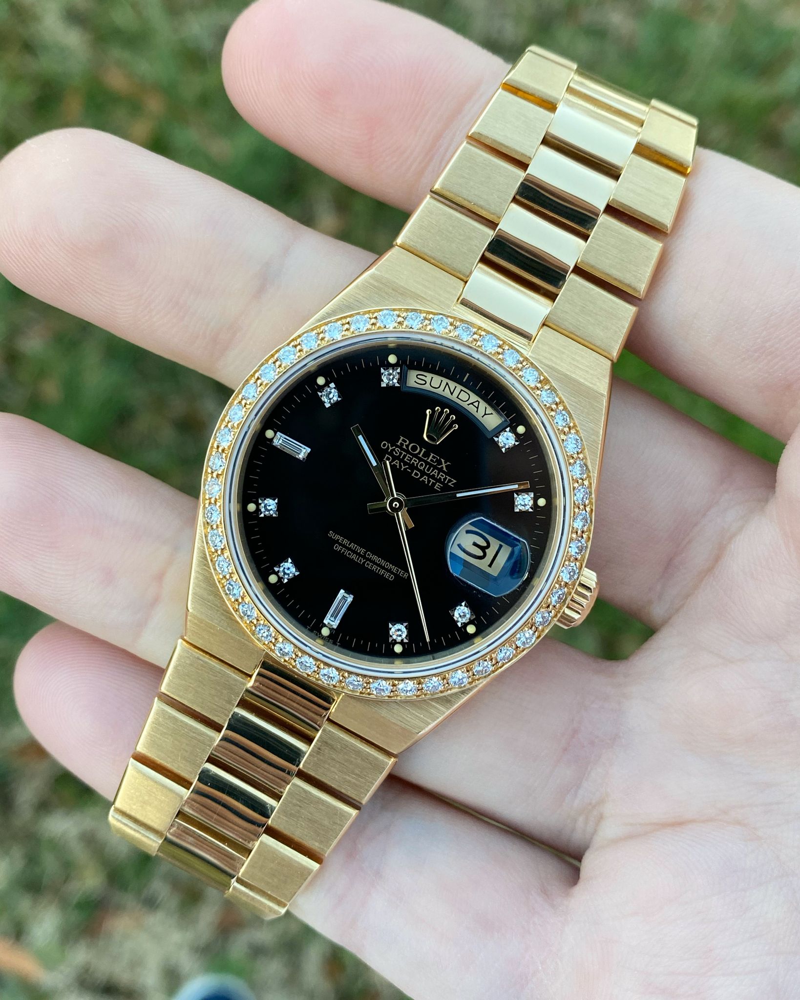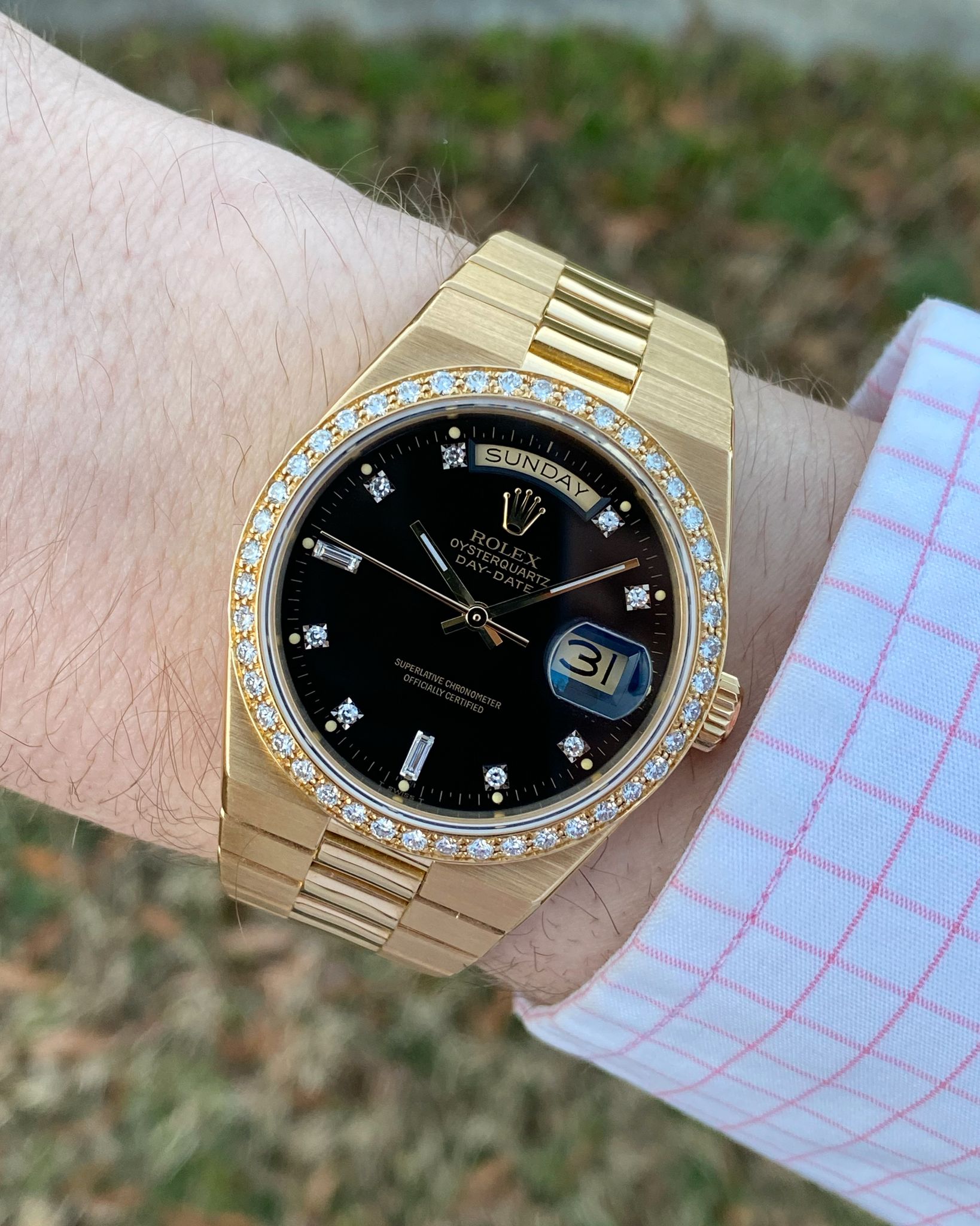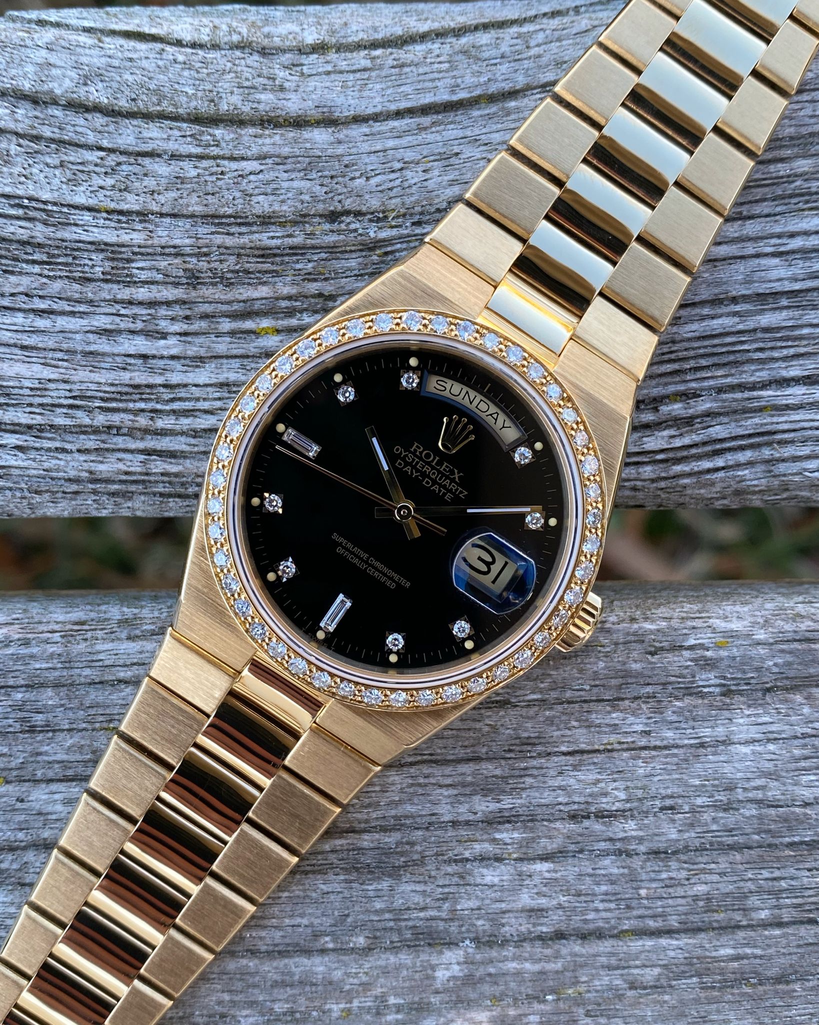 The Rolex features a brushed yellow gold case with beveled edges, accented by a factory-set diamond bezel adorned with 44 brilliant-cut diamonds. The Oysterquartz is mounted on its original integrated President bracelet, which remains fully linked with 23 full-size links (including eight screw links), and will comfortably fit a 7.3 inch wrist. The Day-Date features a black factory diamond dial with 8 brilliant-cut and 2 baguette-cut diamond hour markers, gold luminous hands, a magnified date window aperture at 3 o’clock, and a day window aperture at 12. The tritium lume plots on the dial remain flawless and have acquired an even custard-colored patina. The movement used in the 19048 is the Rolex Caliber 5055, which is under Rolex factory service warranty until December of 2026.