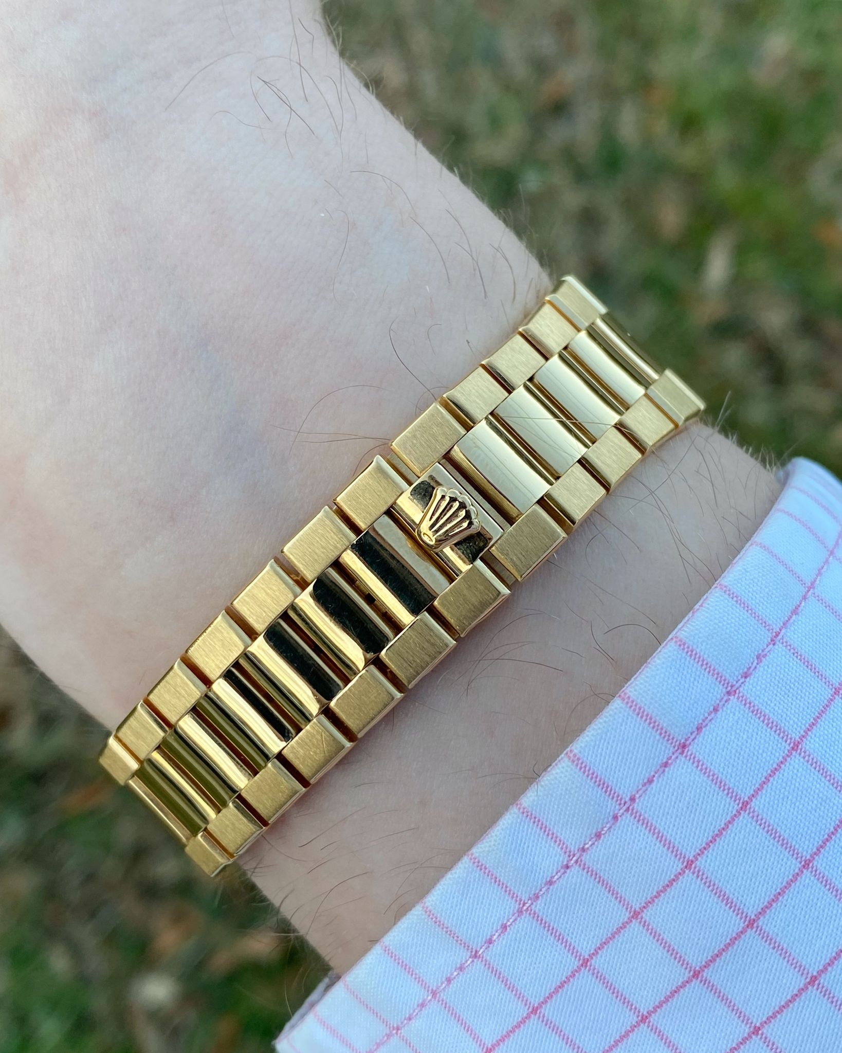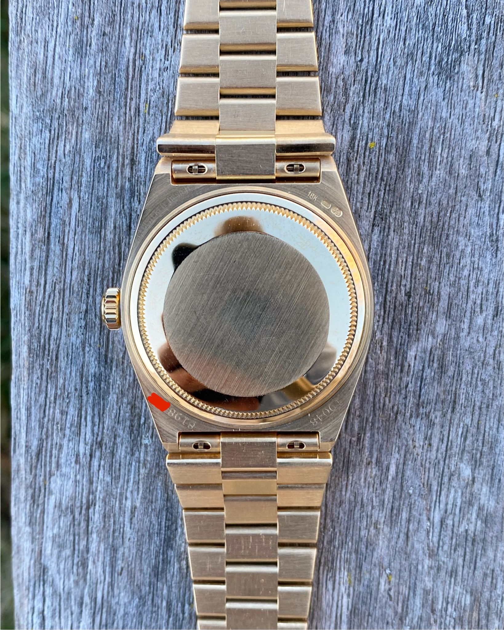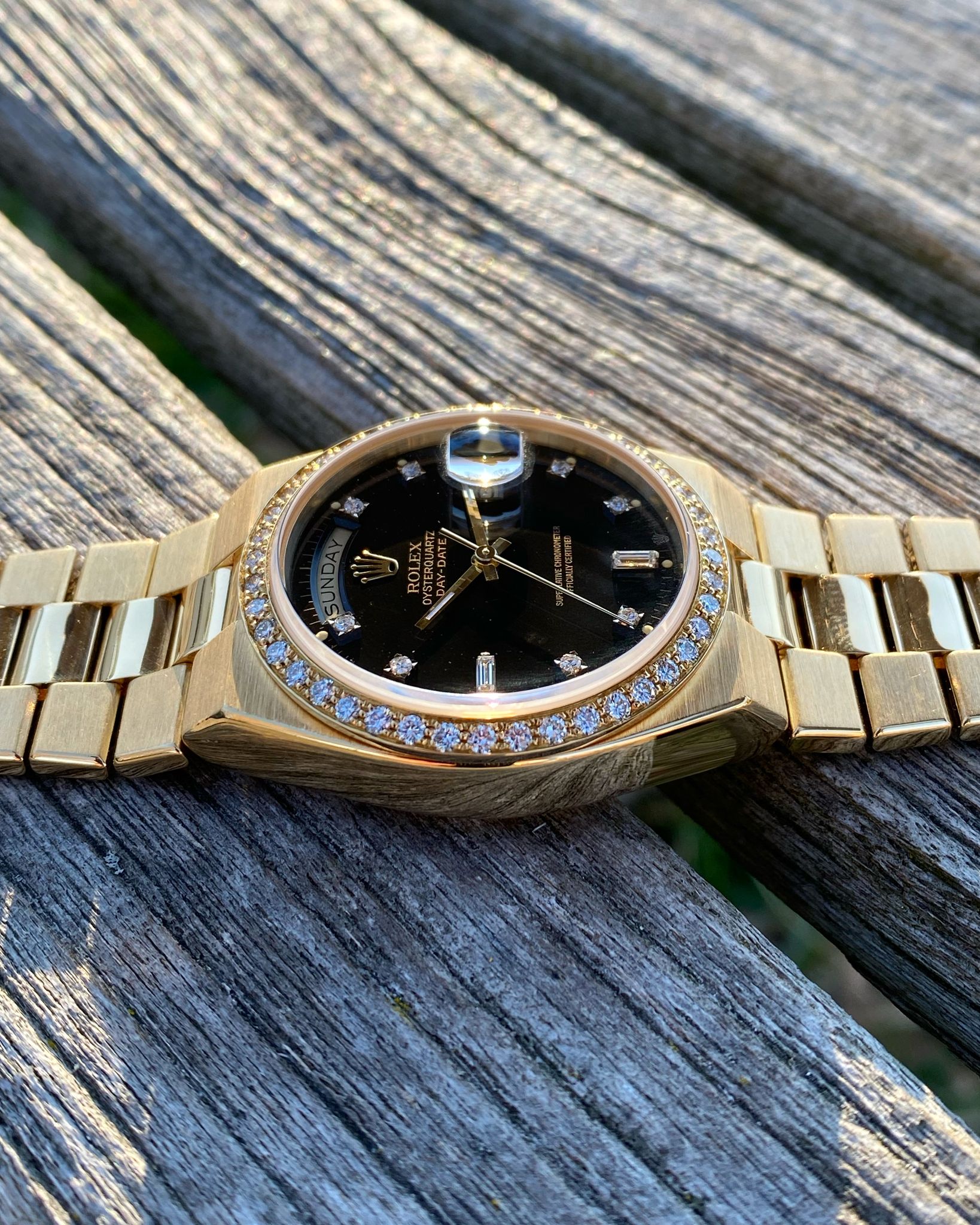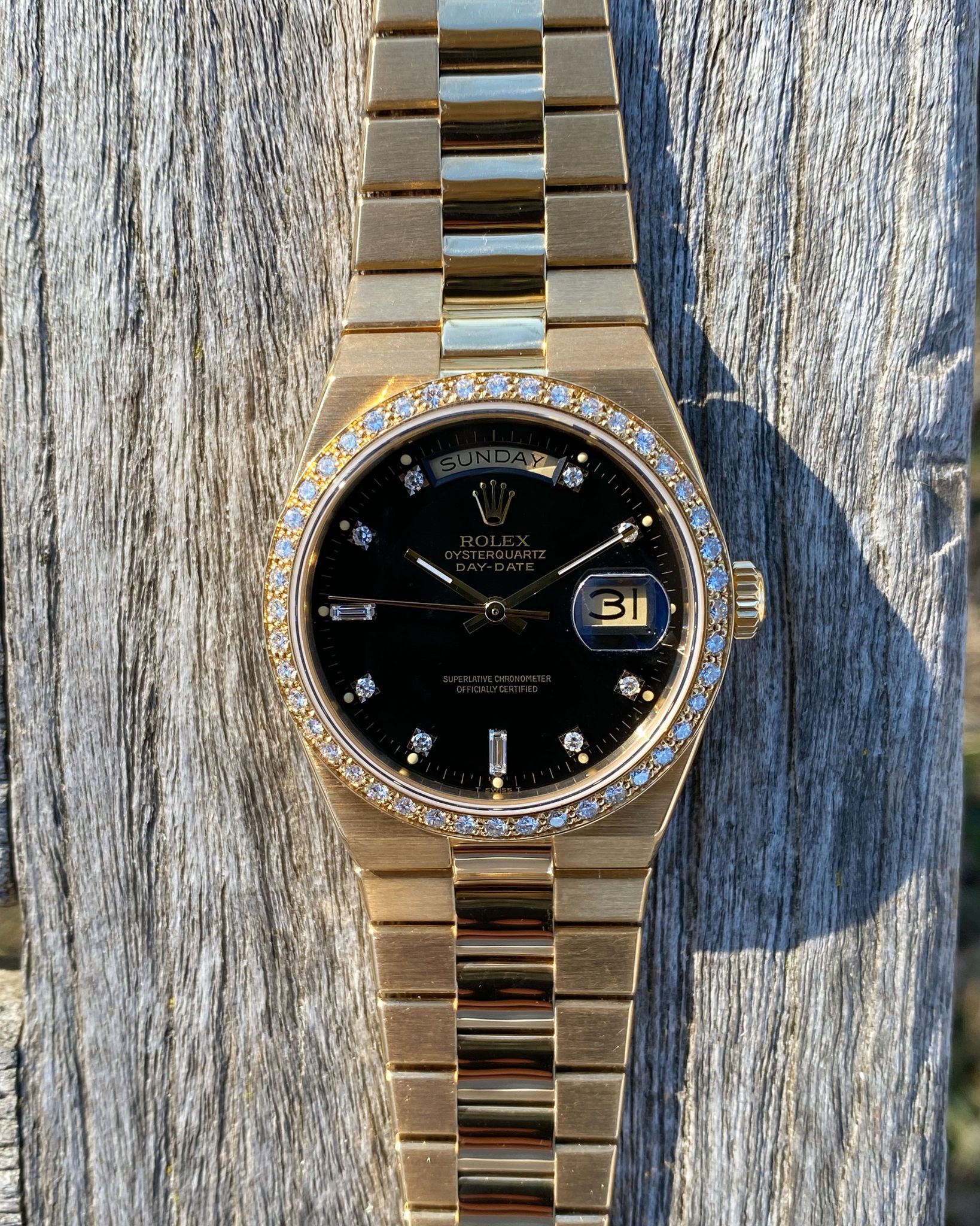The Rolex features a brushed yellow gold case with beveled edges, accented by a factory-set diamond bezel adorned with 44 brilliant-cut diamonds. The Oysterquartz is mounted on its original integrated President bracelet, which remains fully linked with 23 full-size links (including eight screw links), and will comfortably fit a 7.3 inch wrist. The Day-Date features a black factory diamond dial with 8 brilliant-cut and 2 baguette-cut diamond hour markers, gold luminous hands, a magnified date window aperture at 3 o’clock, and a day window aperture at 12. The tritium lume plots on the dial remain flawless and have acquired an even custard-colored patina. The movement used in the 19048 is the Rolex Caliber 5055, which is under Rolex factory service warranty until December of 2026.