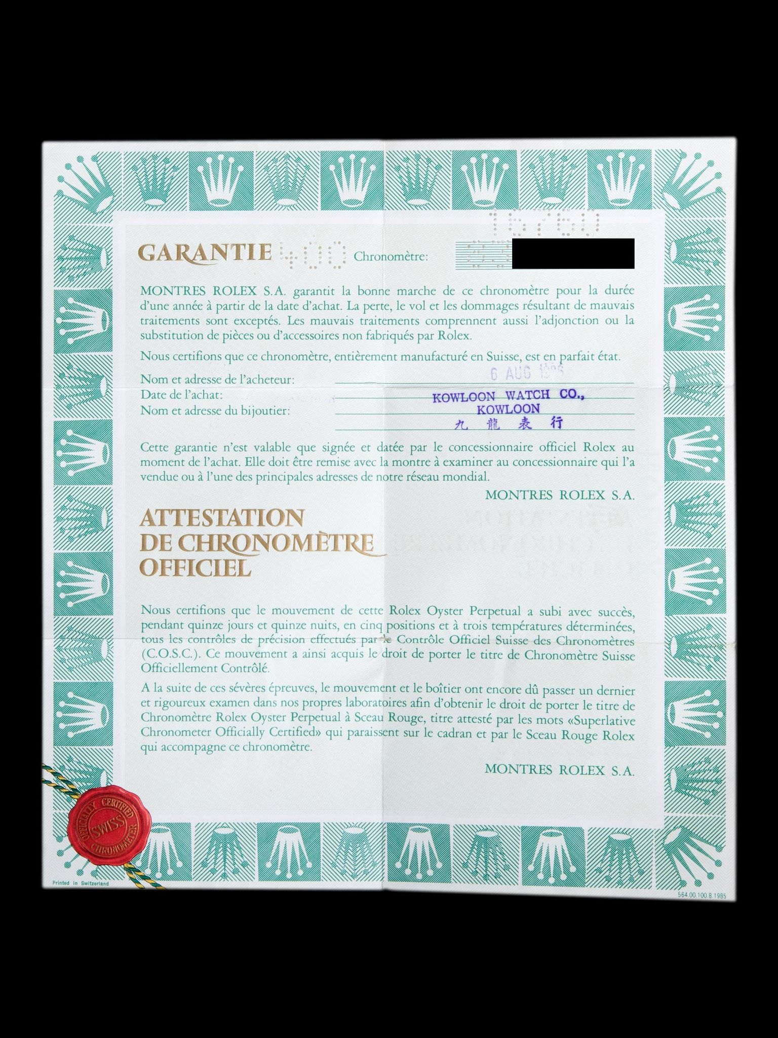 The watch comes with its original Rolex guarantee paper and 2 additional bracelet links. The watch is keeping time perfectly, backed by a 1-year warranty on accurate timekeeping.