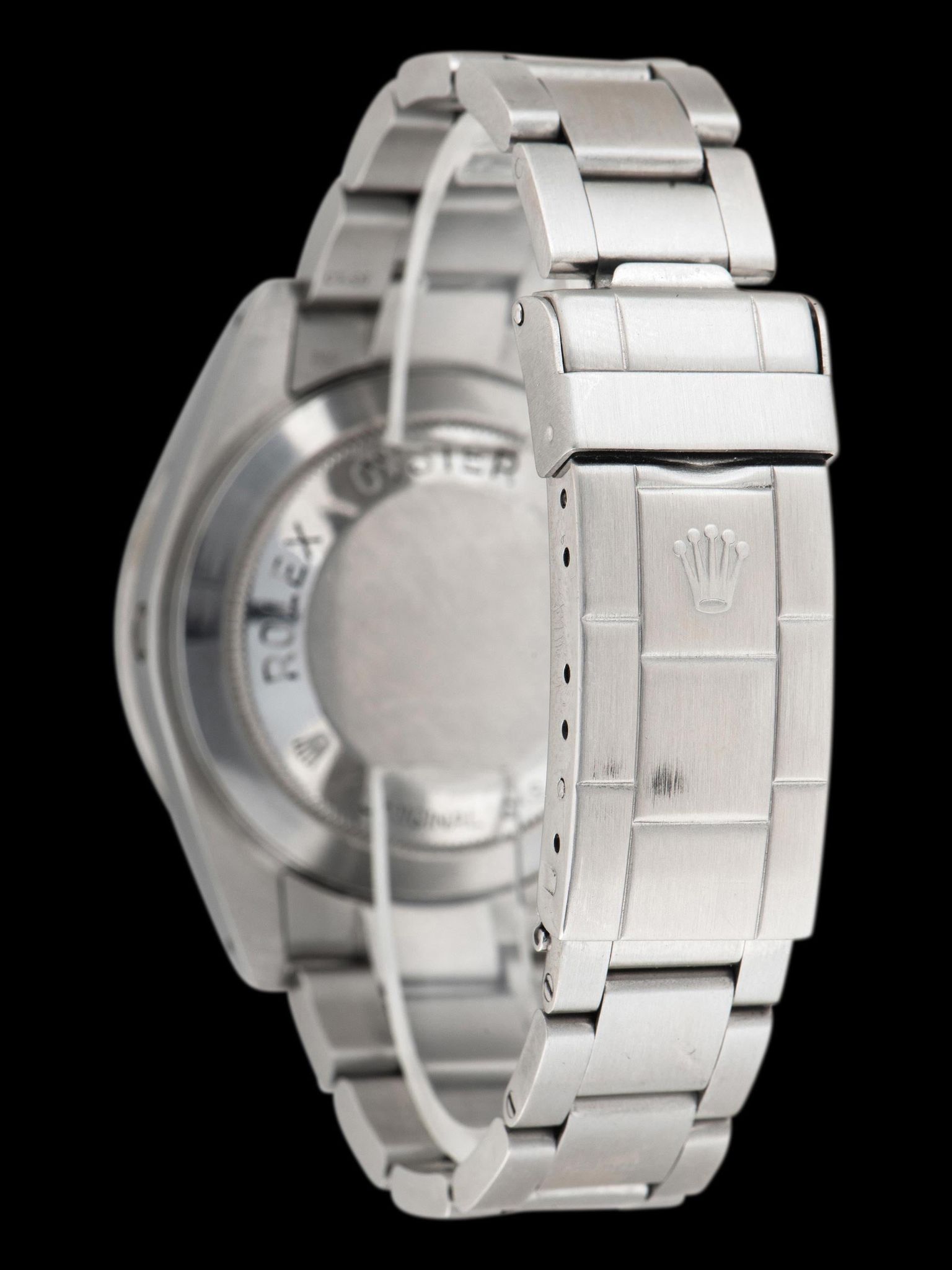 The watch is a complete set with its original inner and outer boxes, Rolex guarantee paper, Rolex service booklet, green leather Rolex wallet, Rolex anchor, and cardboard document pouch. The watch is keeping time, though the service history is unknown. A movement service can be purchased upon request.