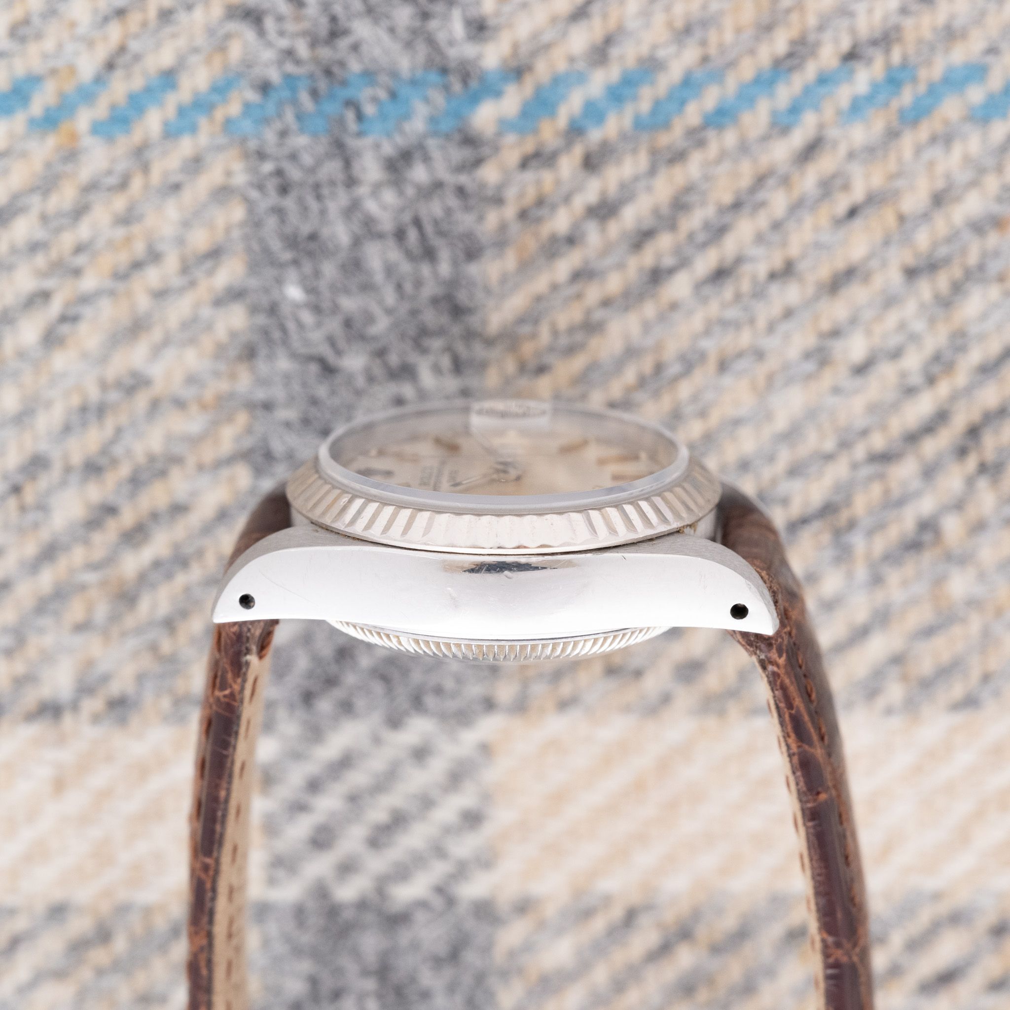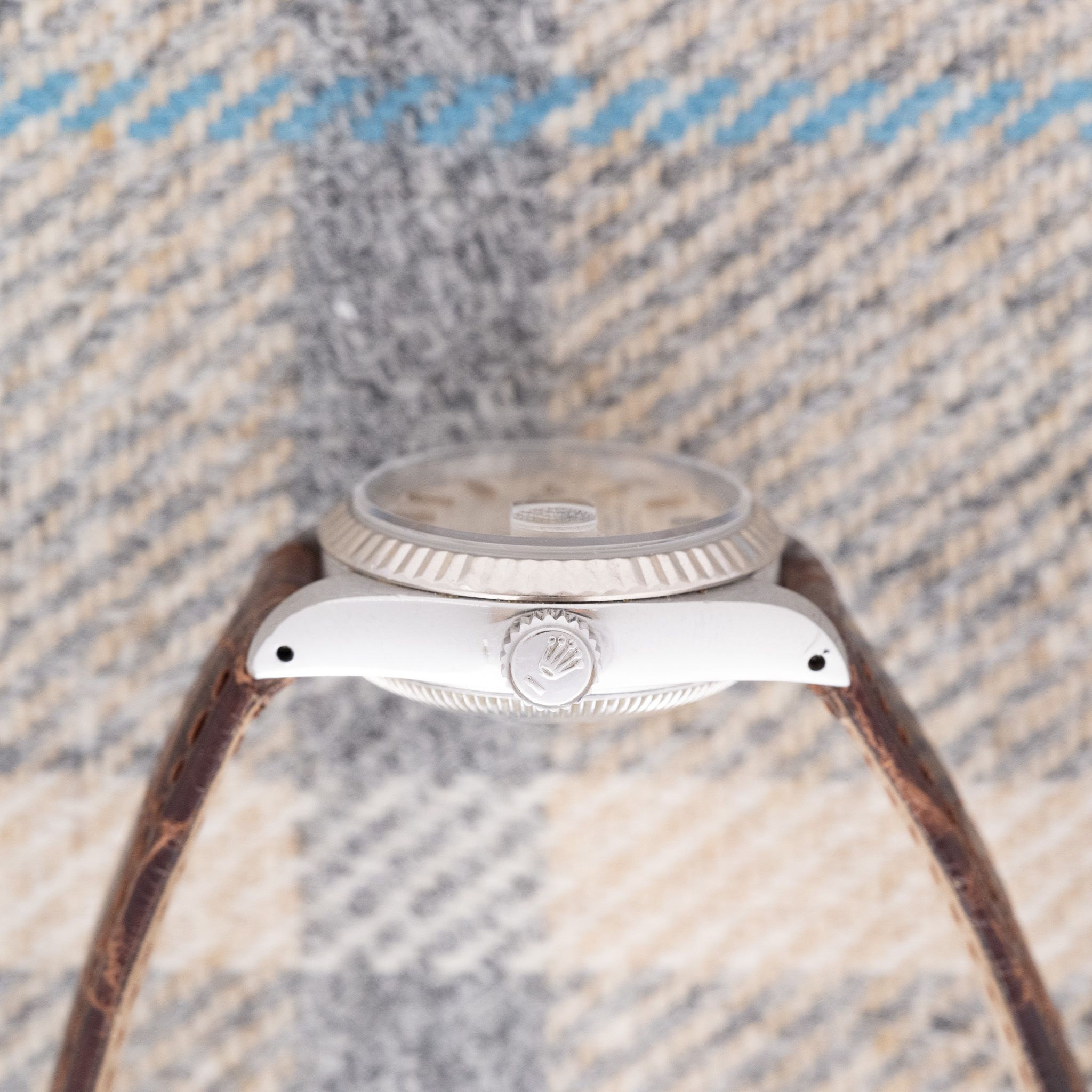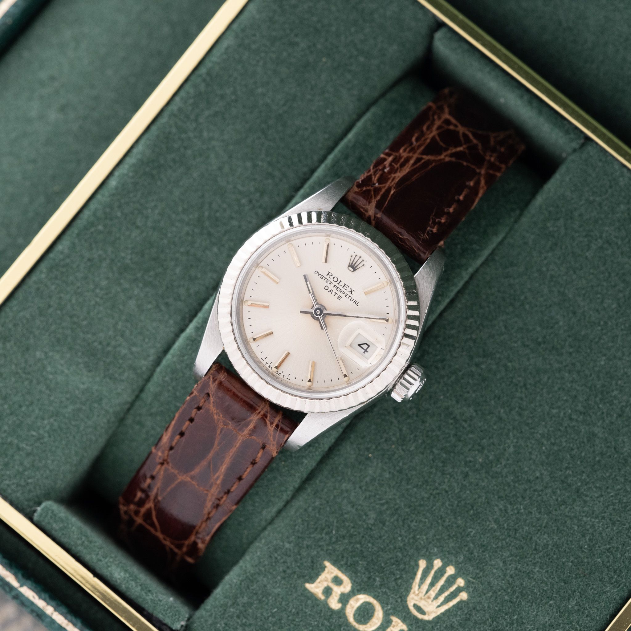 Strap & Buckle: The watch is fitted on a brown crocodile strap.