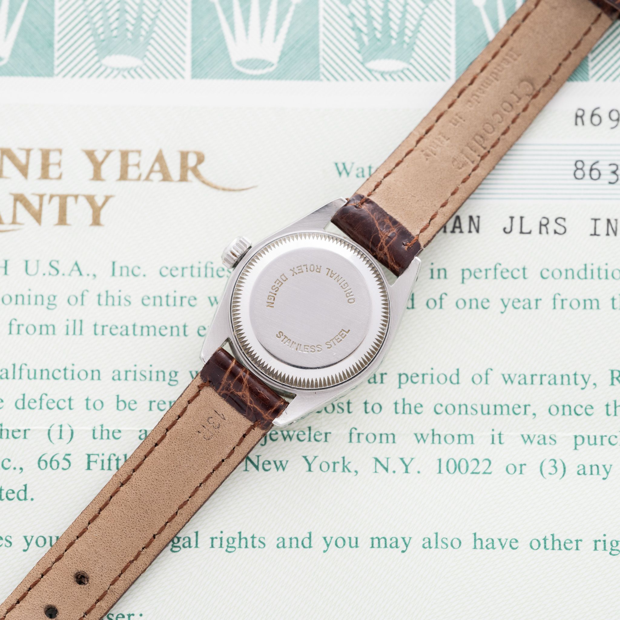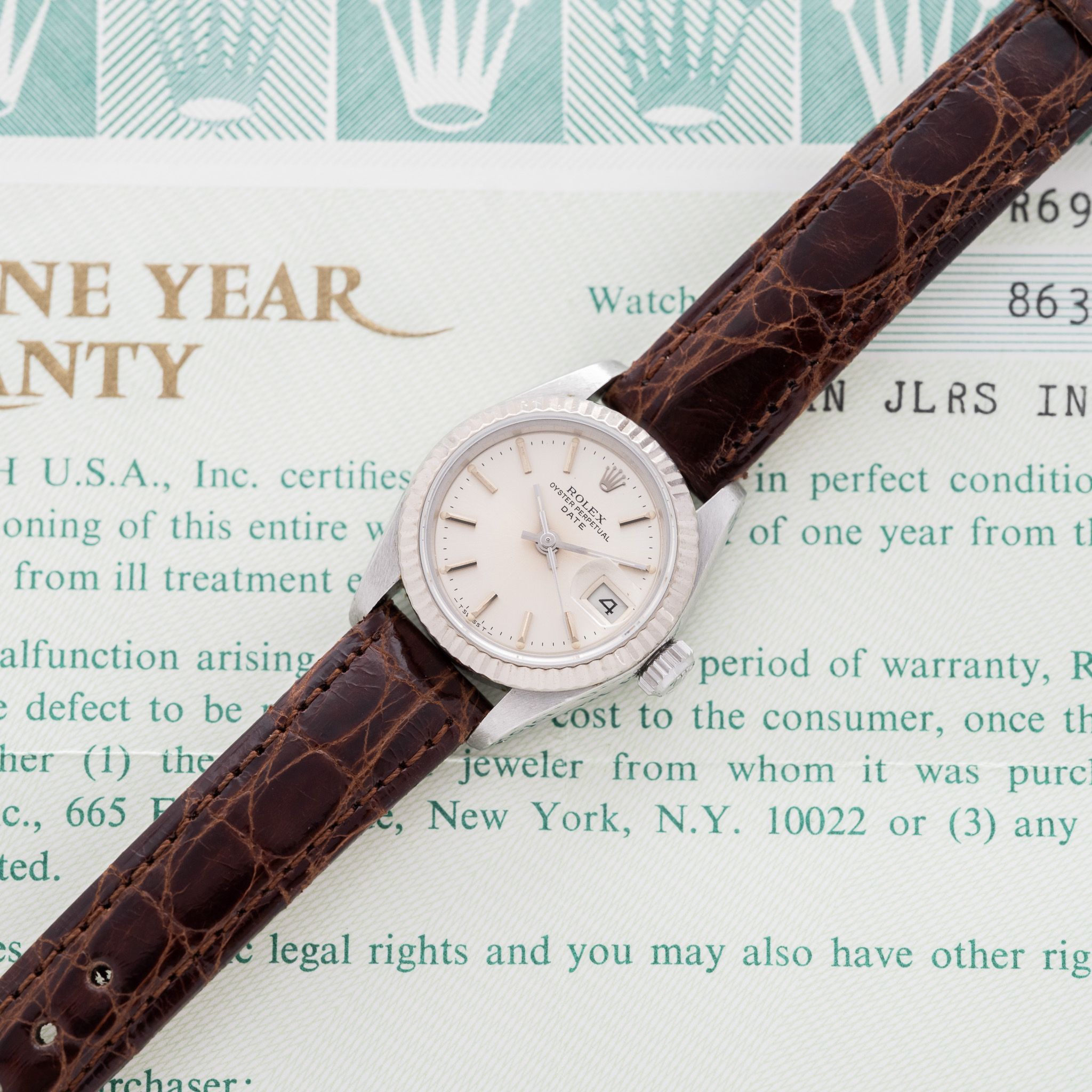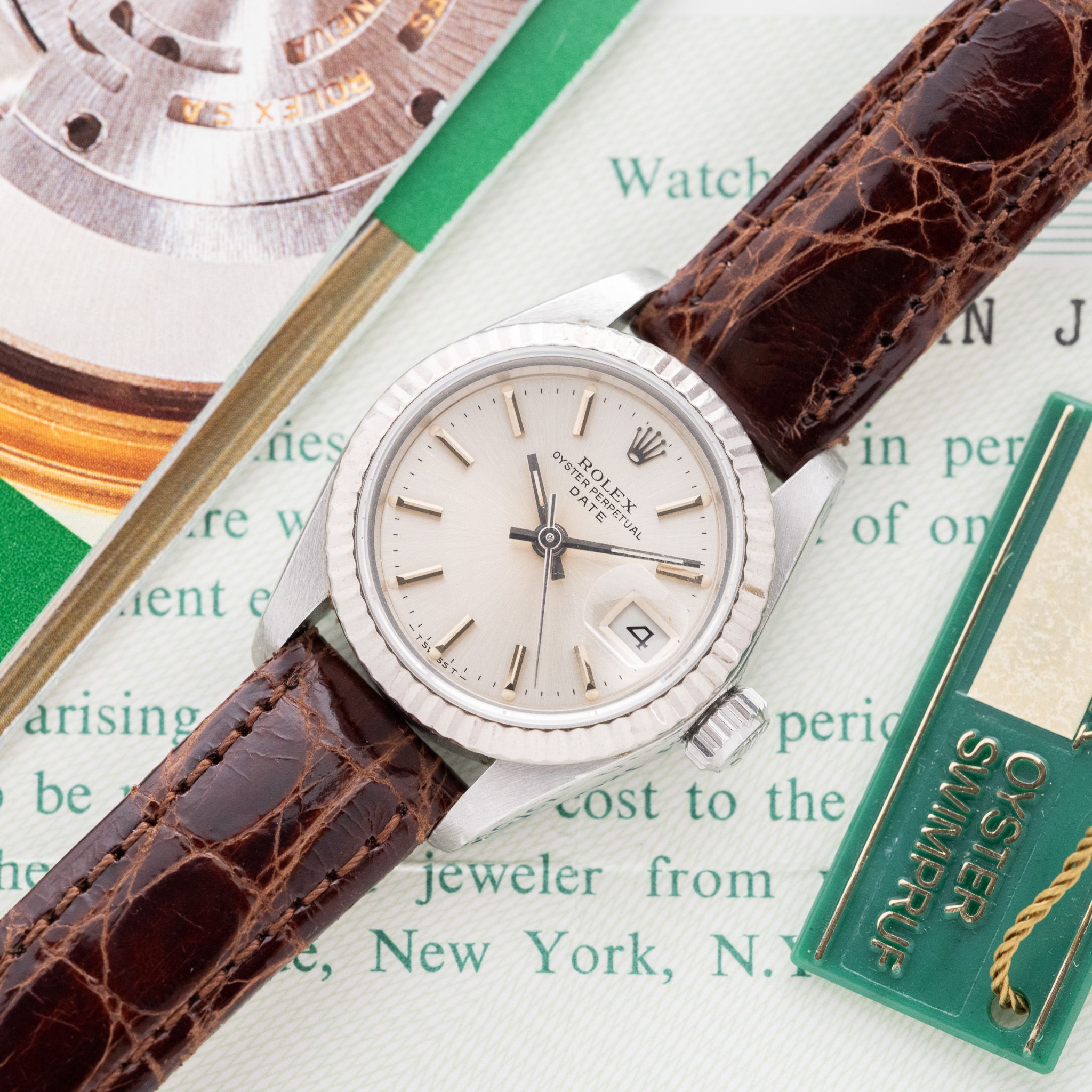 Strap & Buckle: The watch is fitted on a brown crocodile strap.