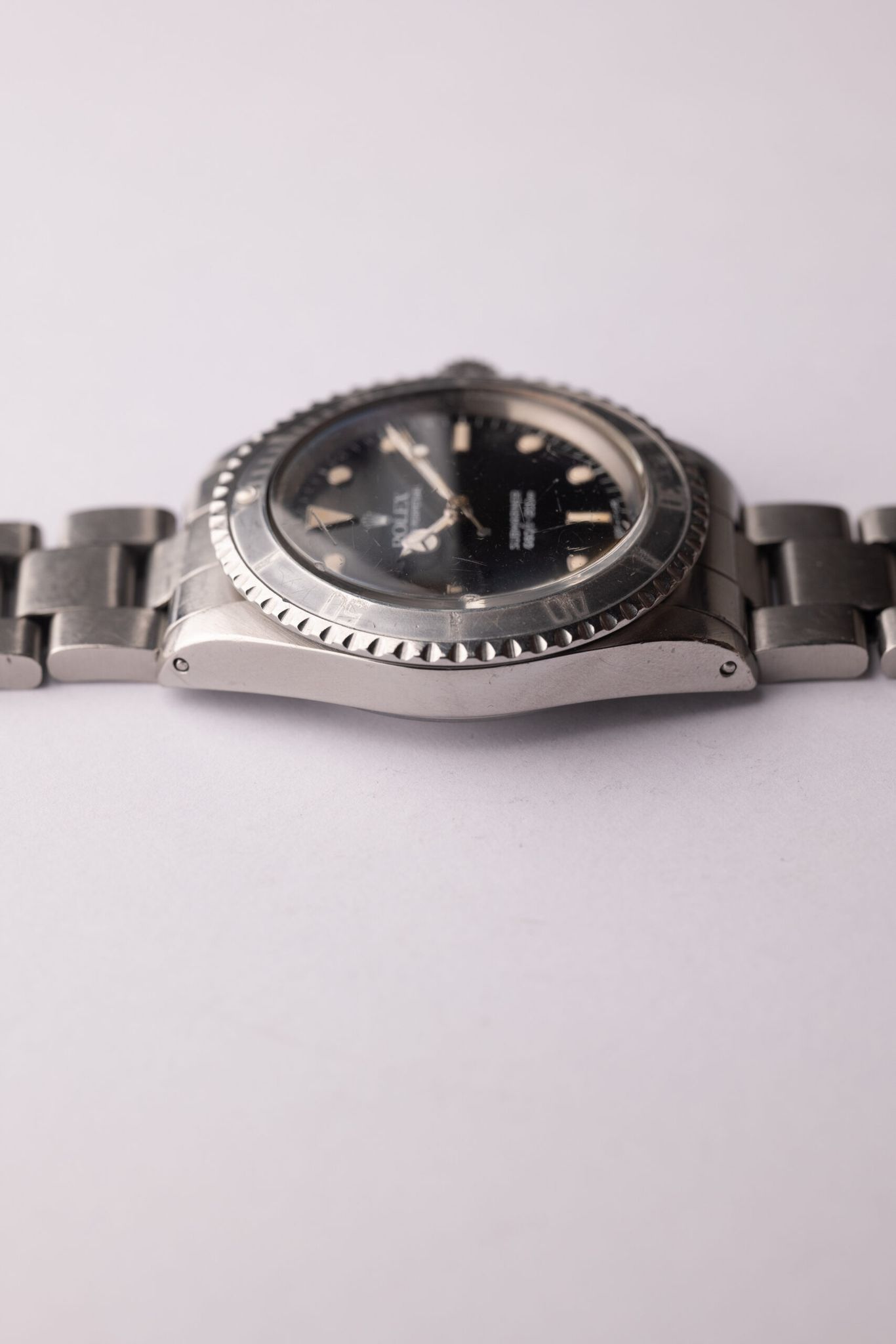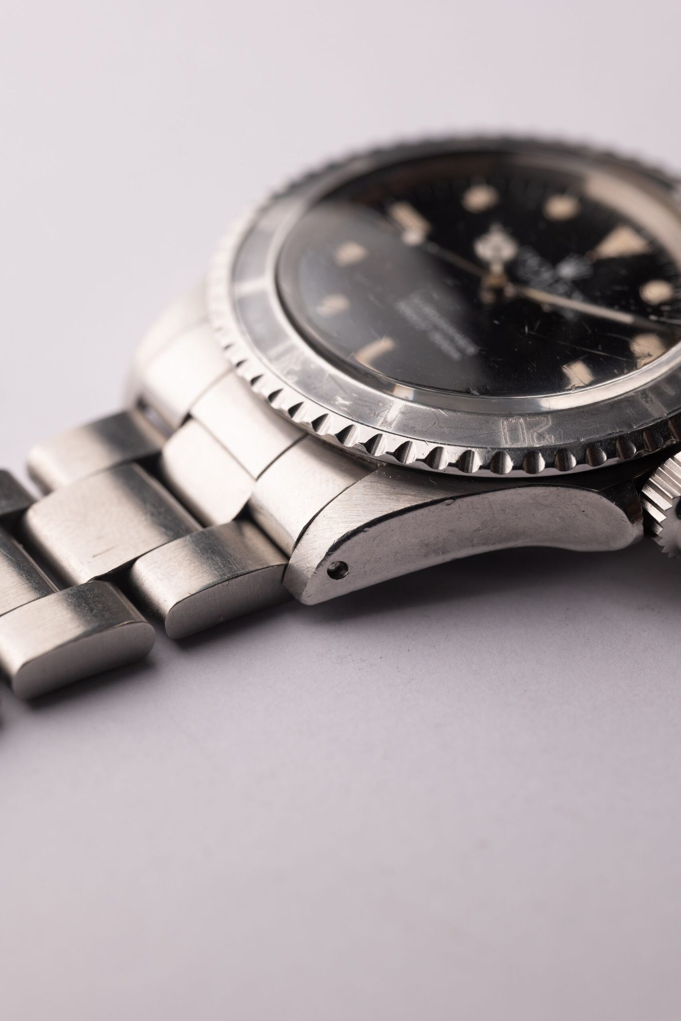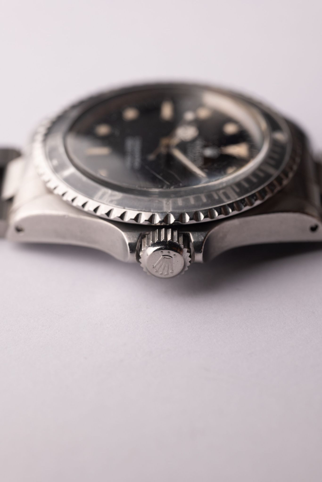 Gloss dial 5513 Submariners sit between the vintage and Neo-vintage lineup. The housing is encased in the same housing and acrylic crystal as the early Sub’s in the 60’s. Meanwhile the gloss dial was introduced on this reference and subsequently is the standard finish for all modern Sub’s. This example has a beautiful creamy and glossy dial as well as a very faded ghost insert.