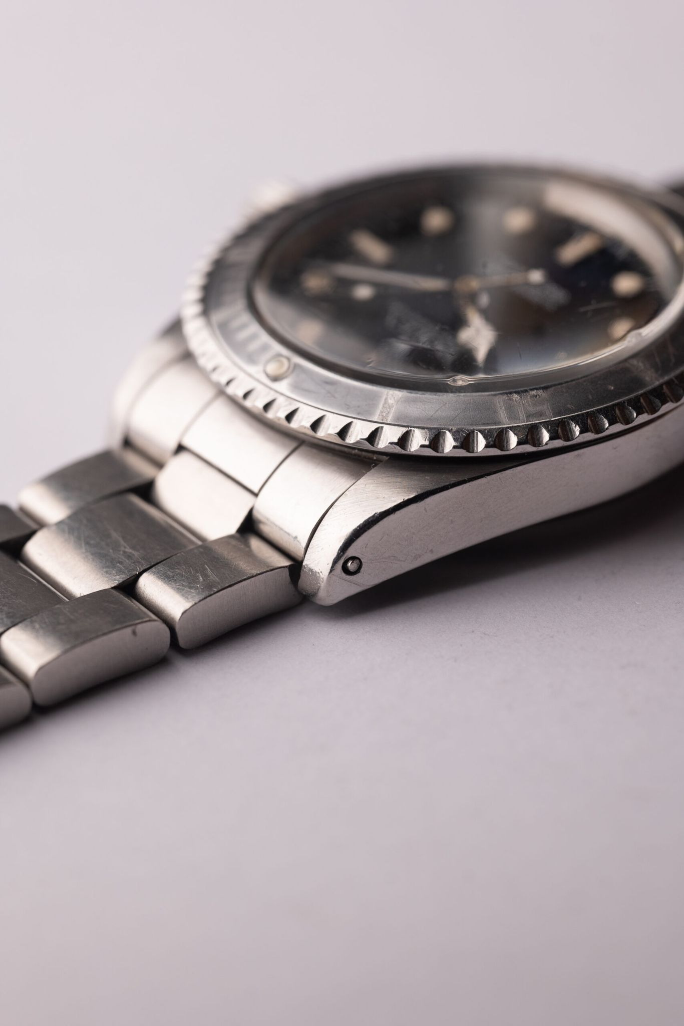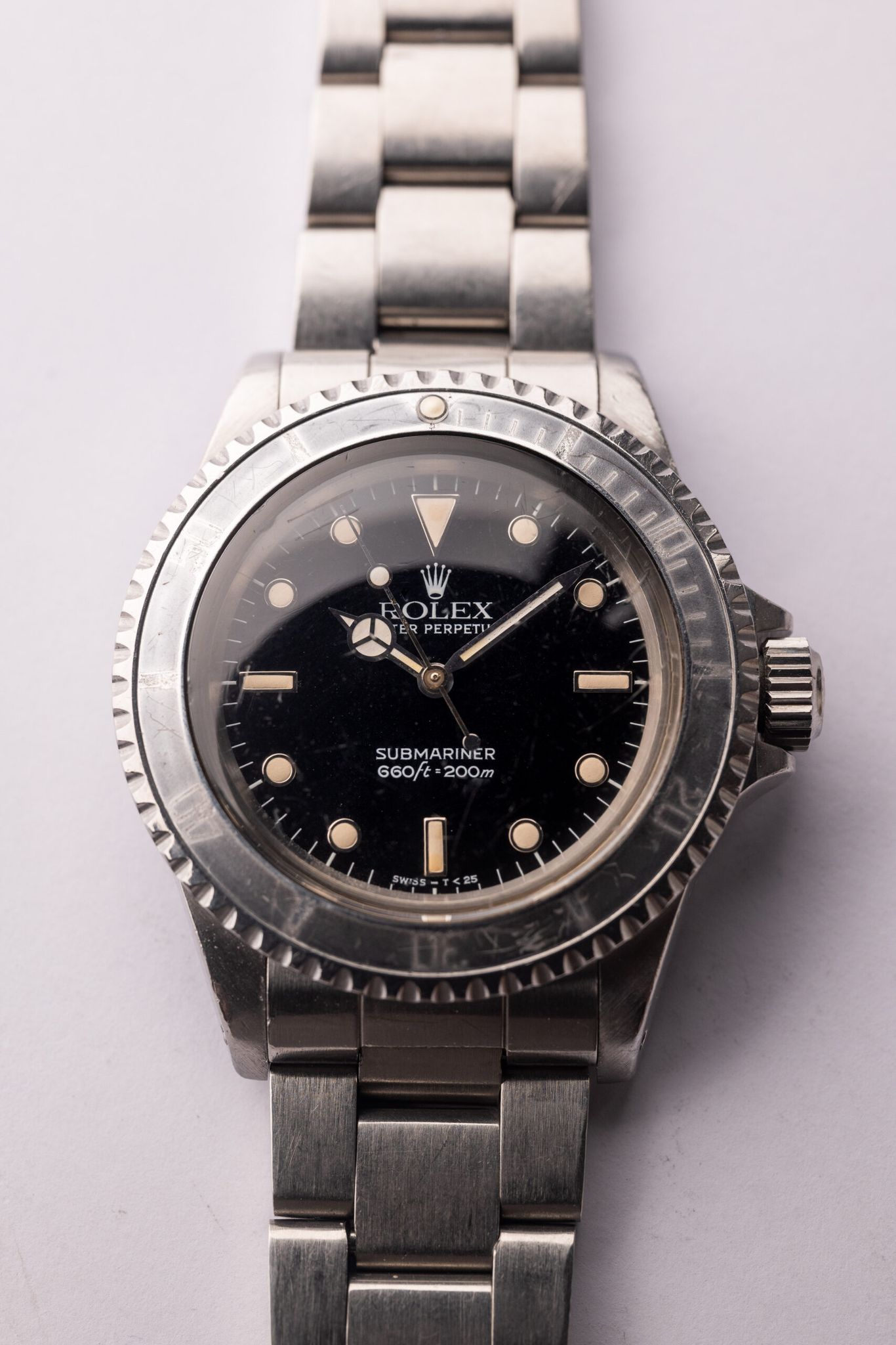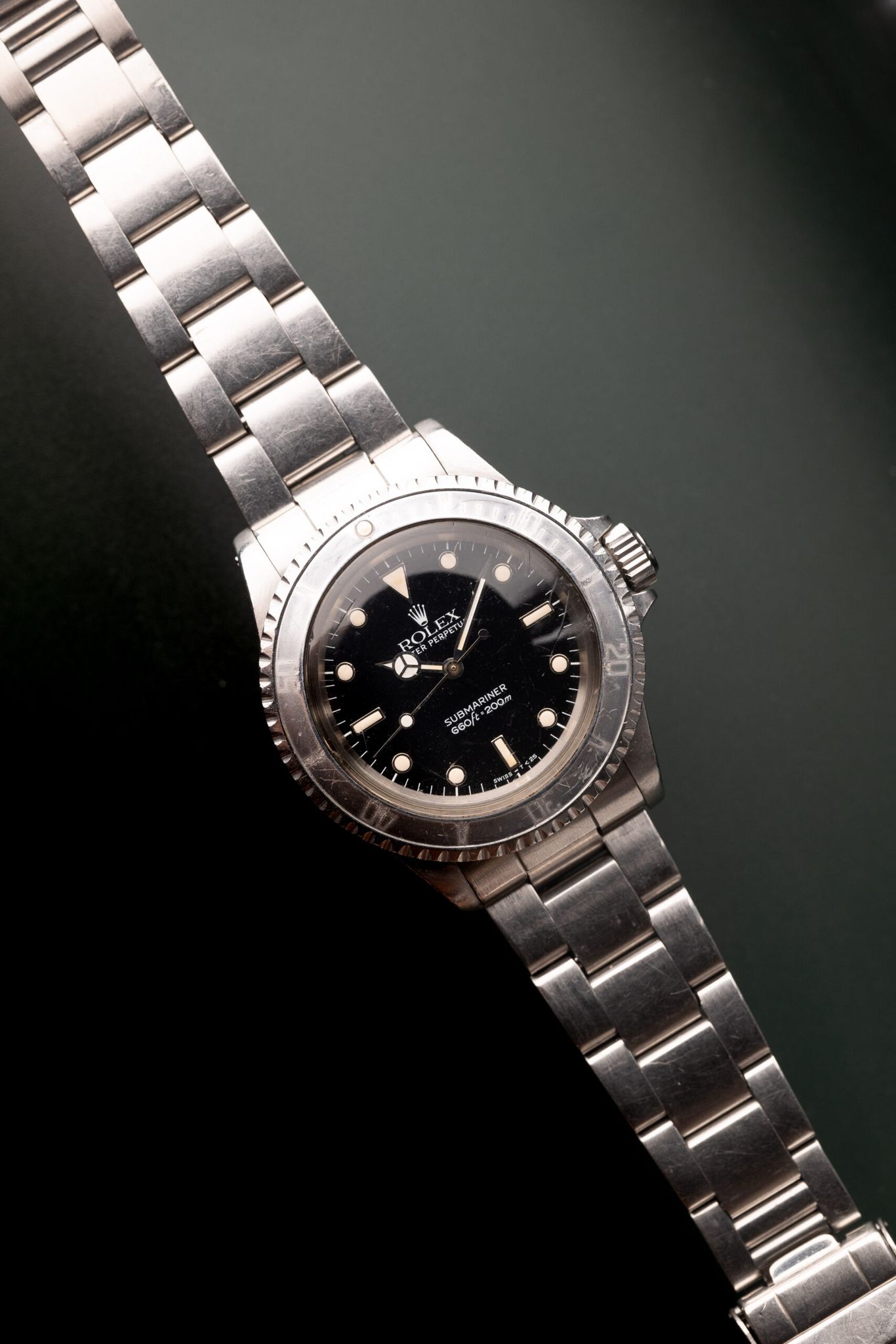 Gloss dial 5513 Submariners sit between the vintage and Neo-vintage lineup. The housing is encased in the same housing and acrylic crystal as the early Sub’s in the 60’s. Meanwhile the gloss dial was introduced on this reference and subsequently is the standard finish for all modern Sub’s. This example has a beautiful creamy and glossy dial as well as a very faded ghost insert.
