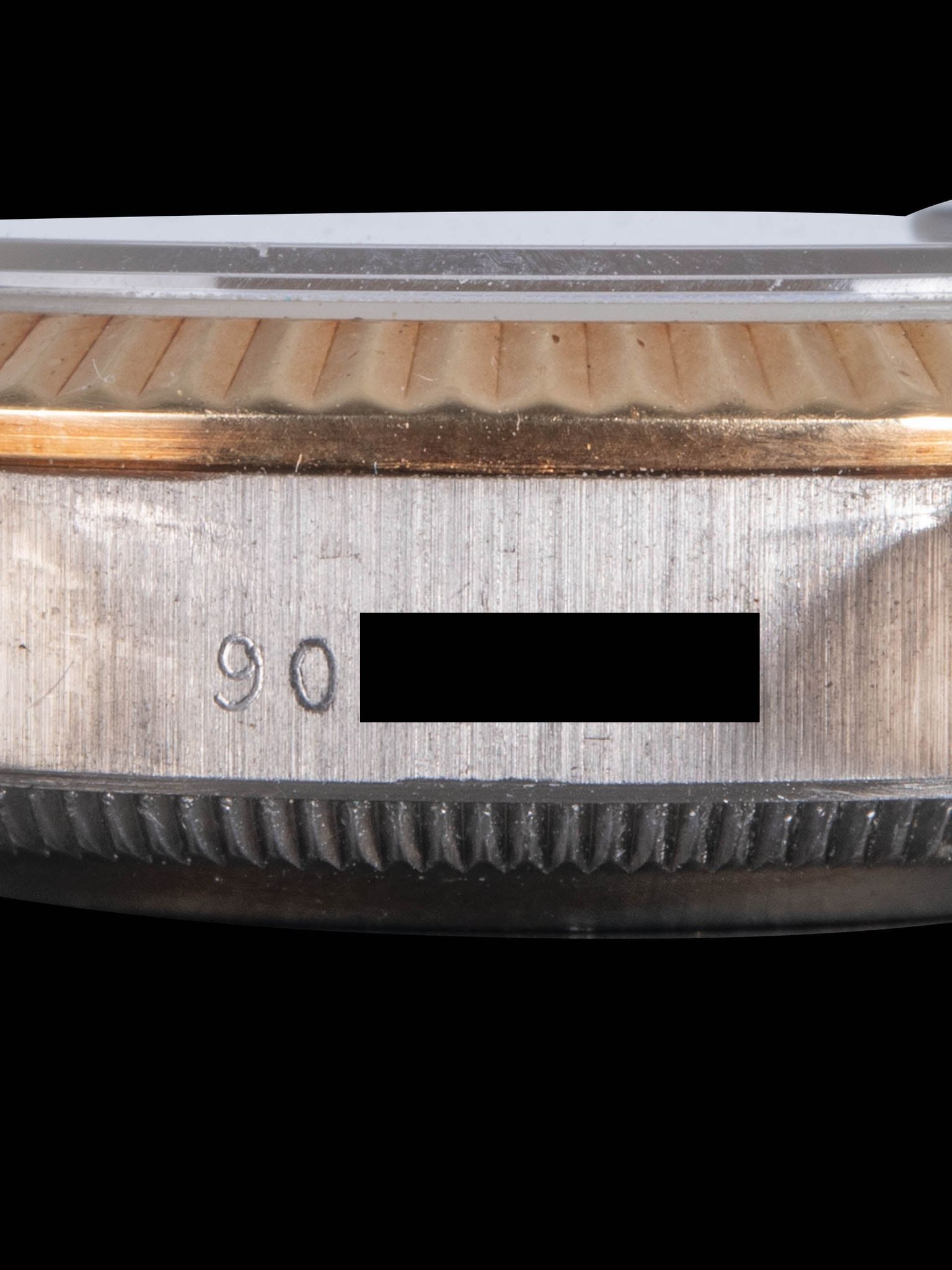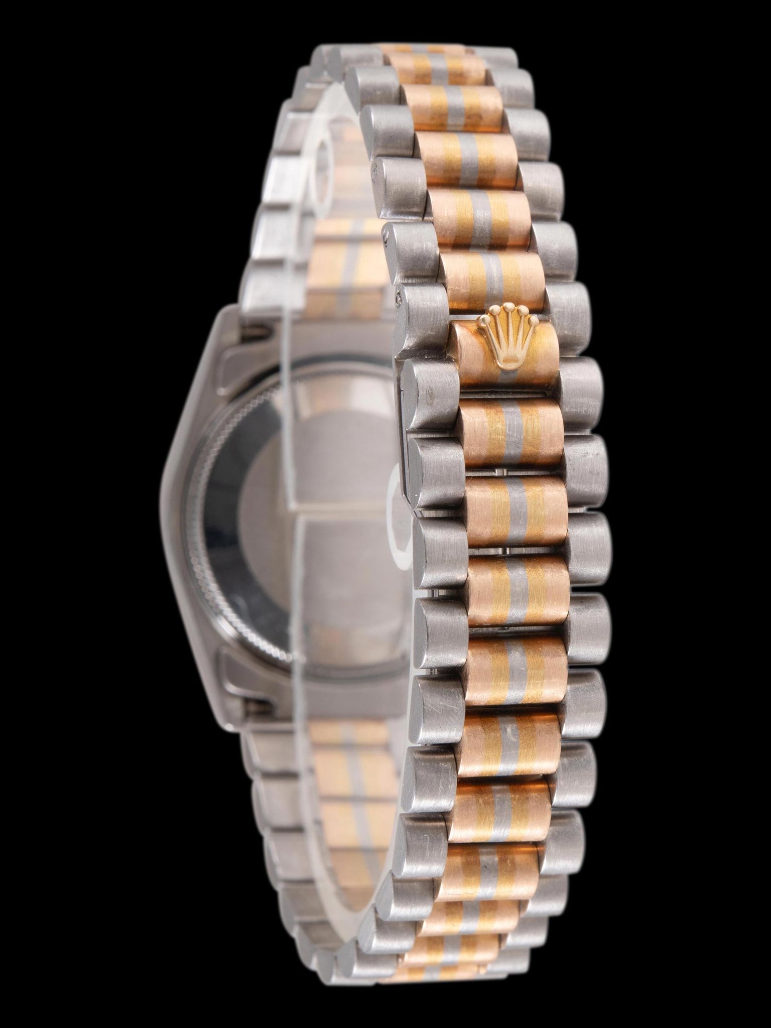 The strong 18K white gold case is in excellent condition, retaining thick and symmetrical lugs that retain crisp edges and finishing with minimal signs of previous polishing present. The case exhibits some signs of previous use and some oxidation spots that are common for gold watches in this era. The 18K yellow gold bezel is extremely crisp and believed to remain unpolished, featuring a section of patina that consists of vibrant blue and purple oxidation. The case retains its original white gold two-dot crown. The case back displays gentle wear and is in great overall condition. The original Rolex 8289 Tridor President bracelet retains 28 links that show nominal stretch and will fit up to a 7-inch wrist.
