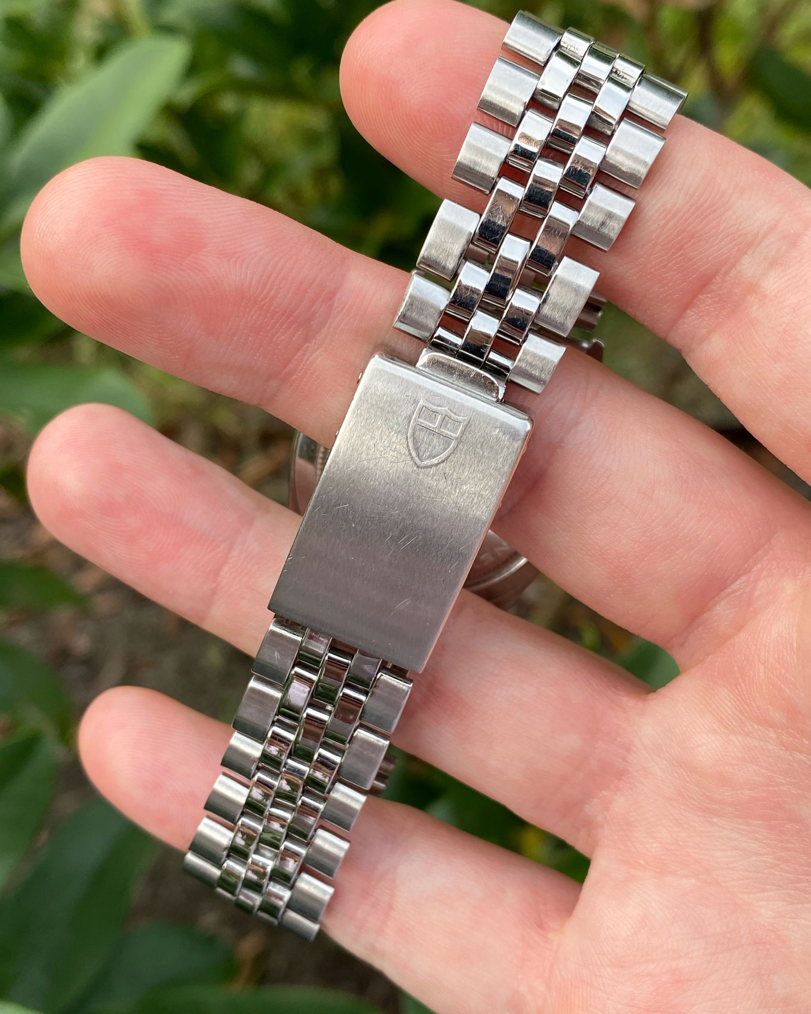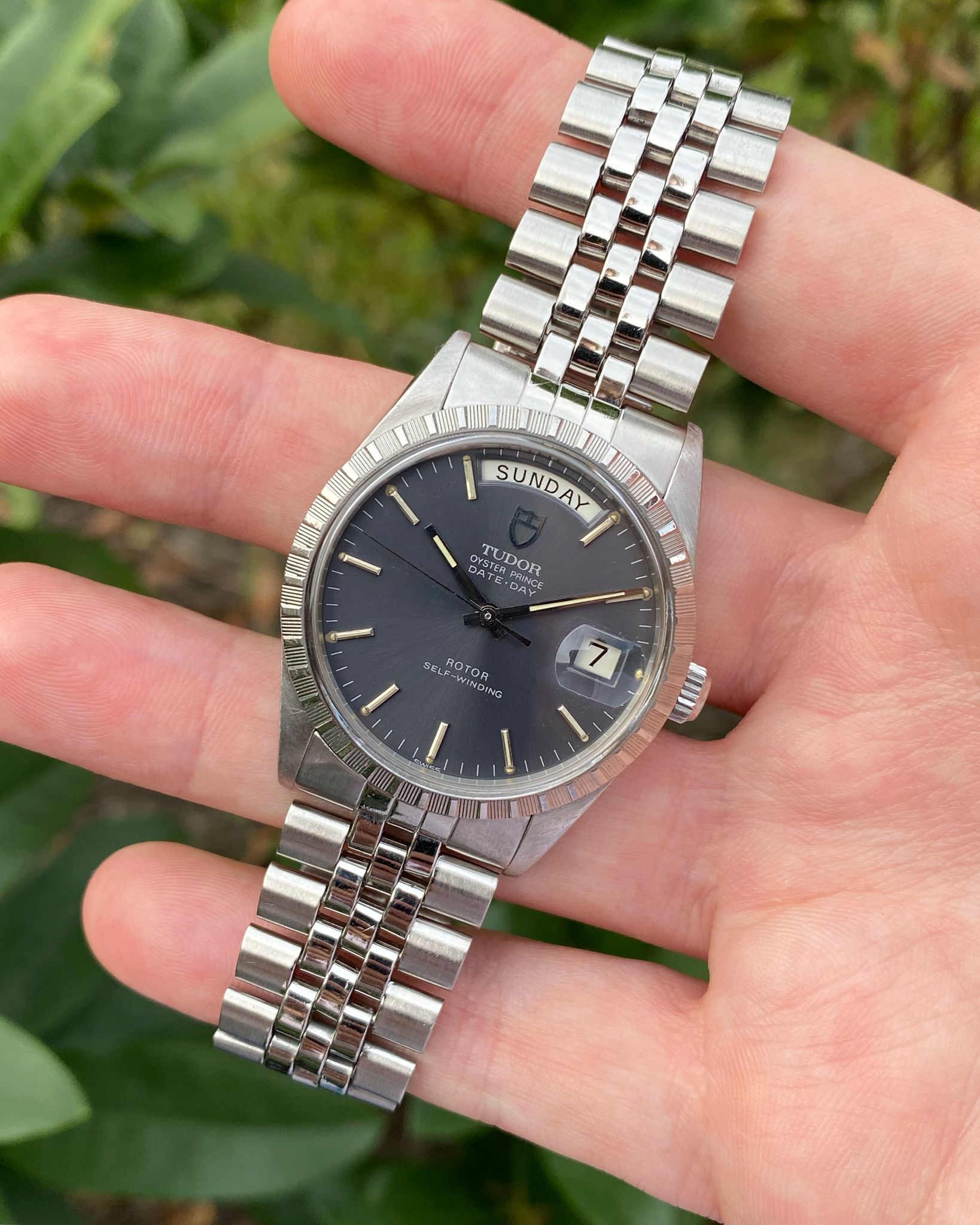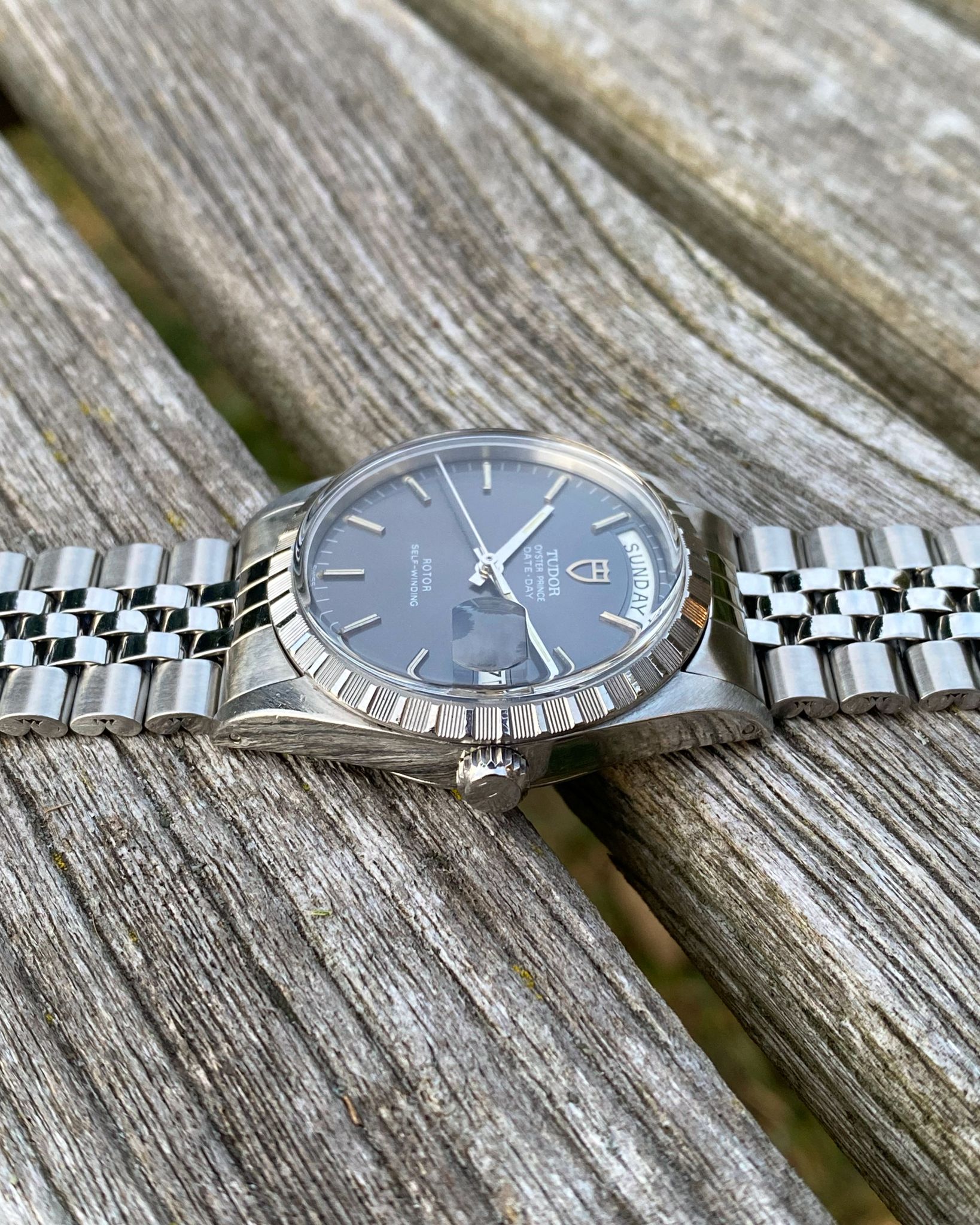 The Tudor features a brushed steel case with a fixed engine turned bezel. The Date Day is mounted on its original 6251H folded-link Jubilee bracelet, secured to the case via 55 end links, and retains its full links, comfortably fitting a wrist in excess of 7.75 inches. The Tudor features a slate grey sunburst dial with applied index hour markers and polished tritium-coated hands, with date and day apertures positioned at 3 and 12 o’clock. The tritium on both the lume plots and hands has acquired a uniform and rich custard-colored patina with age, pairing beautifully with the seldom-seen grey sunburst dial. Powering the reference 94510 is a modified ETA Caliber 2834-1, which was recently serviced and is running smoothly.