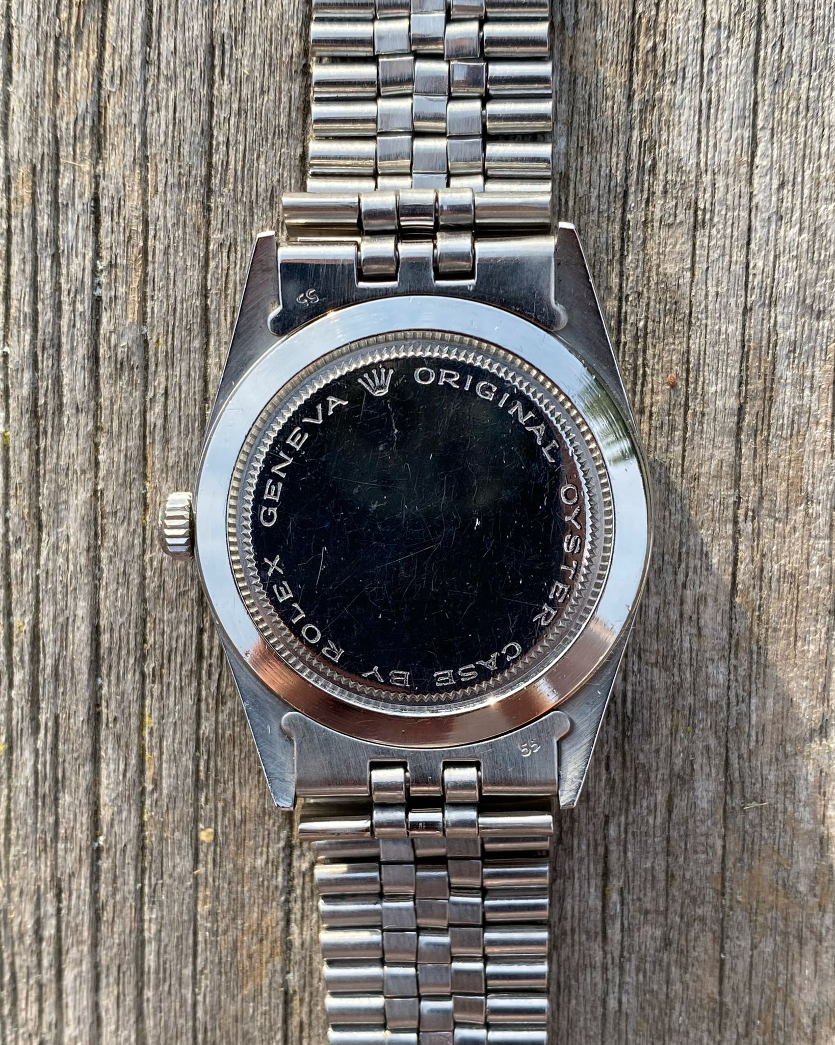 The case remains thick with even well defined lugs, while the engine turned bezel remains crisp. The Jubilee bracelet contains stretch, is consistent with its age, while the shield on the clasp remains present and well defined. The dial has been preserved exceptionally well with all tritium lume plots fully present, and is free of any imperfections.