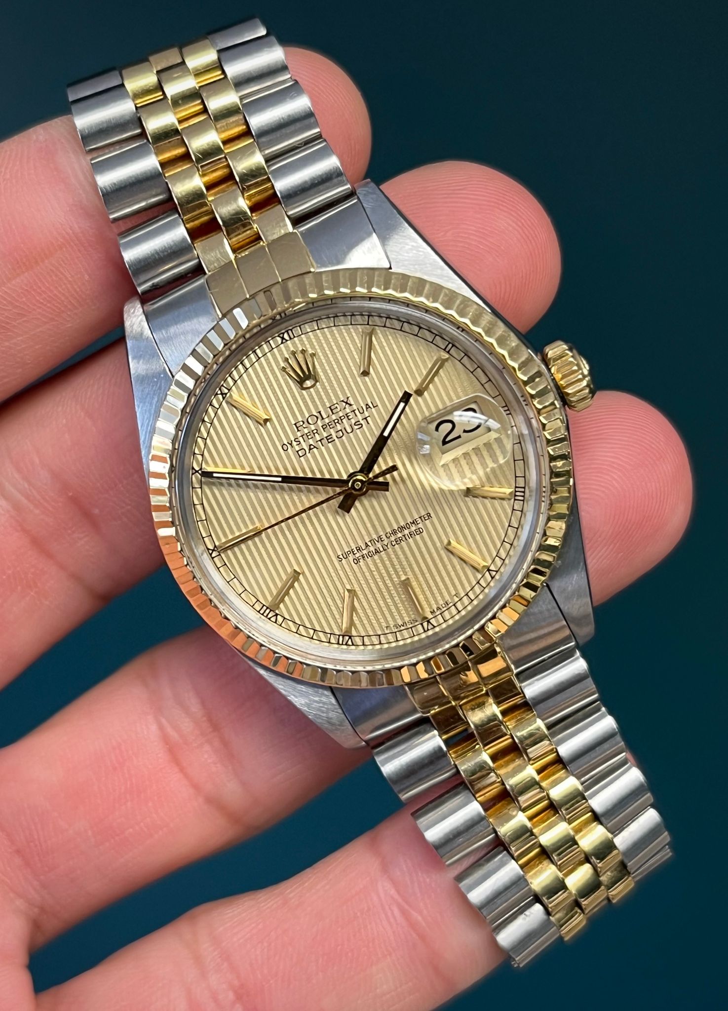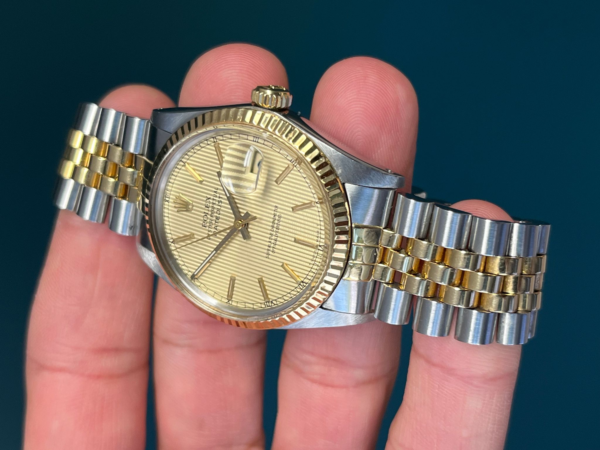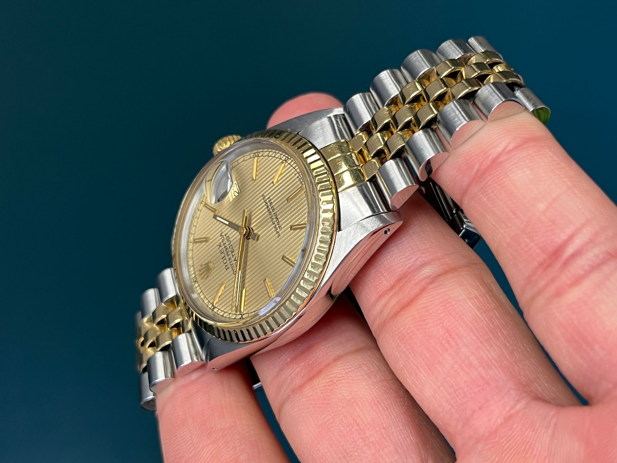 This two-tone Date Just showcases a Tapestry dial featuring a date display, exemplifying Rolex's commitment to precision and enduring style. This example is accompanied by its full complete set with boxes, punched papers, tags, wallet and booklets. The holes case is razor sharp and excellent. The plexi is free from wear partnered with its excellent yellow gold fluted bezel. The Tapestry dial is excellent. The two-tone jubilee bracelet is long and has 4 removable screws and shows only minimal stretch. Watch is running and keeping time. Here's an excellent example and set readily available.