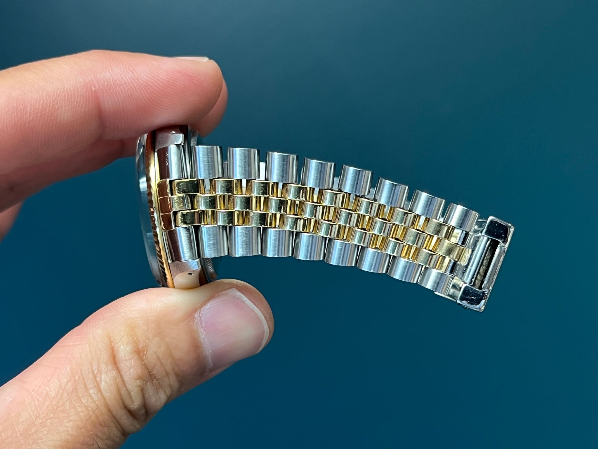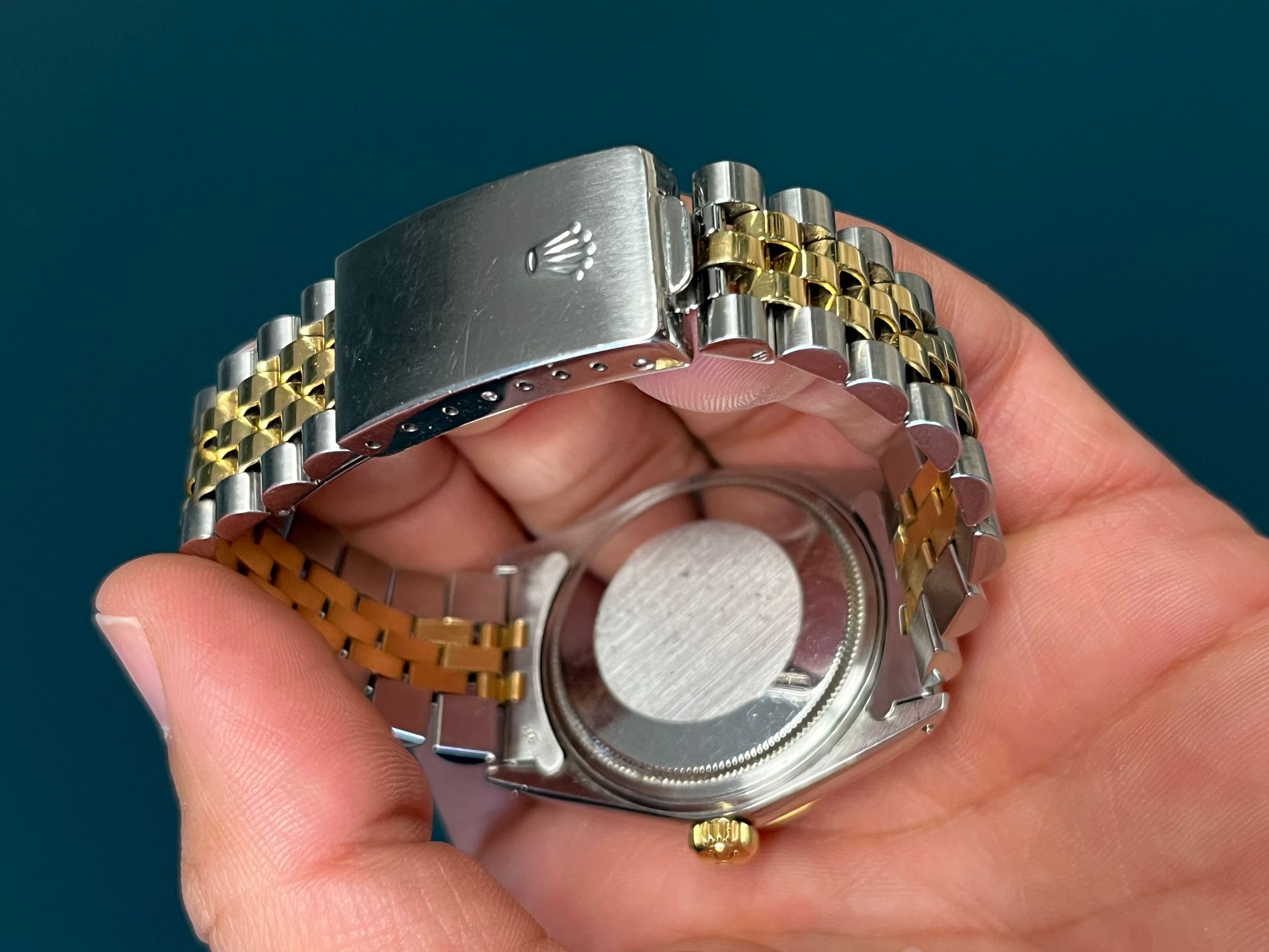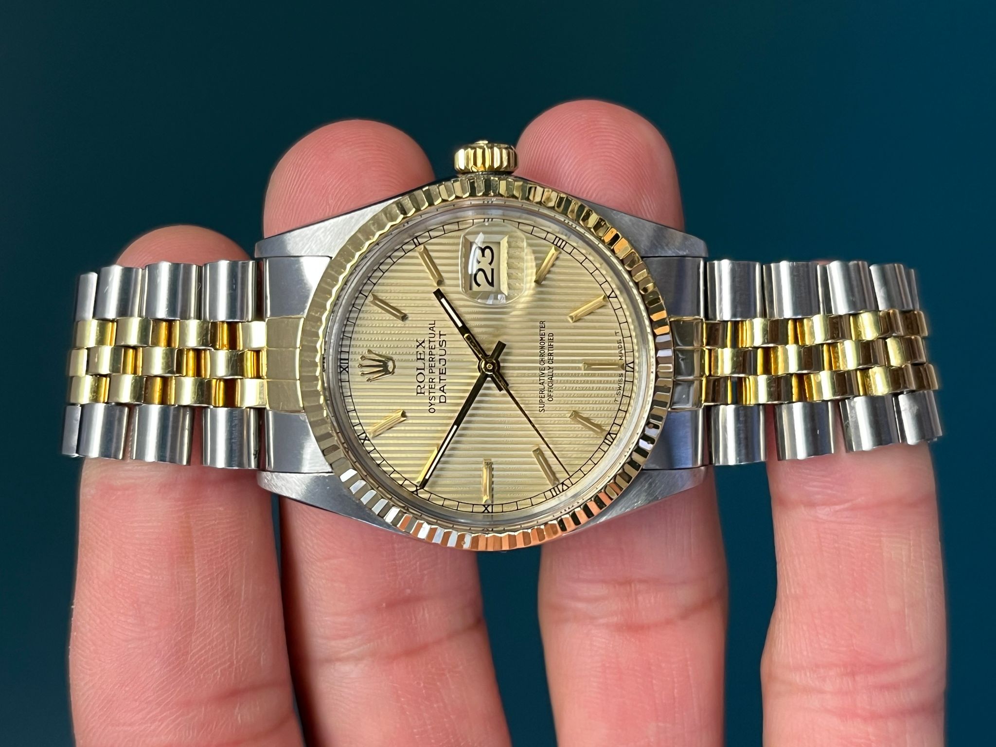 This two-tone Date Just showcases a Tapestry dial featuring a date display, exemplifying Rolex's commitment to precision and enduring style. This example is accompanied by its full complete set with boxes, punched papers, tags, wallet and booklets. The holes case is razor sharp and excellent. The plexi is free from wear partnered with its excellent yellow gold fluted bezel. The Tapestry dial is excellent. The two-tone jubilee bracelet is long and has 4 removable screws and shows only minimal stretch. Watch is running and keeping time. Here's an excellent example and set readily available.