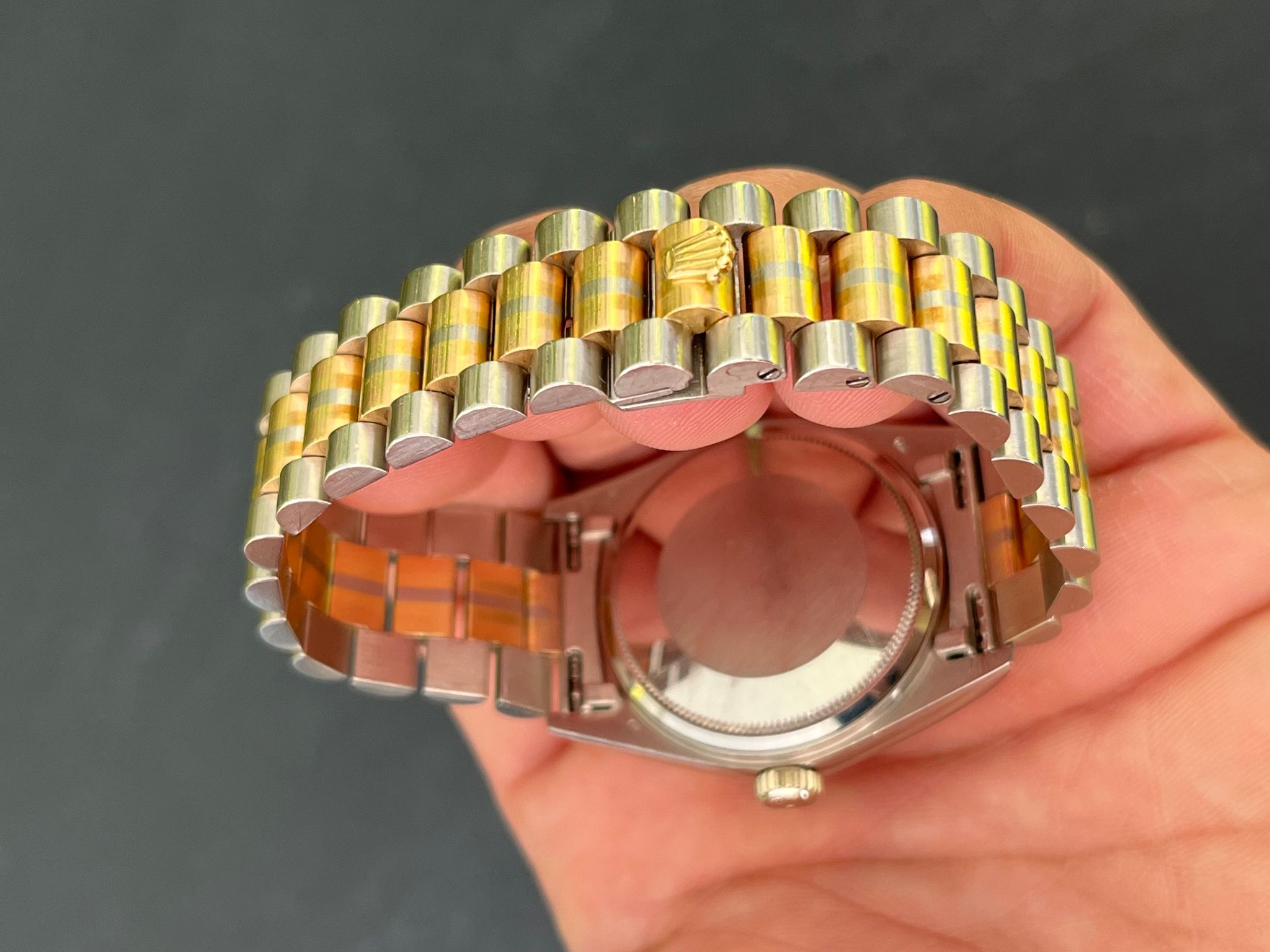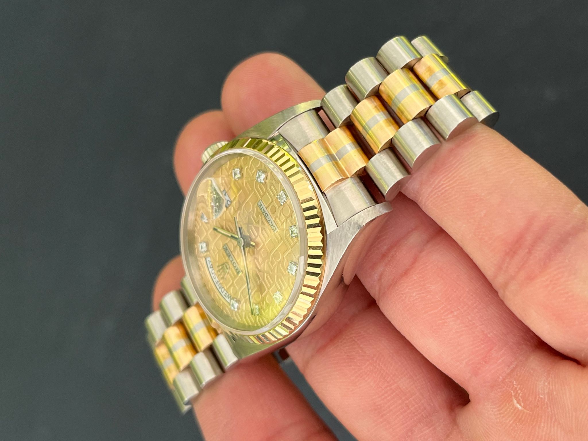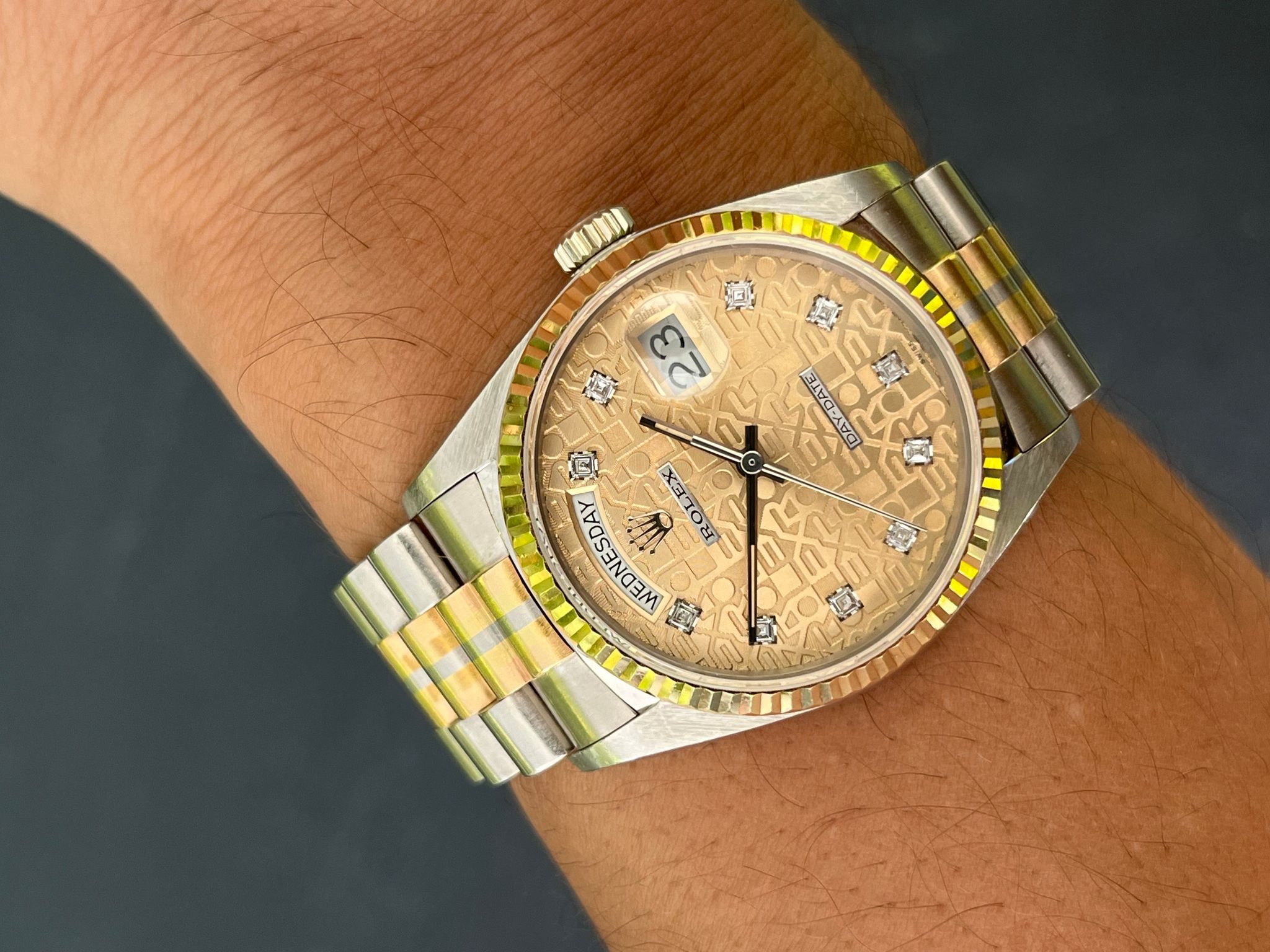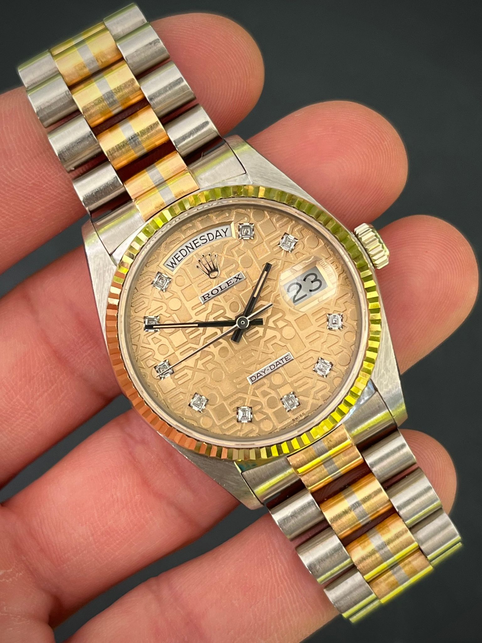 The Rolex Day-Date Reference 18039 Tridor with Factory Diamond Dial is an exquisite timepiece that epitomizes luxury and sophistication. This unique model features Rolex's innovative Tridor construction, seamlessly blending 18k yellow, white, and rose gold into a single, elegant bracelet. The watch's opulent aesthetic is further enhanced by its factory-set diamond dial, which sparkles with meticulously placed diamonds serving as hour markers. Powered by the reliable Rolex Caliber 3055 automatic movement, this Day-Date model offers impeccable precision and includes the iconic day and date display. The Reference 18039 Tridor is a rare and prestigious piece, perfect for those who appreciate unparalleled craftsmanship and timeless elegance.