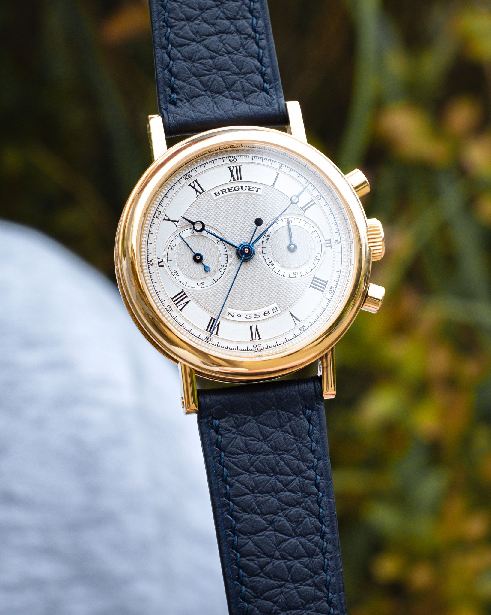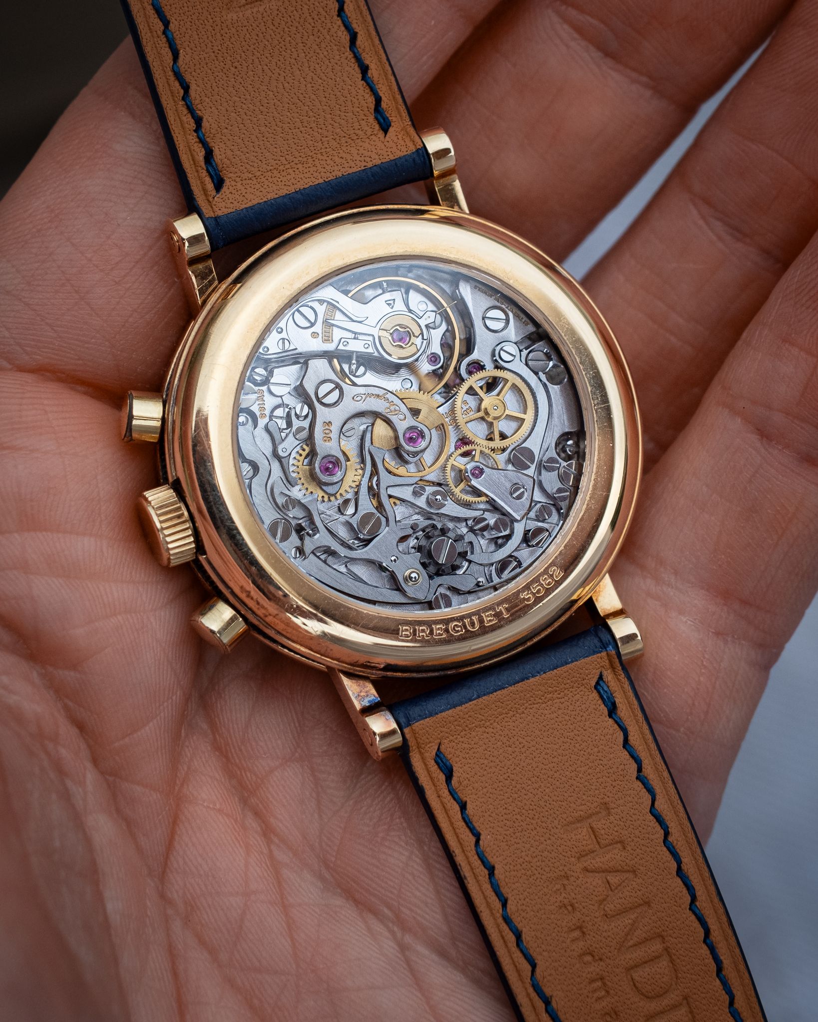 What I love — Early ‘pre-series’ chronograph with display caseback, very rare for ref. 3230. Unpolished example with deep case engravings and hallmarks (between the lugs). These early examples produced during Daniel Roths time at Breguet, likely overseen or worked on by himself.