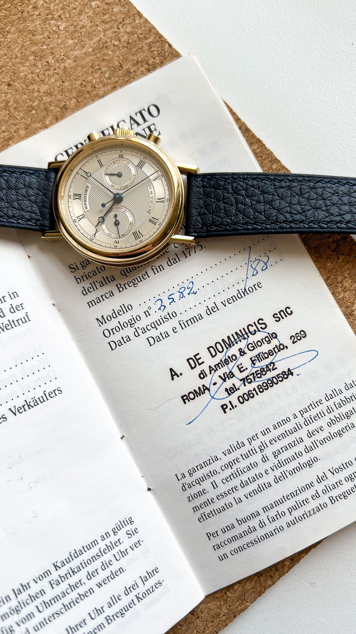The watch is accompanied by the original paperwork, stamped by the retailer at sale (1988). Also comes with an 18k yellow gold Breguet pin buckle.