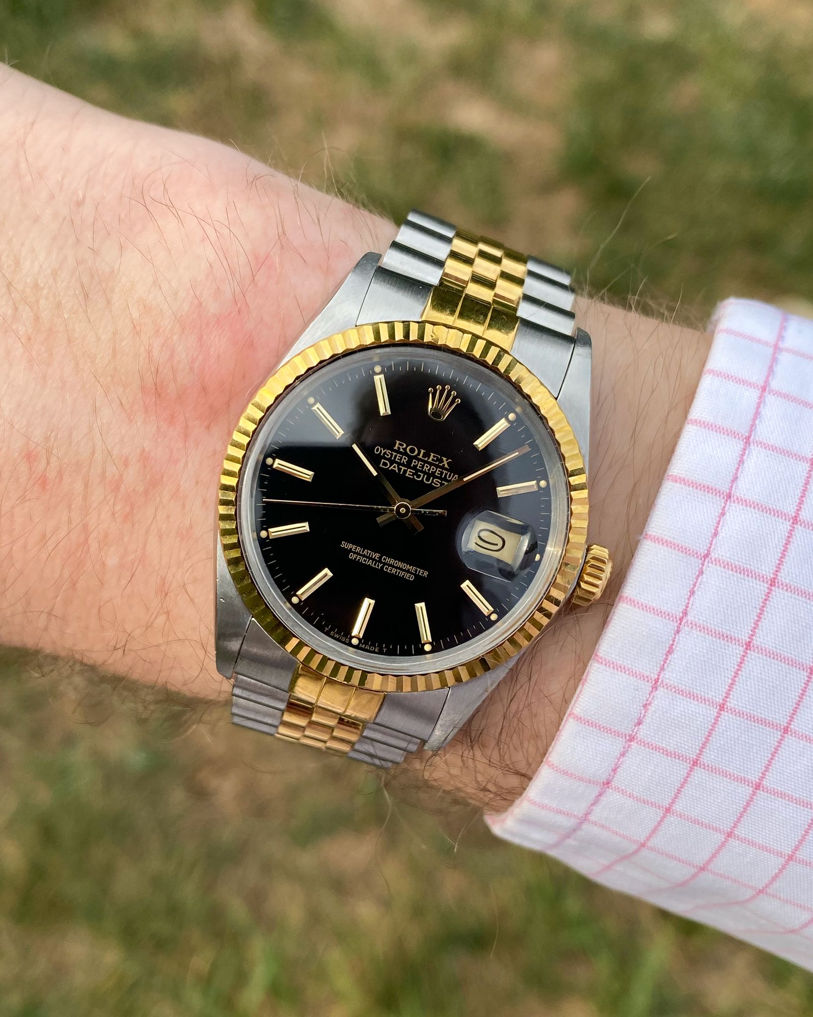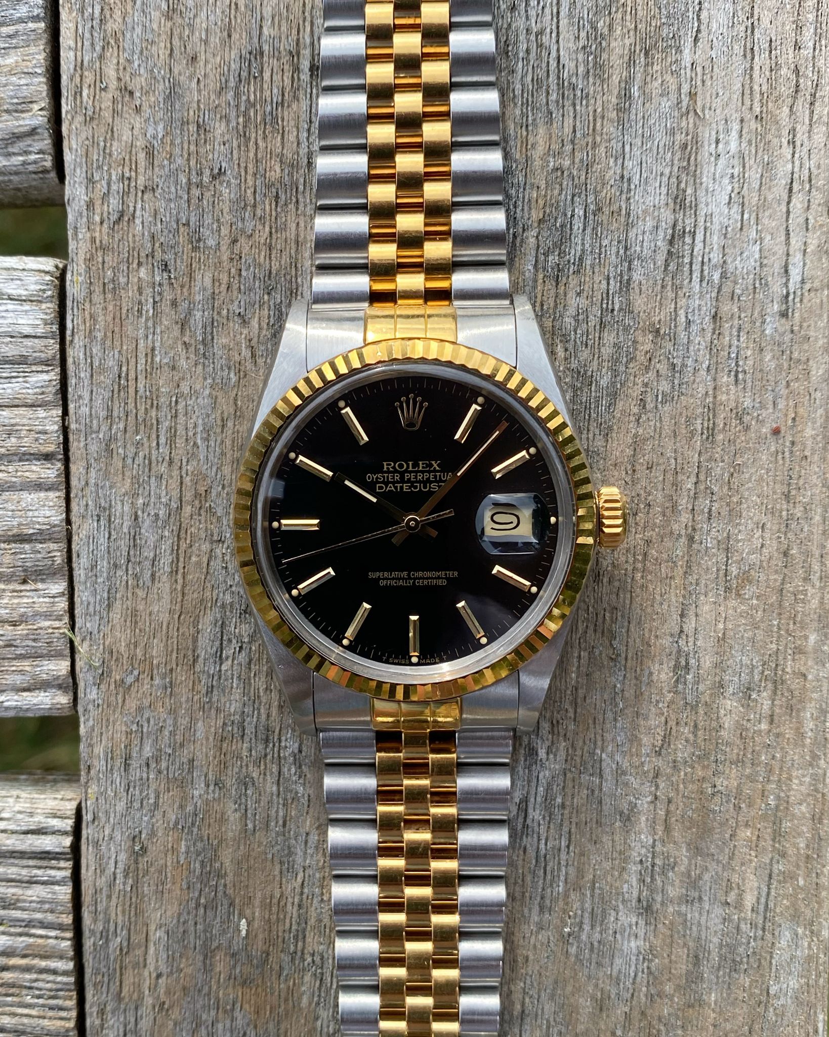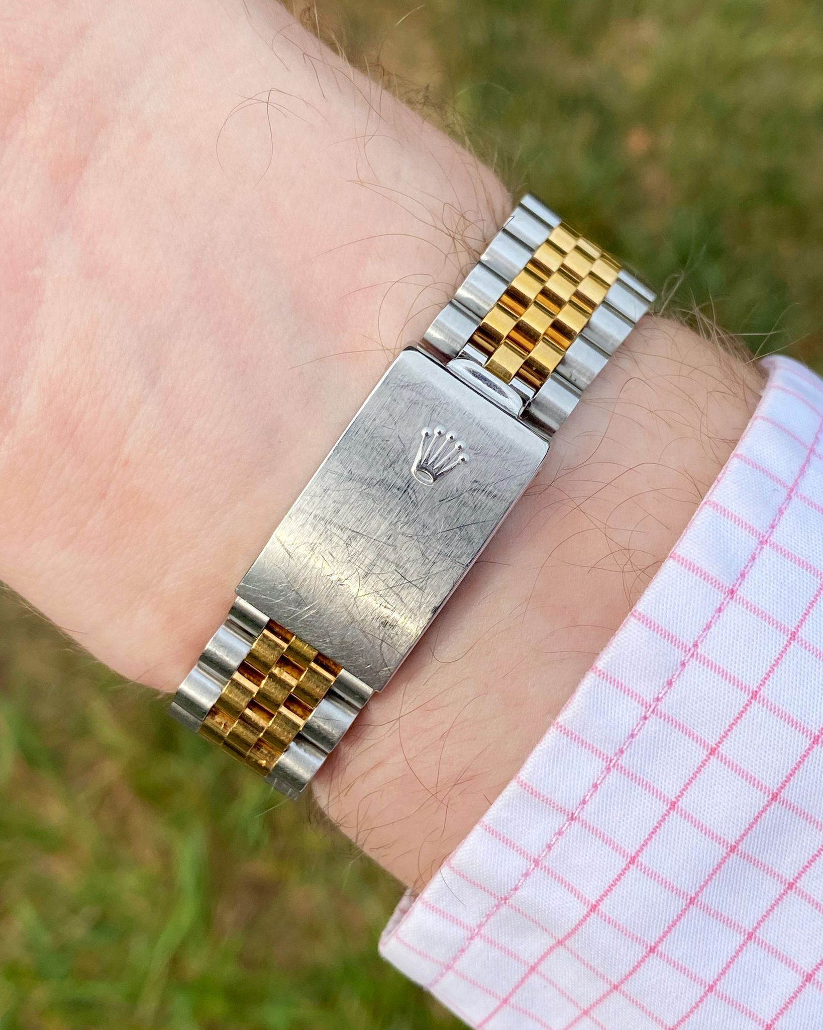 The Datejust features a brushed steel case with fluted yellow gold bezel, and is mounted on its original steel and gold 62523H-18 Jubilee bracelet, which is stamped with an L claspcode, corresponding to a production date in January 1987. The bracelet is fully linked, containing 22 full size links, and will comfortably fit a 7.75 inch wrist with all of the links installed. The Rolex features a black sunburst dial with applied polished gold index hour markers, gold tritium coated hands, and a magnified date window aperture at 3 o’clock. The tritium lume plots and hands have acquired an even custard colored patina with age, which beautifully complements the black dial. The movement used in the 16013 is the Rolex Caliber 3035, which is running well.
