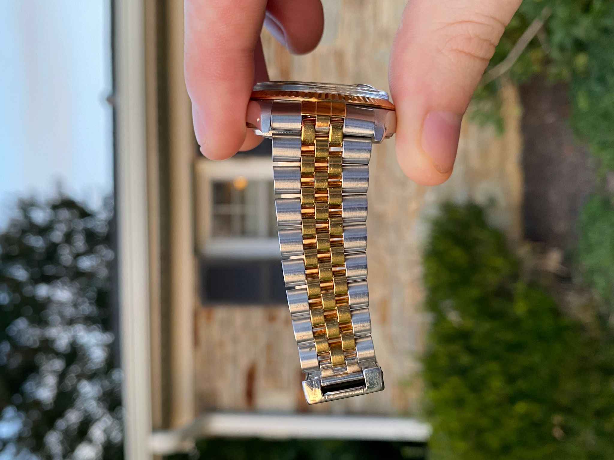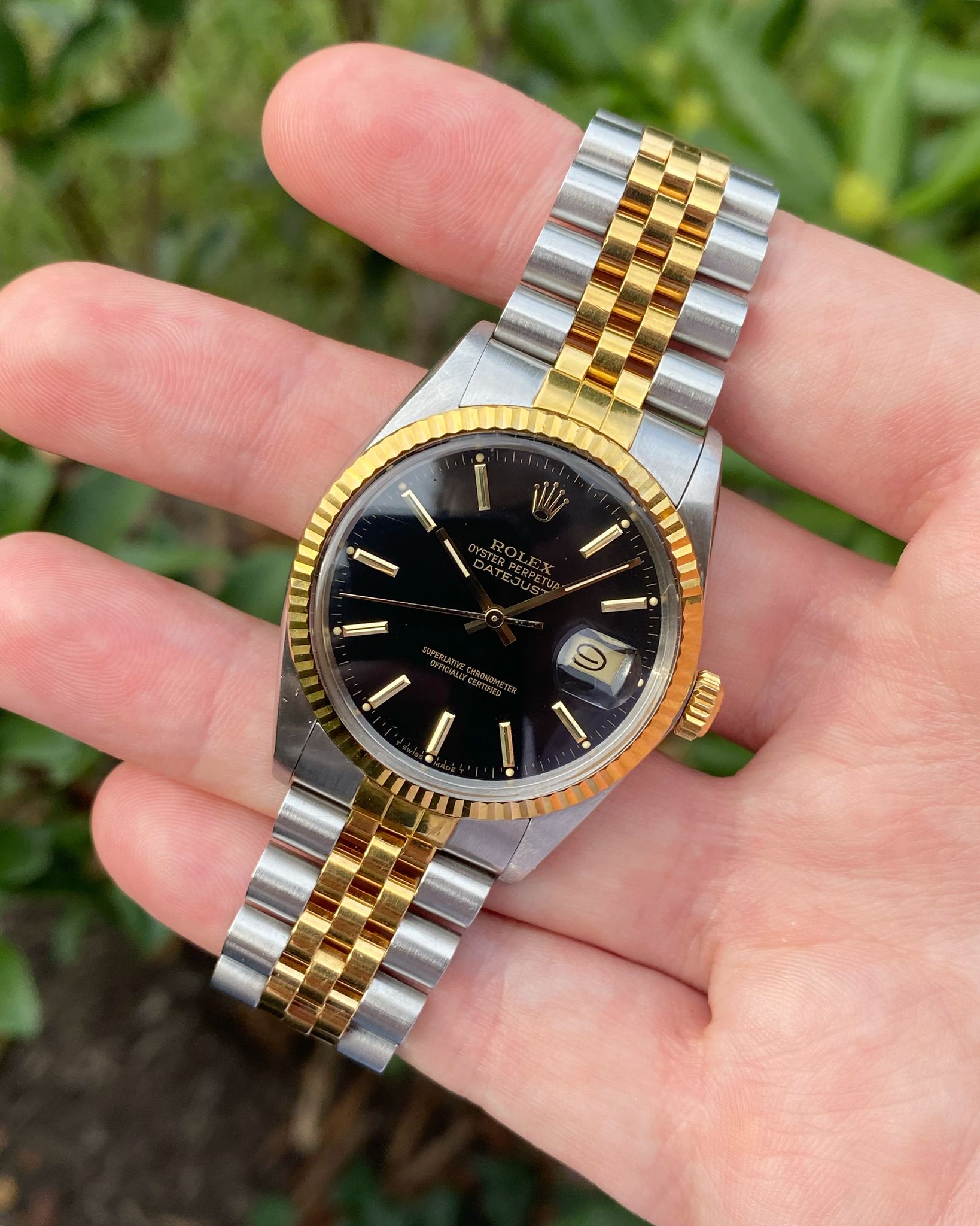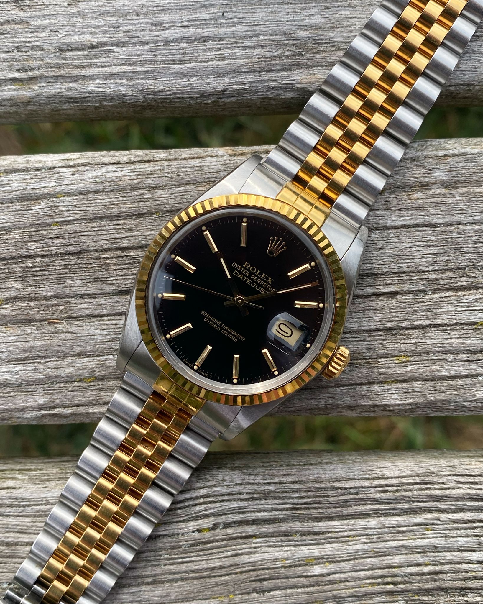 The Datejust features a brushed steel case with fluted yellow gold bezel, and is mounted on its original steel and gold 62523H-18 Jubilee bracelet, which is stamped with an L claspcode, corresponding to a production date in January 1987. The bracelet is fully linked, containing 22 full size links, and will comfortably fit a 7.75 inch wrist with all of the links installed. The Rolex features a black sunburst dial with applied polished gold index hour markers, gold tritium coated hands, and a magnified date window aperture at 3 o’clock. The tritium lume plots and hands have acquired an even custard colored patina with age, which beautifully complements the black dial. The movement used in the 16013 is the Rolex Caliber 3035, which is running well.