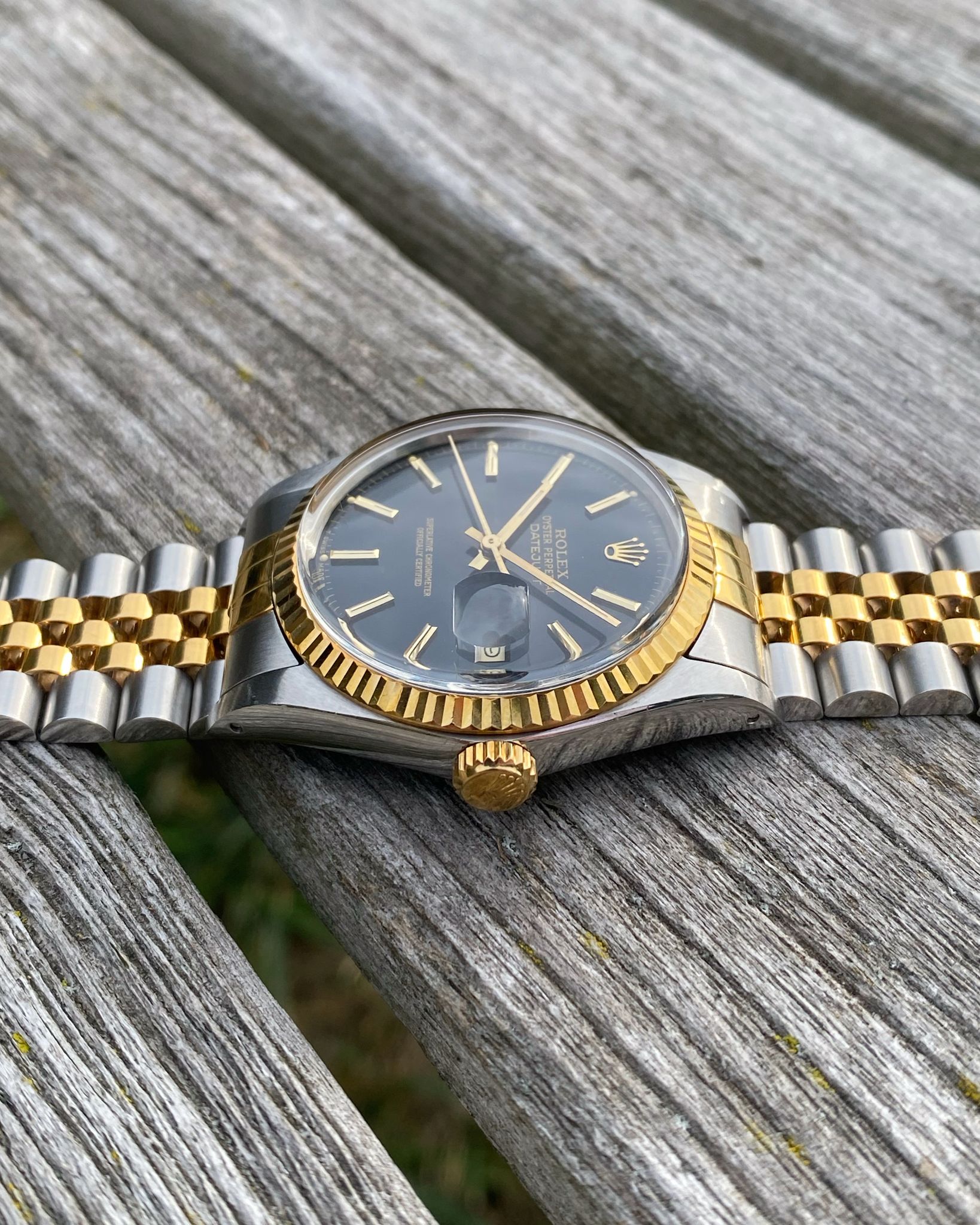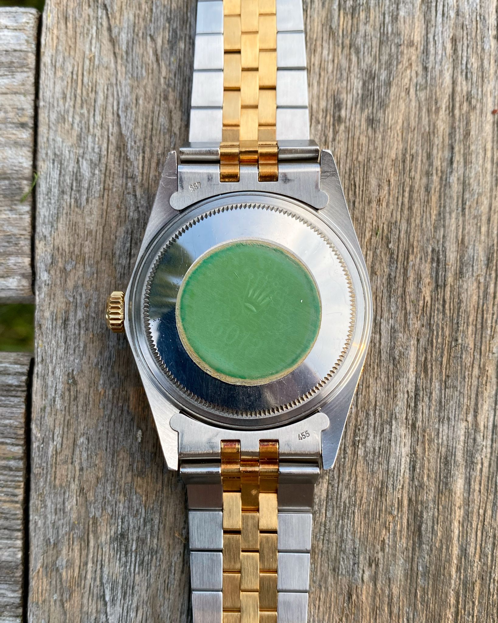 The case has been preserved exceptionally well and remains unpolished with strong factory brush lines, crisp bezel flutes, and its original caseback sticker present. The Jubilee bracelet is also unpolished containing virtually no stretch while the coronet on the clasp remains crisp and well defined. The Rolex’s unpolished yellow gold components have aged beautifully, acquiring a light rose gold colored oxidation. Overall the Datejust remains in near mint condition, and is a superb example of a late production Datejust reference 16013, which appears to have been worn sparingly by its original owner.
