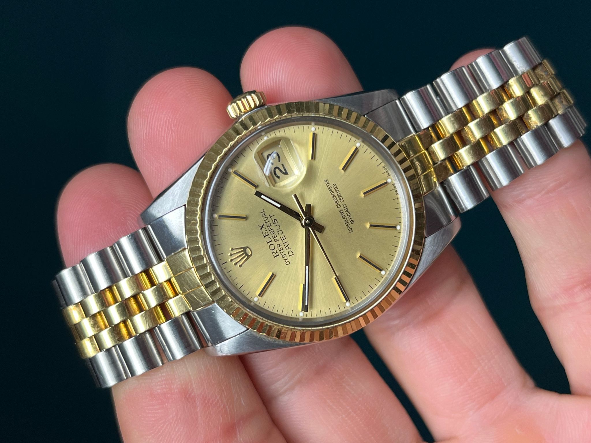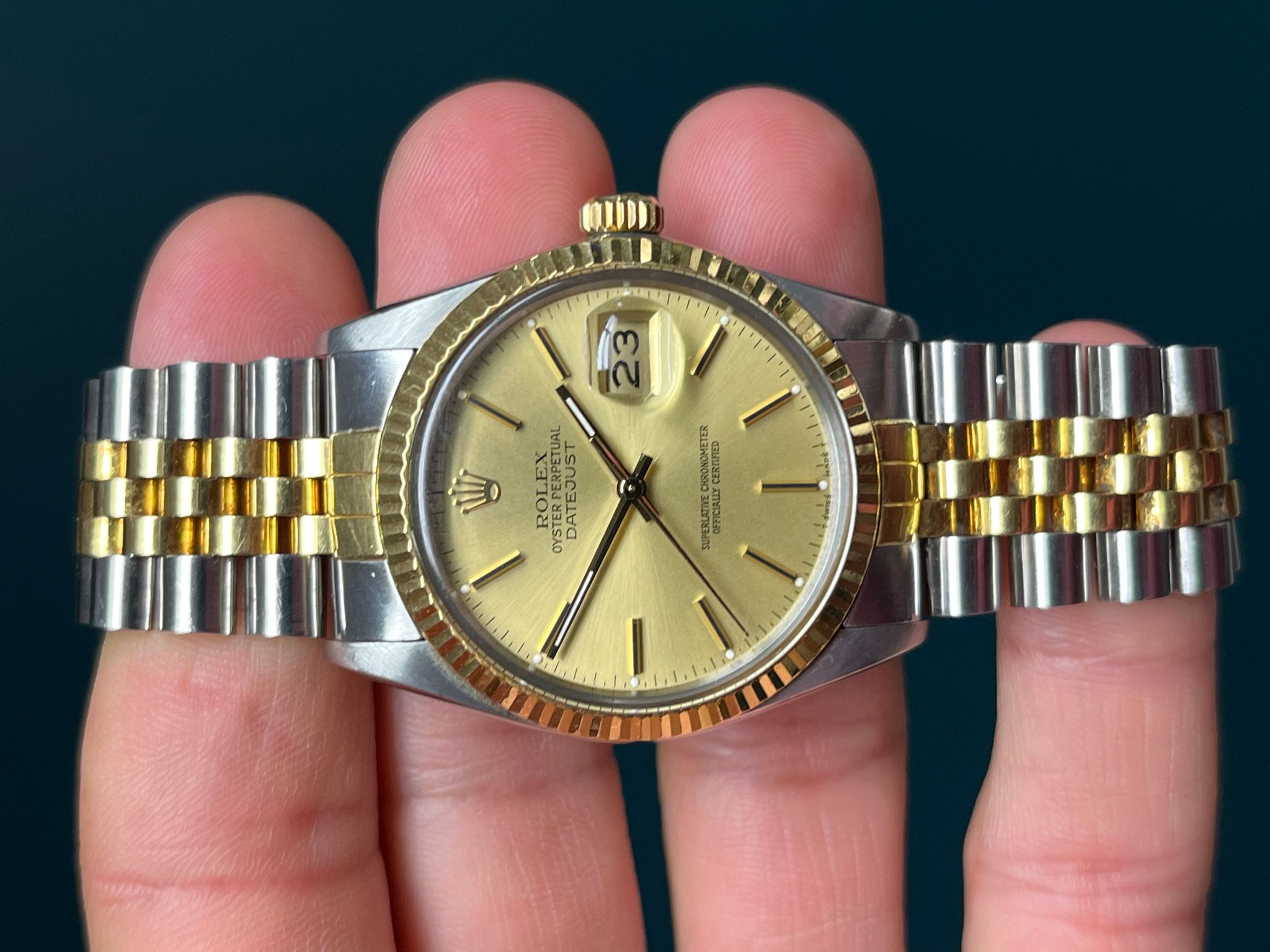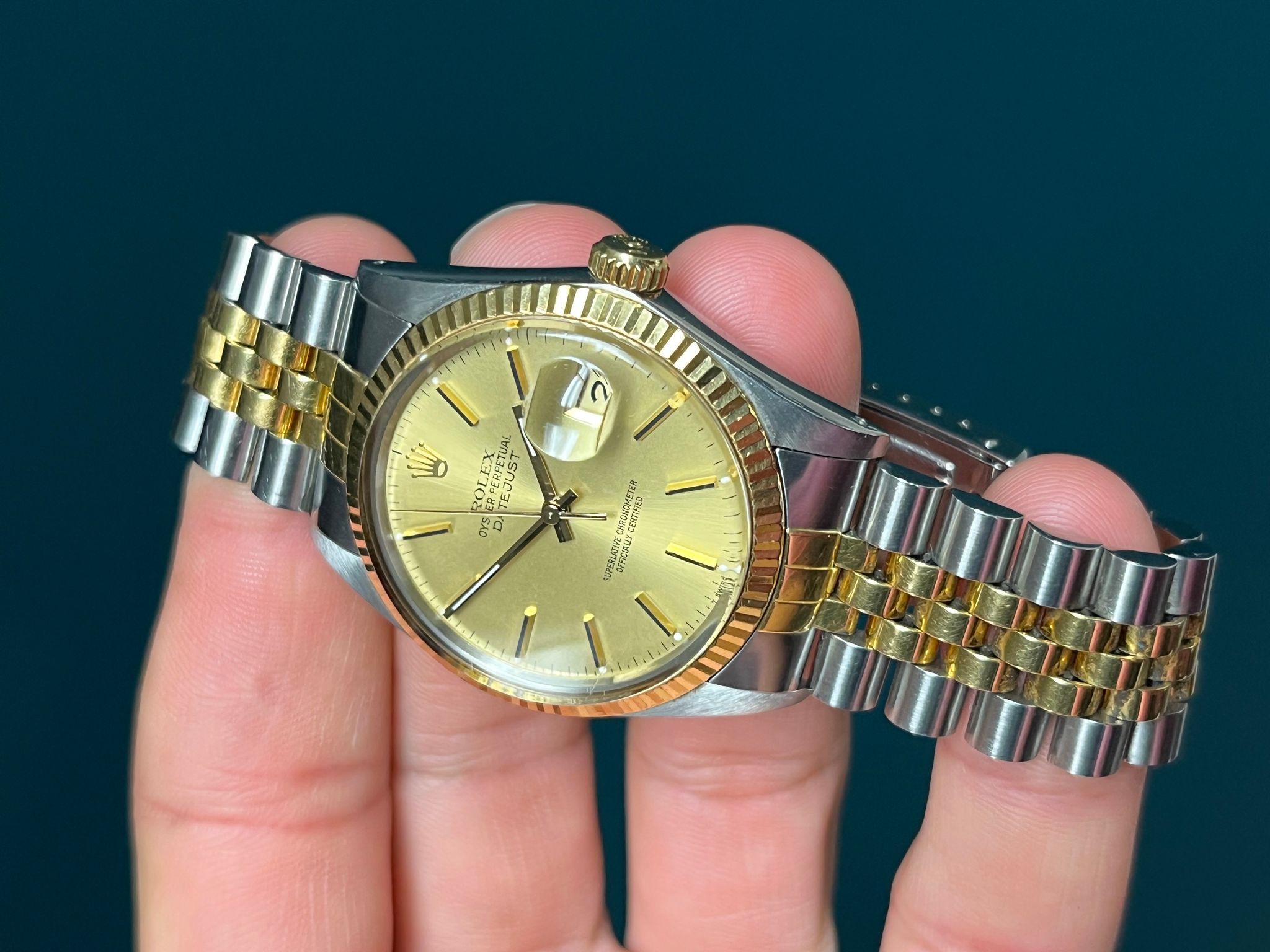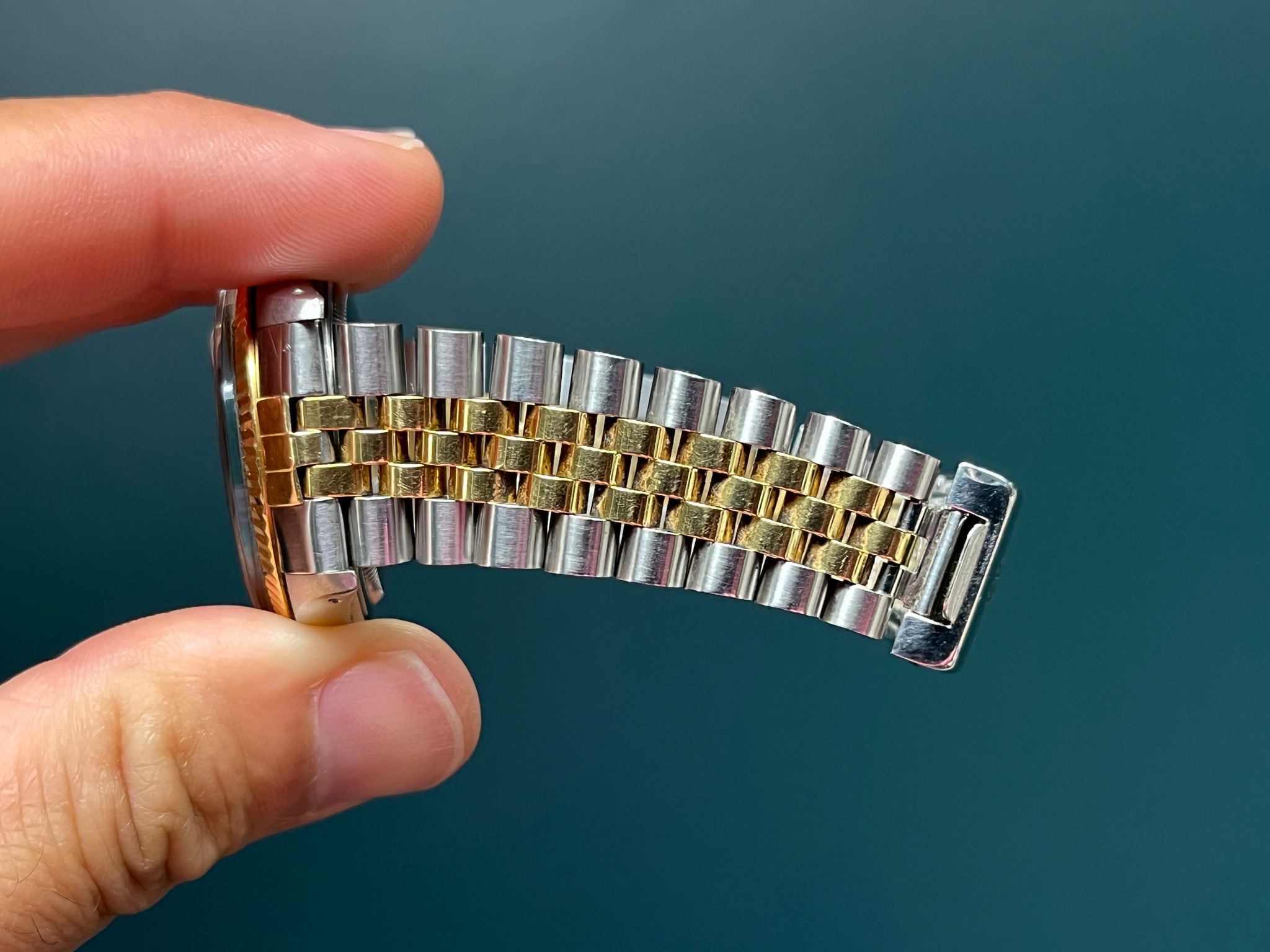 This two-tone Date Just showcases Champagne dial featuring a date display, exemplifying Rolex's commitment to precision and enduring style. The holes case is razor sharp. The plexi is free from wear partnered with its excellent yellow gold fluted bezel. The Champ dial is excellent. The two-tone jubilee bracelet is excellent with 4 removable links and shows almost no stretch. Watch is running and keeping time.