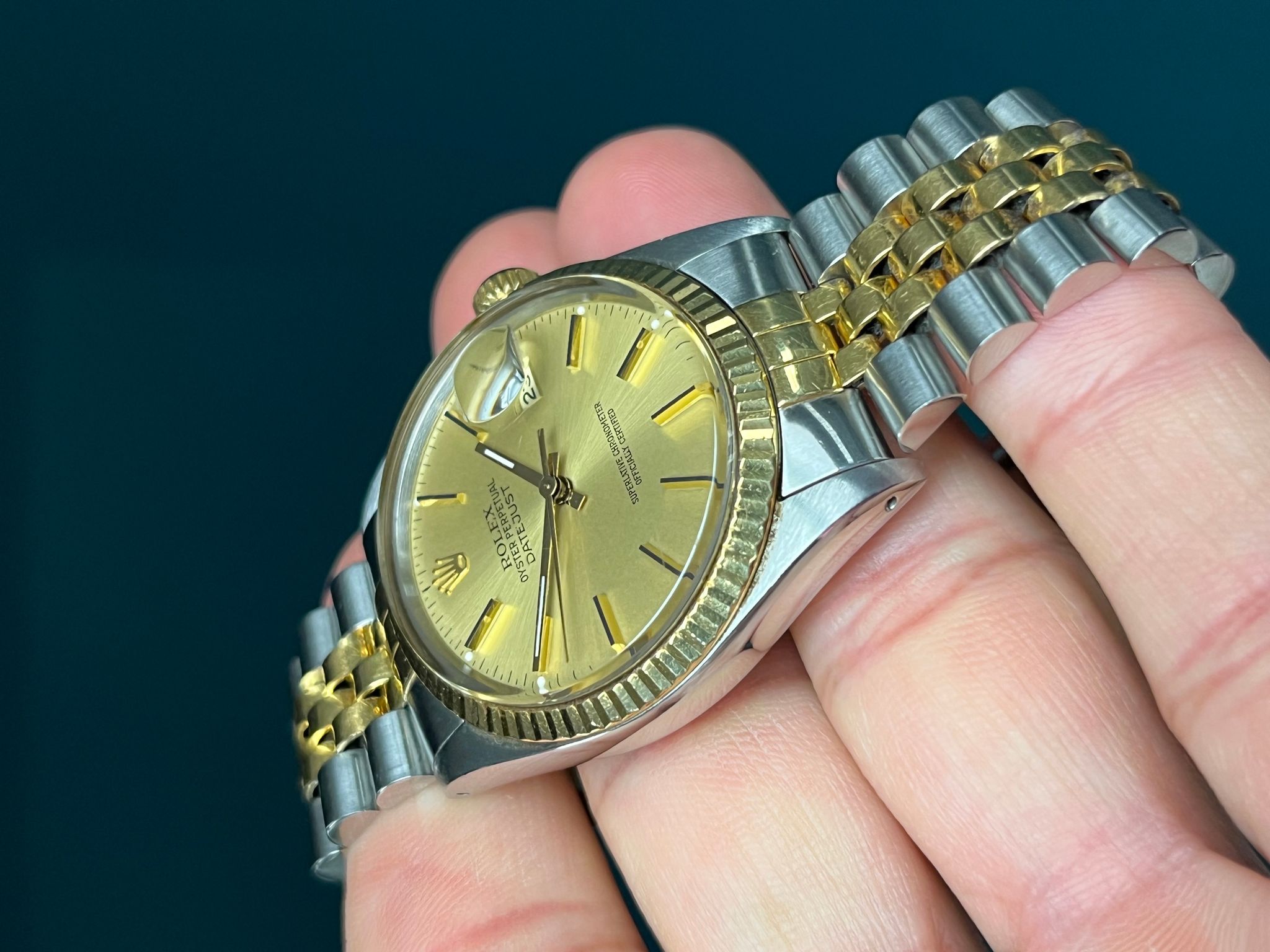 The Vintage Rolex Datejust Reference 16013 with a Champagne dial is a stunning blend of classic elegance and timeless sophistication. Featuring a 36mm stainless steel case paired with a striking 18ct yellow gold fluted bezel, this iconic timepiece captures the essence of Rolex's renowned design ethos. The distinctive Champagne dial, with its subtle textured pattern, adds a unique touch of refinement, beautifully complemented by the applied gold hour markers and hands. Powered by the reliable Rolex Caliber 3035 automatic movement, this watch offers precise timekeeping and the convenience of a quickset date function displayed at 3 o'clock. The two-tone Jubilee bracelet enhances its vintage charm while providing exceptional comfort and style. The Vintage Rolex Datejust 16013 with a Champagne dial is a must-have for collectors and enthusiasts, epitomizing the perfect blend of luxury and enduring appeal.