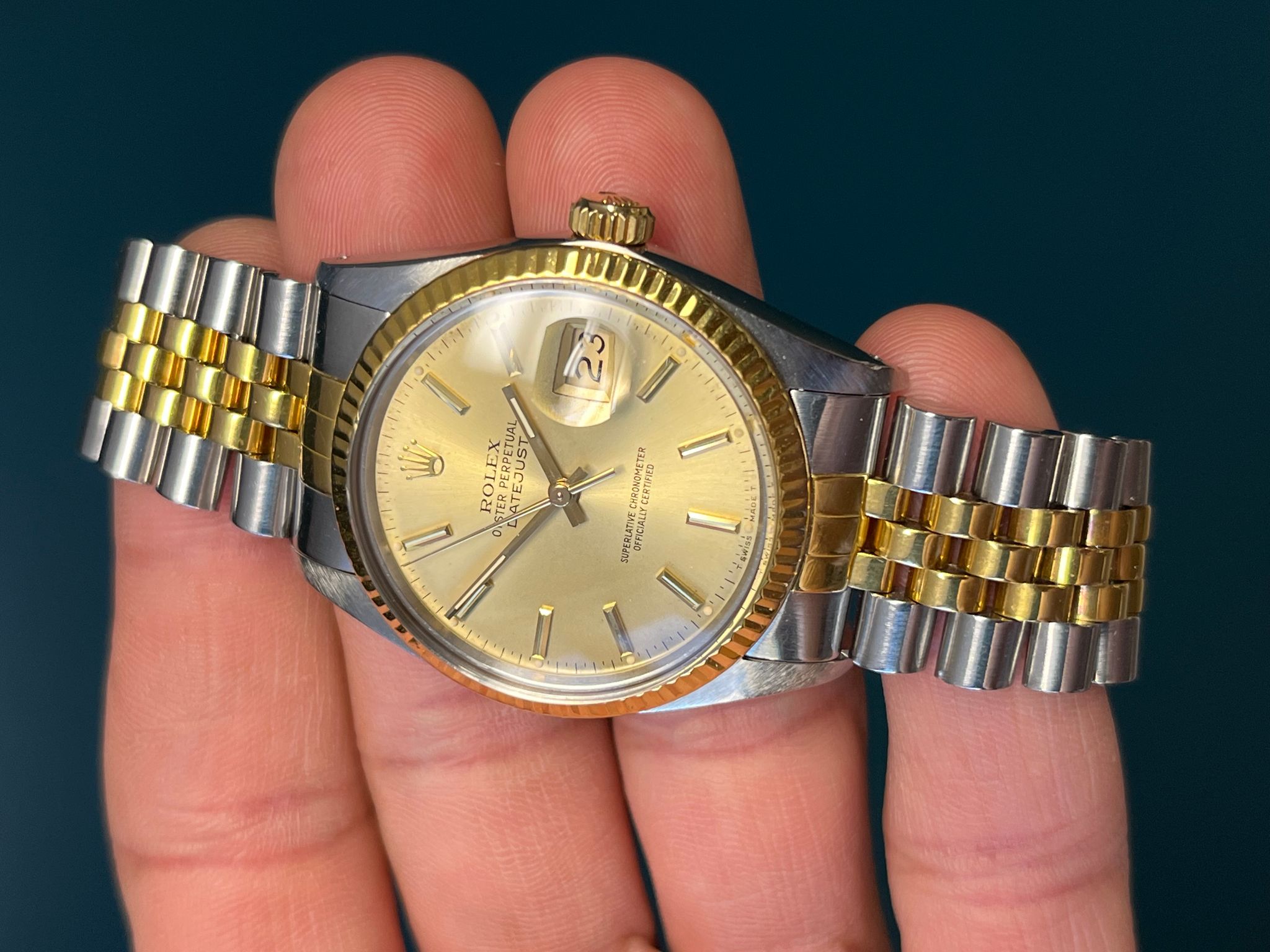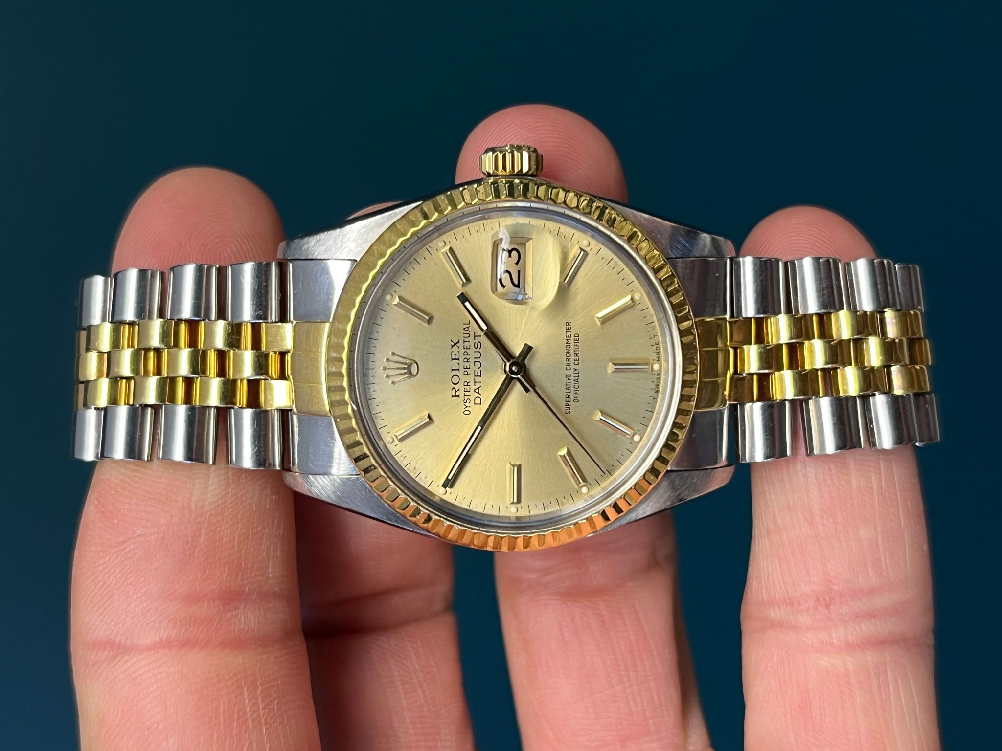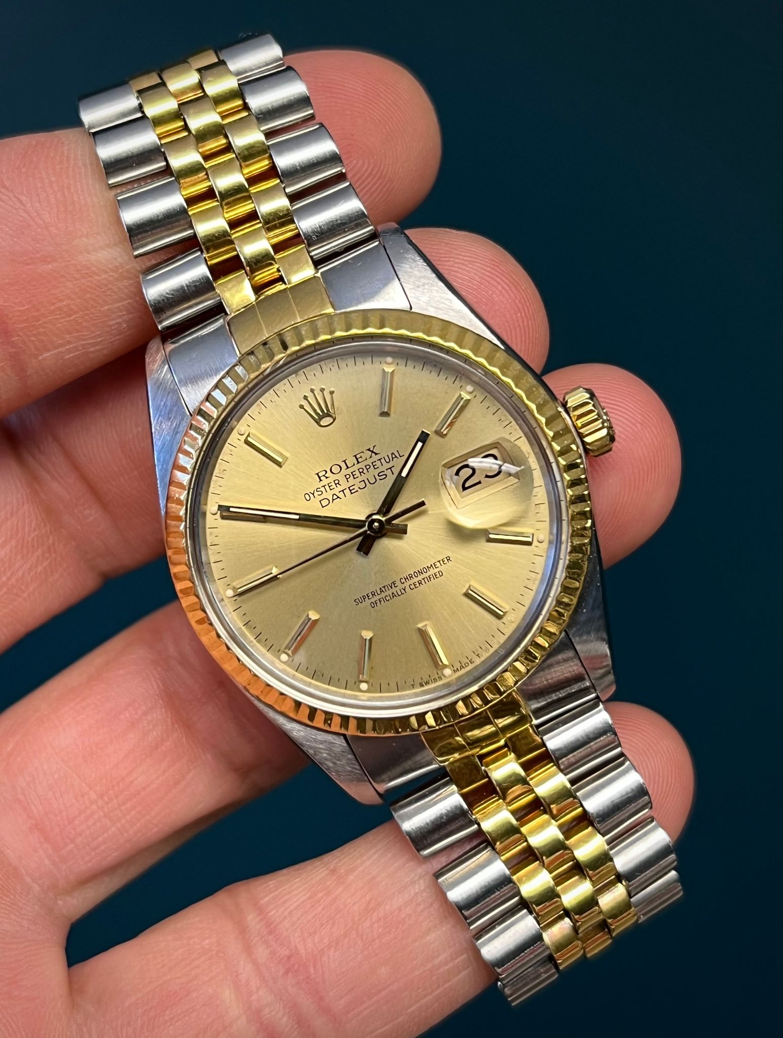 The Vintage Rolex Datejust Reference 16013 with a Champagne dial is a stunning blend of classic elegance and timeless sophistication. Featuring a 36mm stainless steel case paired with a striking 18ct yellow gold fluted bezel, this iconic timepiece captures the essence of Rolex's renowned design ethos. The distinctive Champagne dial, with its subtle textured pattern, adds a unique touch of refinement, beautifully complemented by the applied gold hour markers and hands. Powered by the reliable Rolex Caliber 3035 automatic movement, this watch offers precise timekeeping and the convenience of a quickset date function displayed at 3 o'clock. The two-tone Jubilee bracelet enhances its vintage charm while providing exceptional comfort and style. The Vintage Rolex Datejust 16013 with a Champagne dial is a must-have for collectors and enthusiasts, epitomizing the perfect blend of luxury and enduring appeal.
