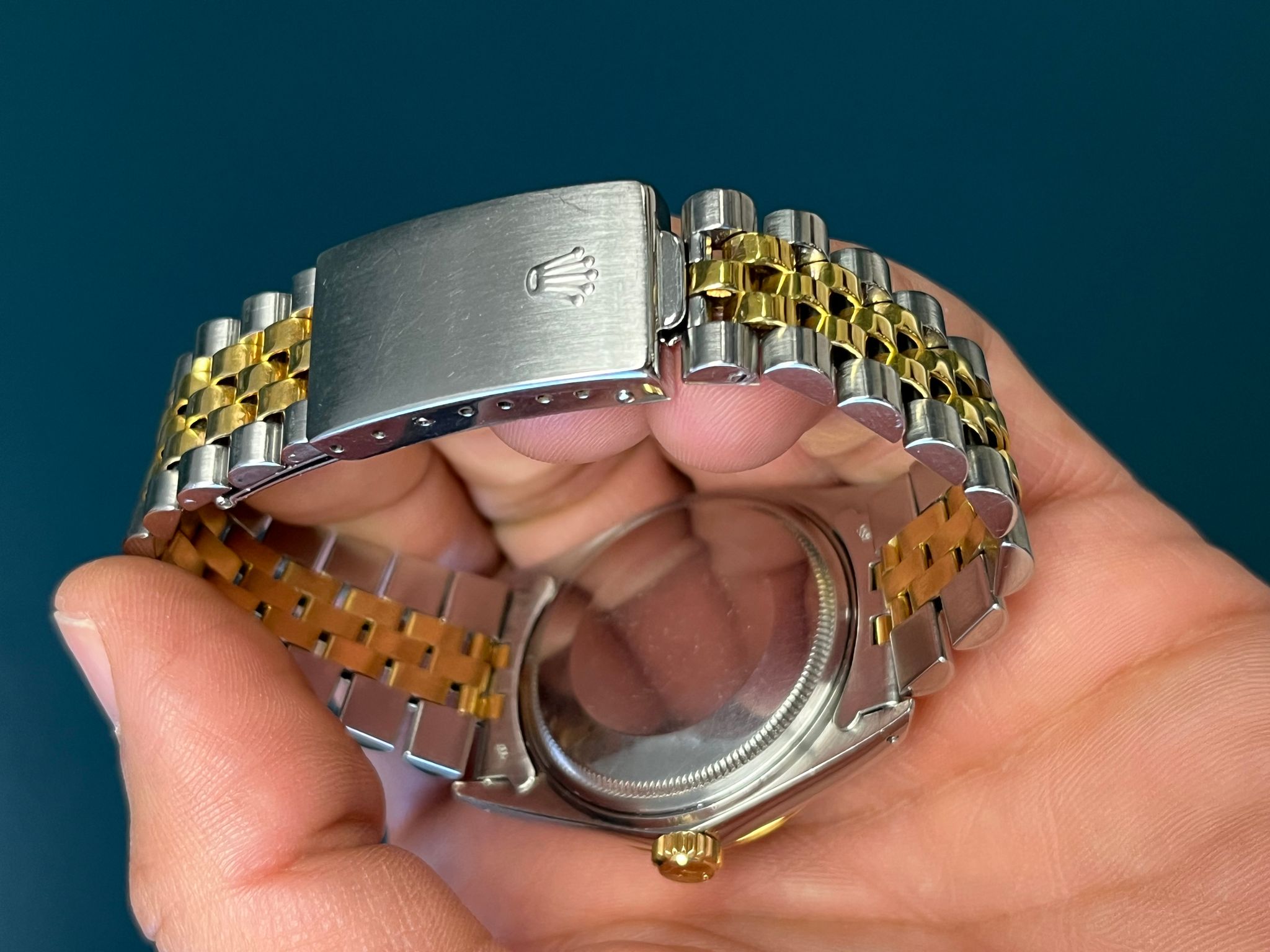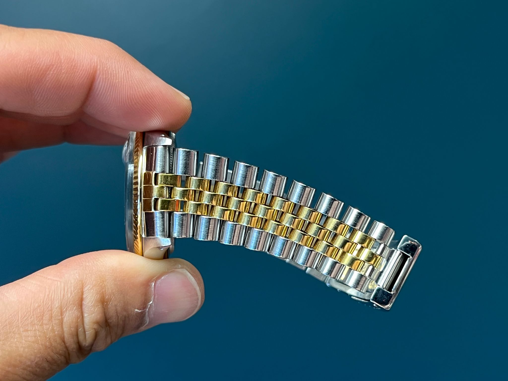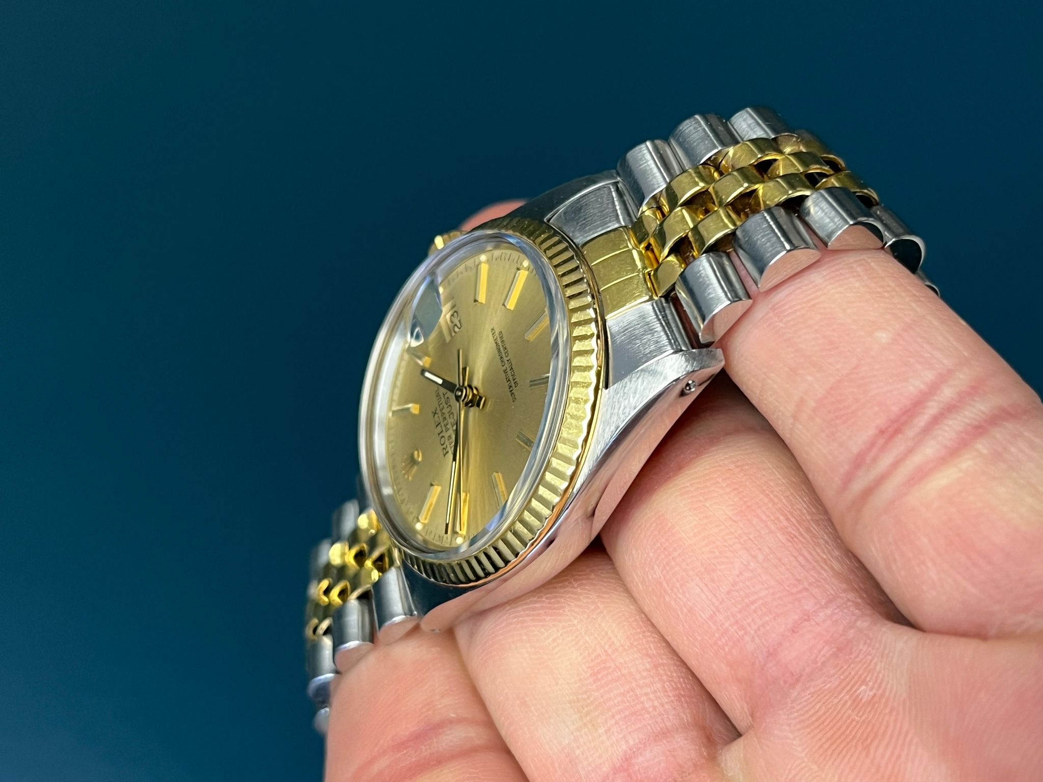 This two-tone Date Just showcases a Champagne dial featuring a date display, exemplifying Rolex's commitment to precision and enduring style. The holes case is razor sharp. The plexi is free from wear partnered with its excellent yellow gold fluted bezel. The Champ dial is excellent with matching pumpkin patina. The two-tone jubilee bracelet is excellent with 4 removable links and only light stretch. Watch is running and keeping time.