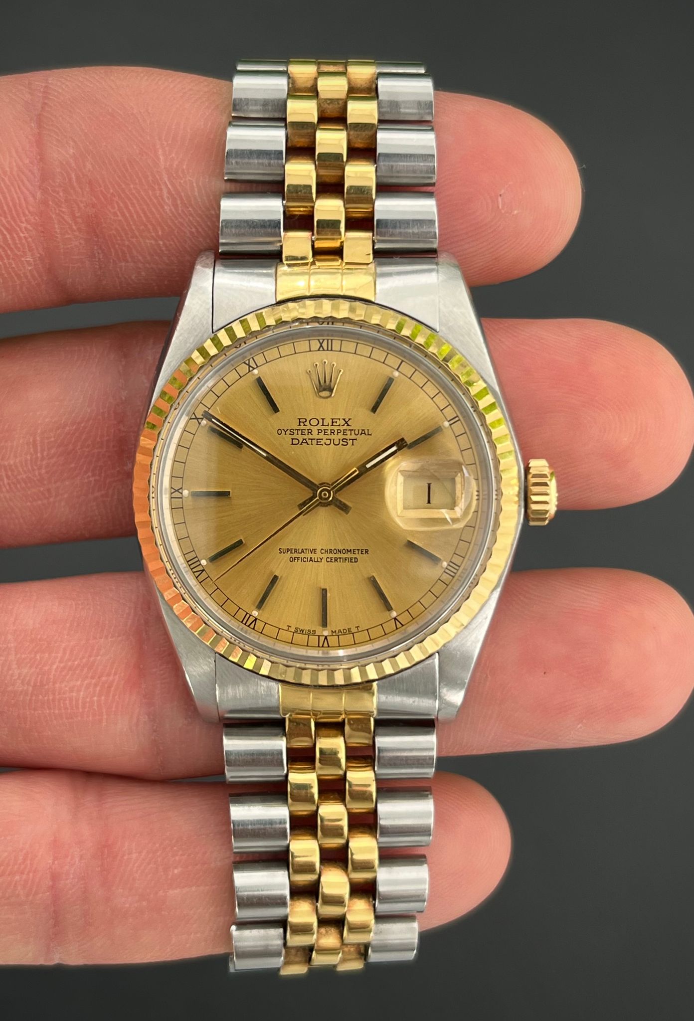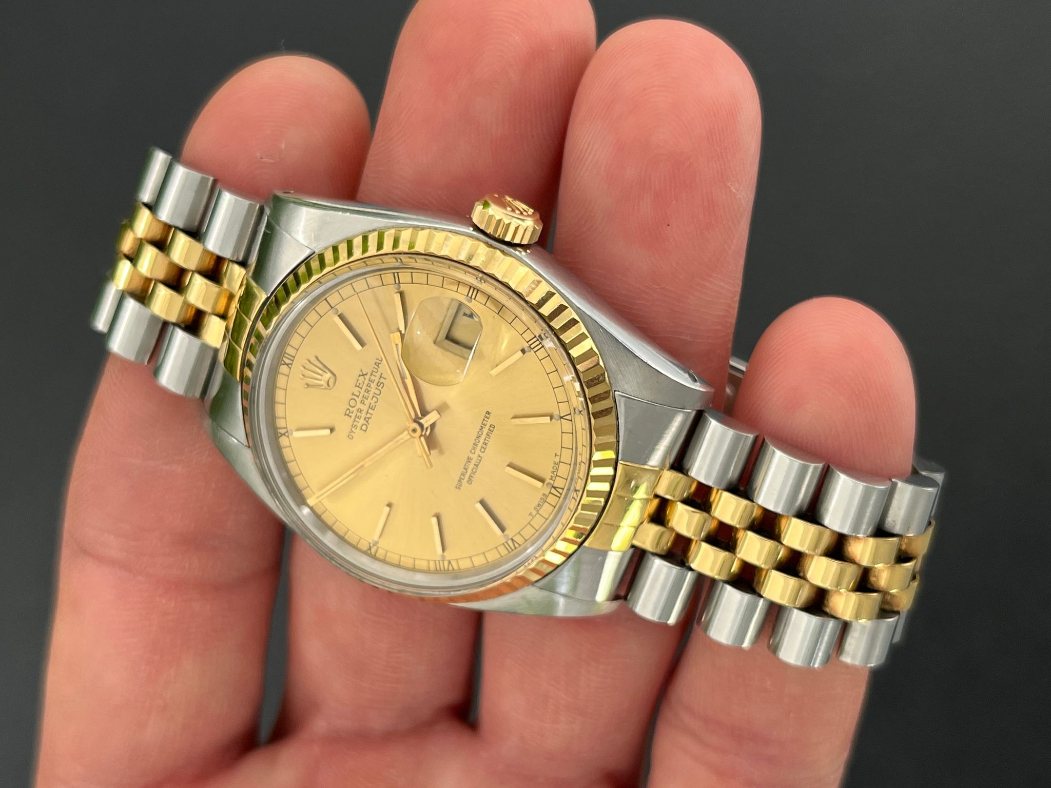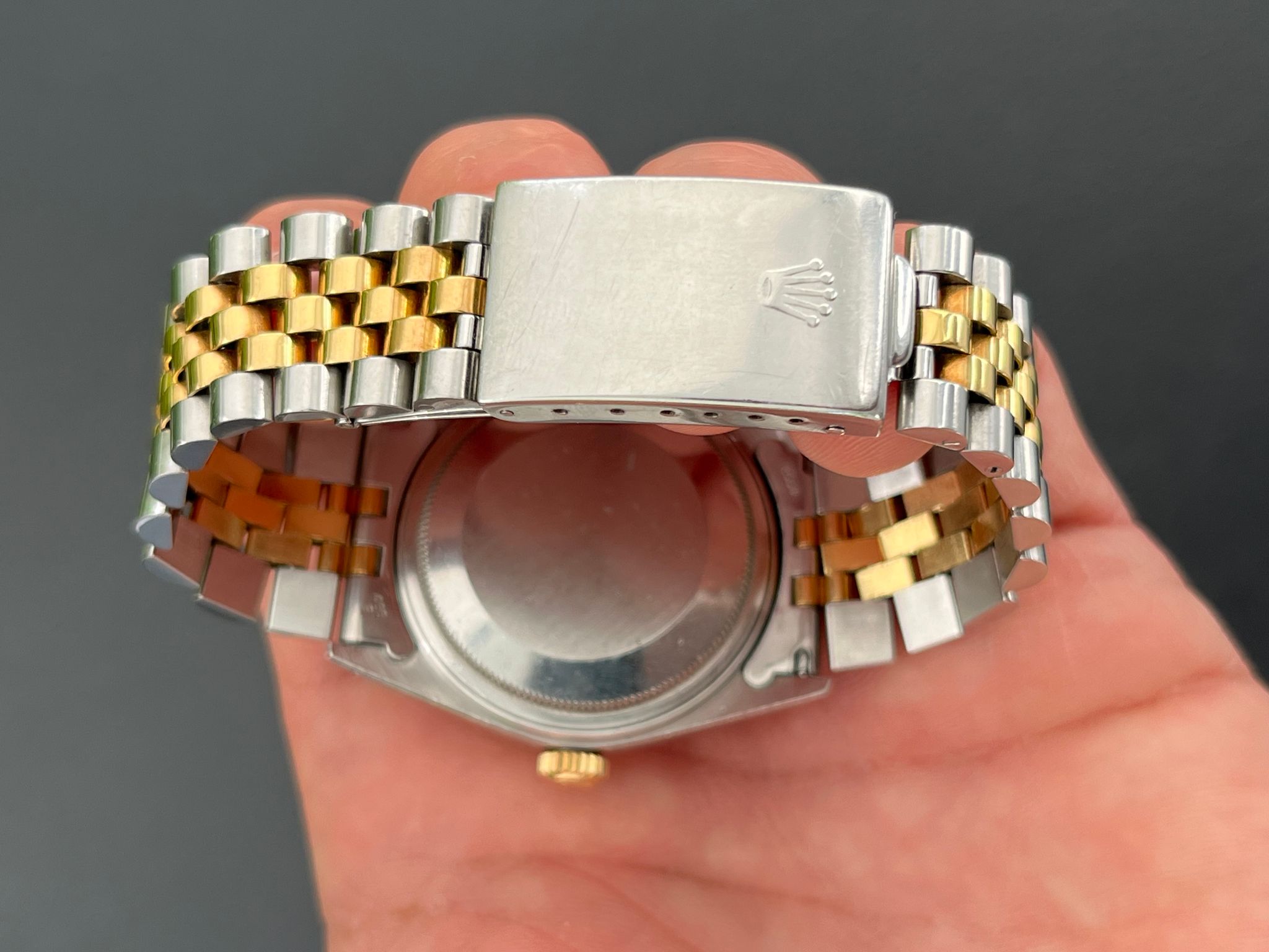 This two-tone Date Just showcases a rustic toned dial featuring a date display, exemplifying Rolex's commitment to precision and enduring style. The holes case is razor sharp. The plexi is free from wear partnered with its excellent yellow gold fluted bezel. The rustic toned dial is excellent. The two-tone jubilee bracelet has 4 removable screws and shows light stretch. Watch is running and keeping time.
