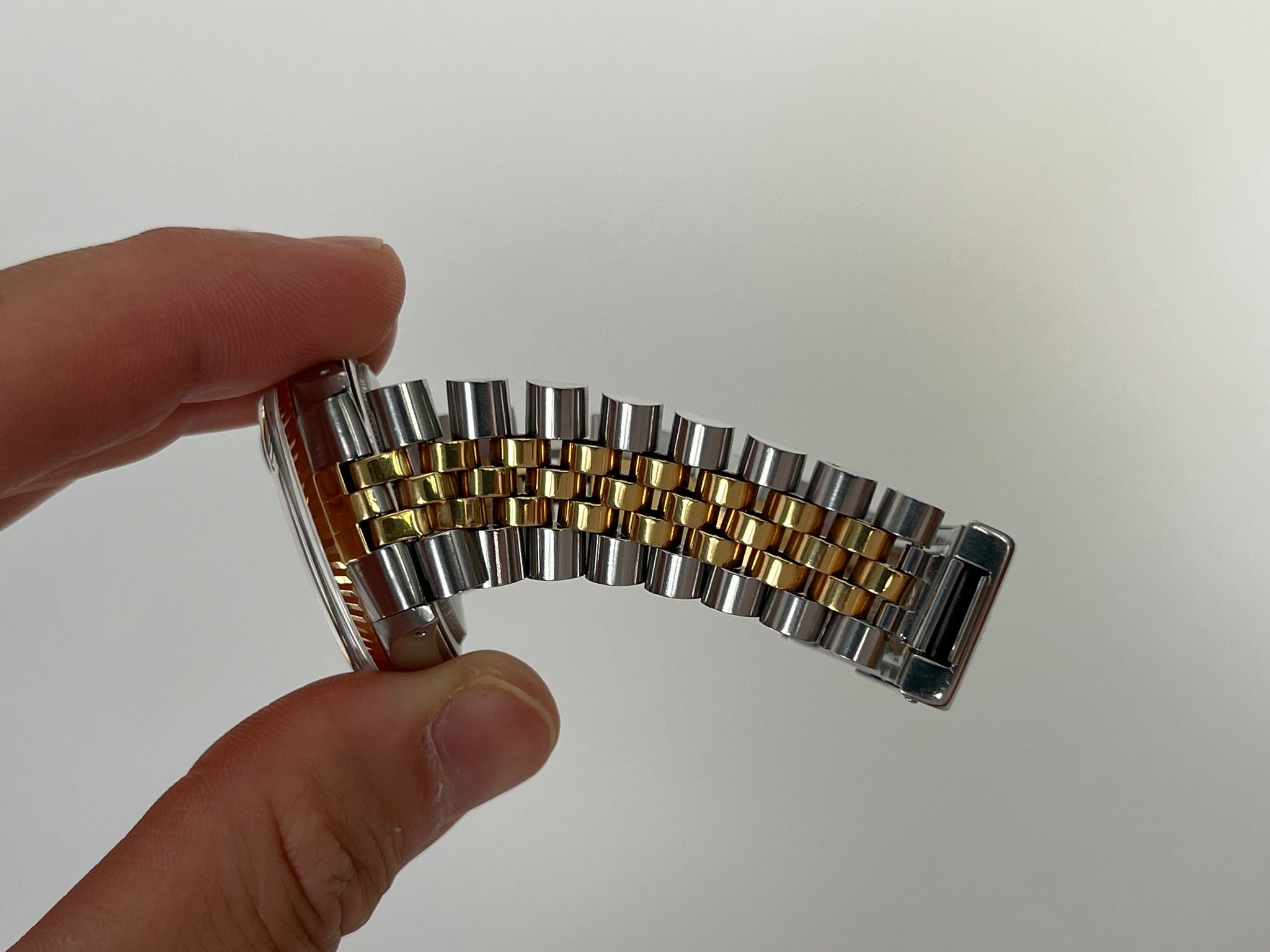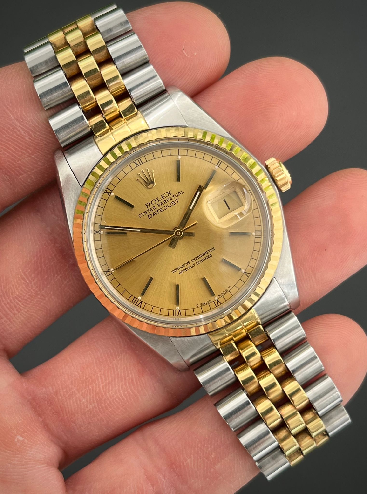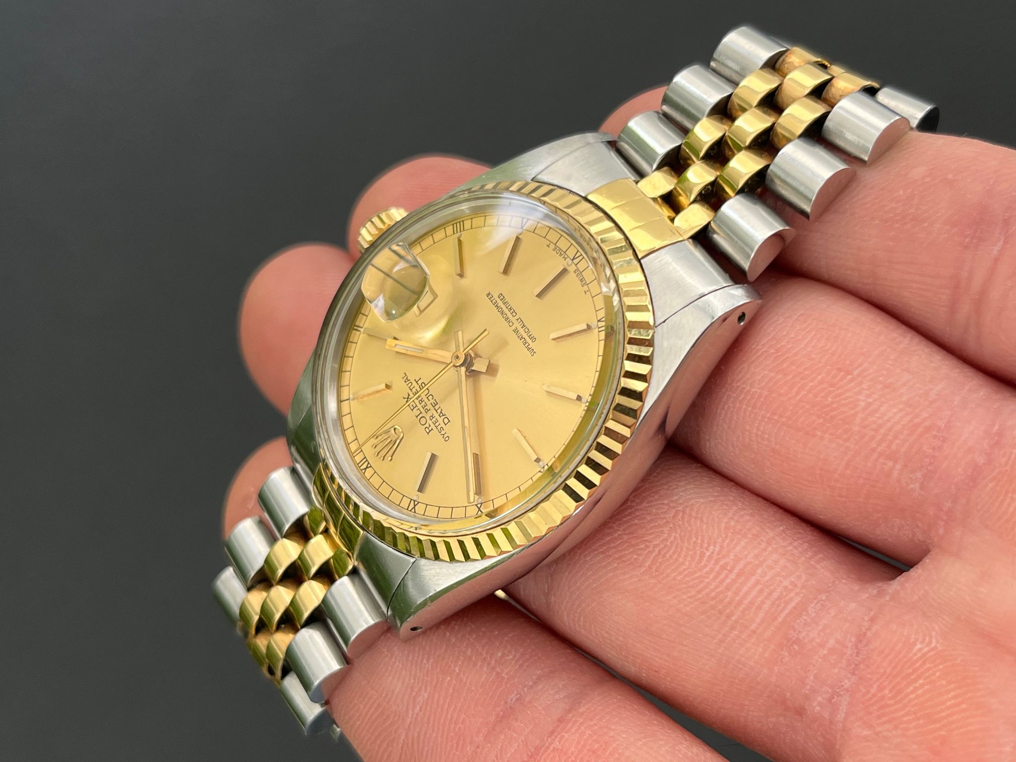 This two-tone Date Just showcases a rustic toned dial featuring a date display, exemplifying Rolex's commitment to precision and enduring style. The holes case is razor sharp. The plexi is free from wear partnered with its excellent yellow gold fluted bezel. The rustic toned dial is excellent. The two-tone jubilee bracelet has 4 removable screws and shows light stretch. Watch is running and keeping time.