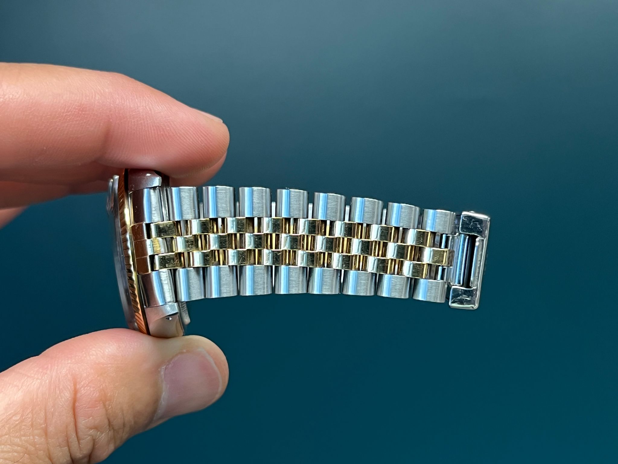 This two-tone Date Just showcases a factory Tiffany & Co. Champagne dial featuring a date display, exemplifying Rolex's commitment to precision and enduring style. The holes case is unpolished and razor sharp. The plexi is free from wear partnered with its excellent yellow gold fluted bezel. The Tiffany & Co. Champ dial is excellent with matching patina. The two-tone jubilee bracelet is excellent with no stretch. Watch is running and keeping time.