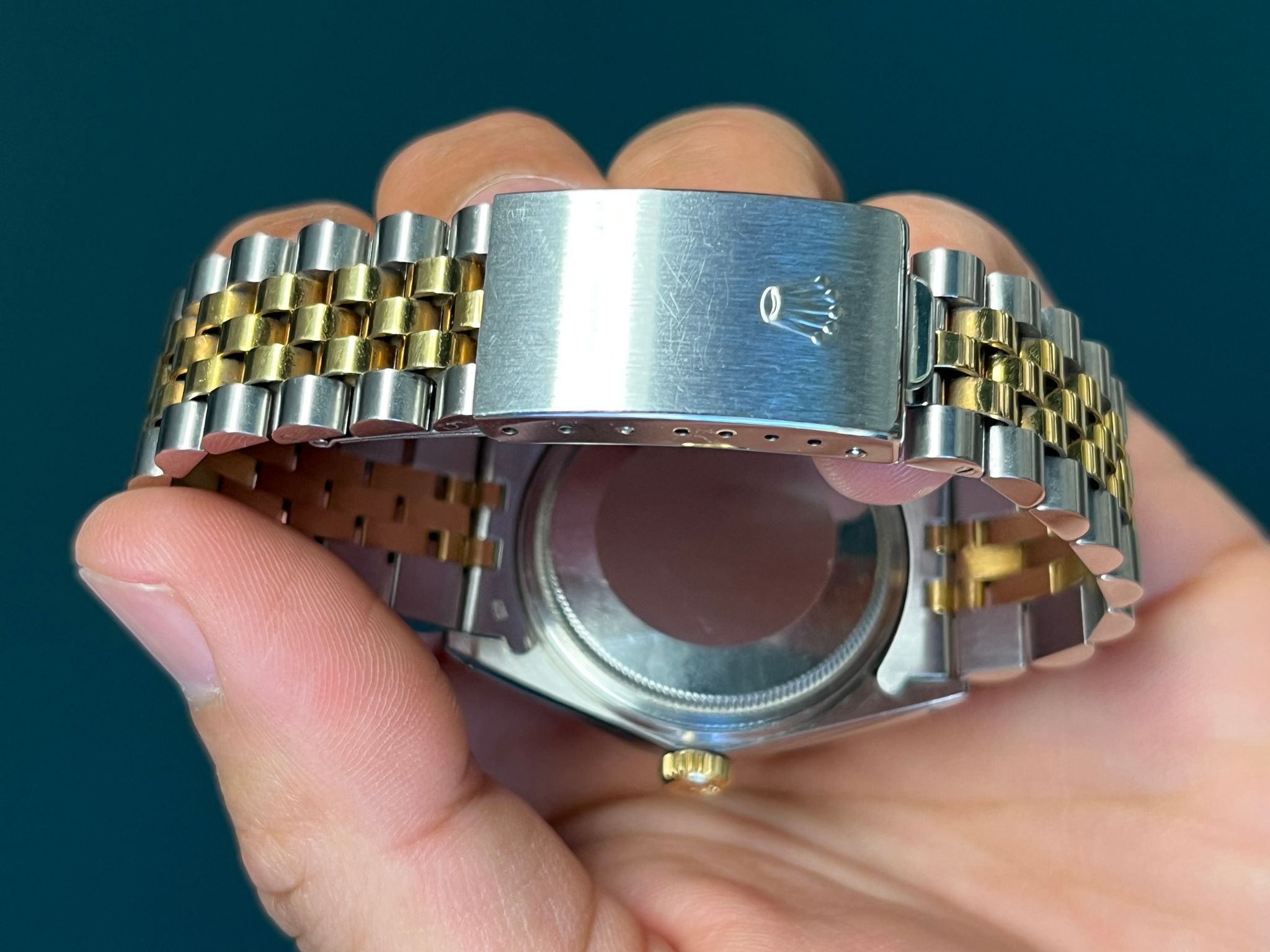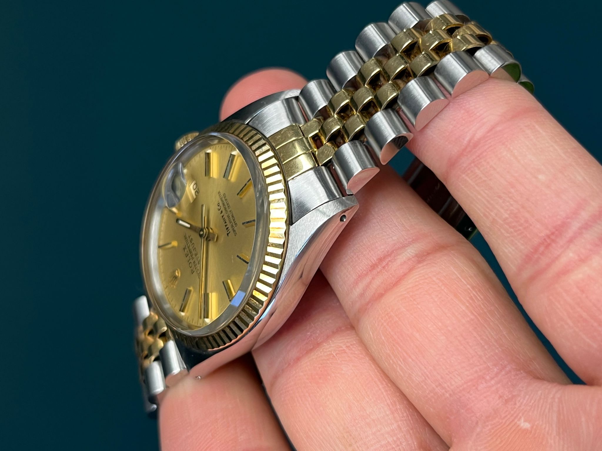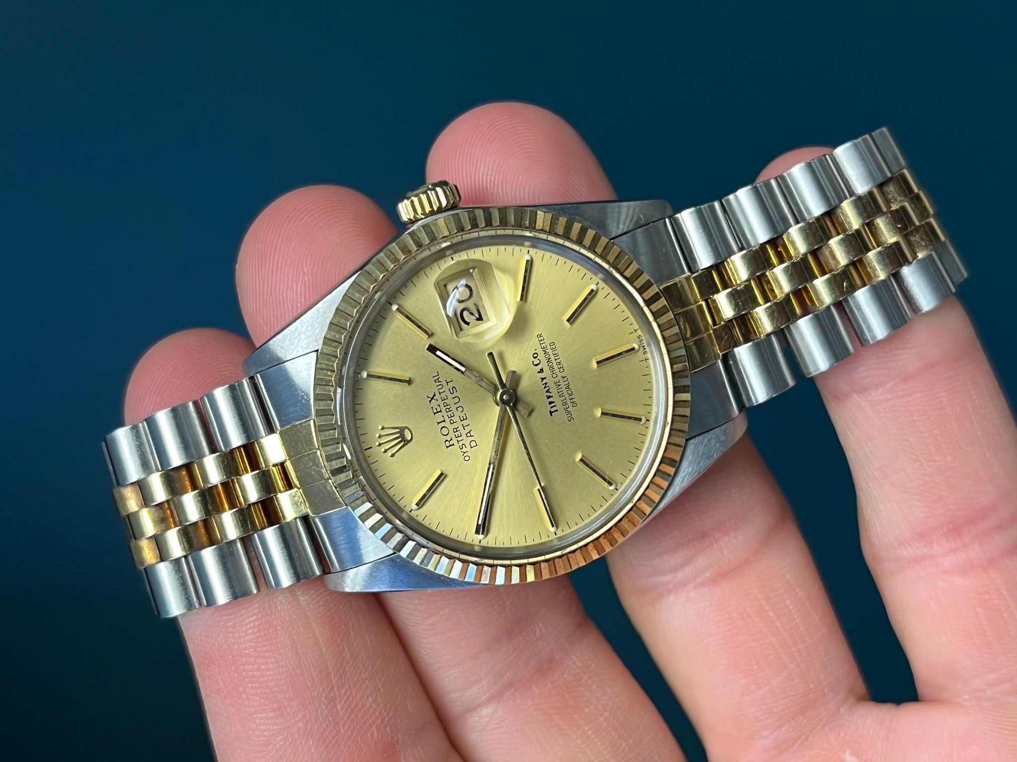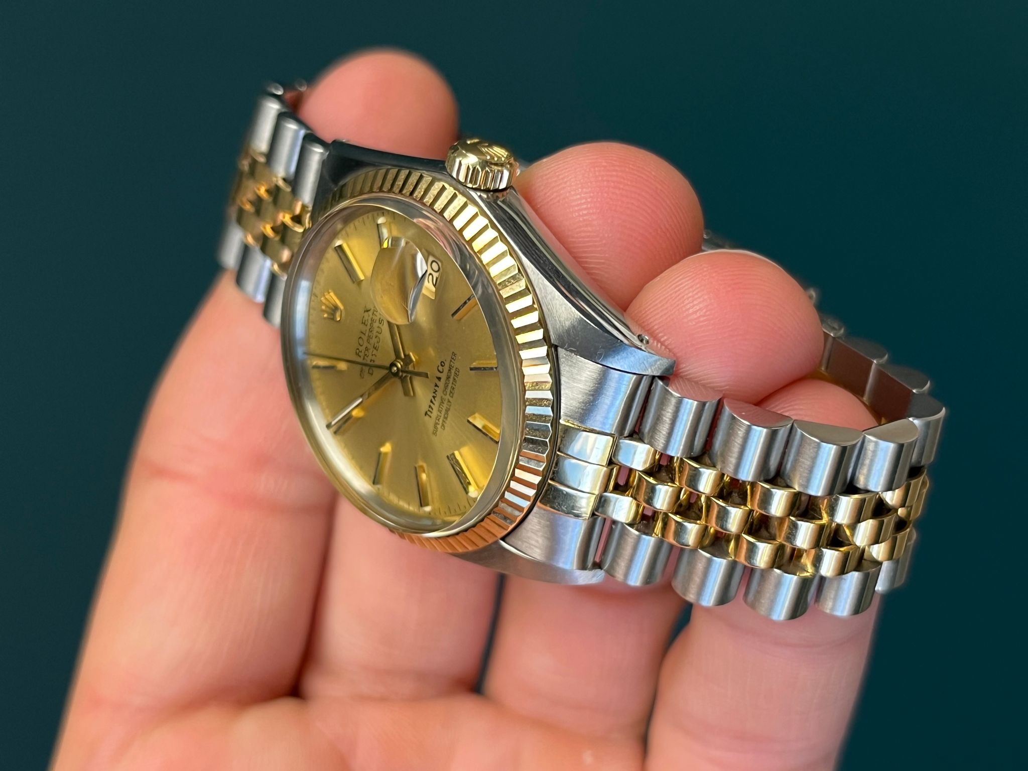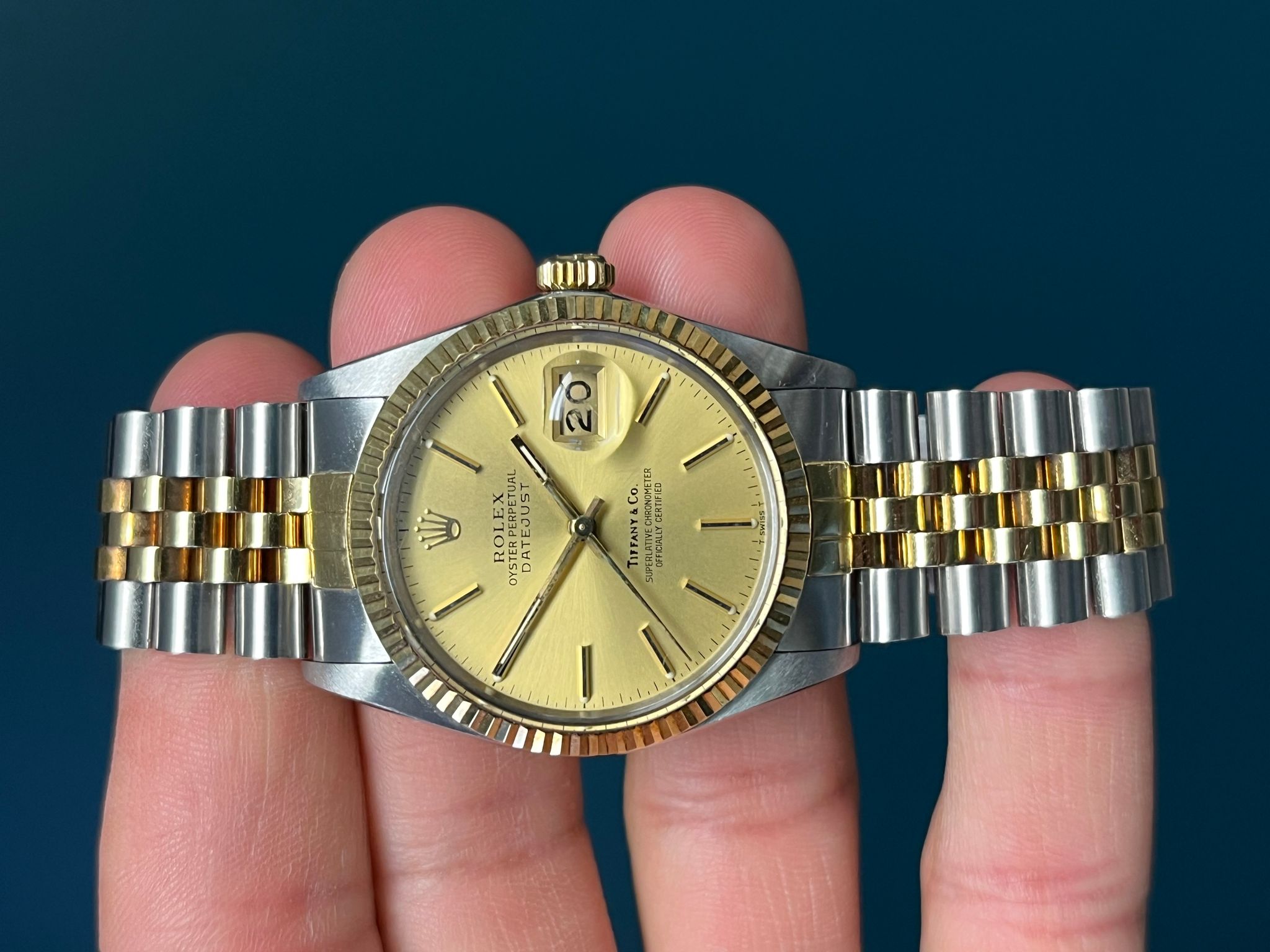 The Vintage Rolex Datejust Reference 16013 with a factory Tiffany & Co Champagne dial is a stunning blend of classic elegance and timeless sophistication. Featuring a 36mm stainless steel case paired with a striking 18ct yellow gold fluted bezel, this iconic timepiece captures the essence of Rolex's renowned design ethos. The distinctive Champagne dial, with its subtle textured pattern, adds a unique touch of refinement, beautifully complemented by the applied gold hour markers and hands. Powered by the reliable Rolex Caliber 3035 automatic movement, this watch offers precise timekeeping and the convenience of a quickset date function displayed at 3 o'clock. The two-tone Jubilee bracelet enhances its vintage charm while providing exceptional comfort and style. The Vintage Rolex Datejust 16013 with a Champagne dial is a must-have for collectors and enthusiasts, epitomizing the perfect blend of luxury and enduring appeal.