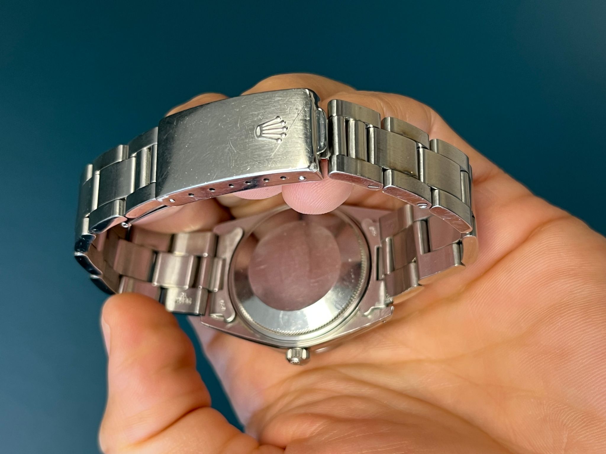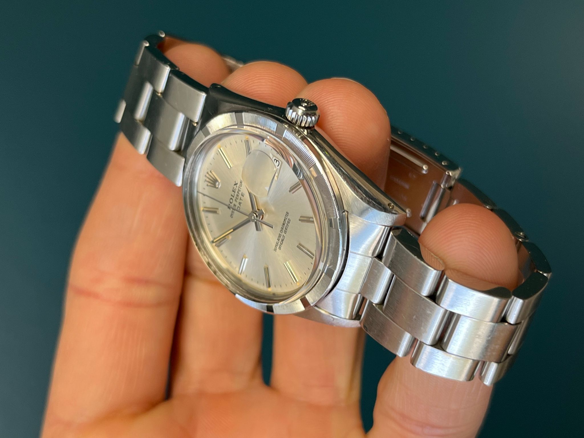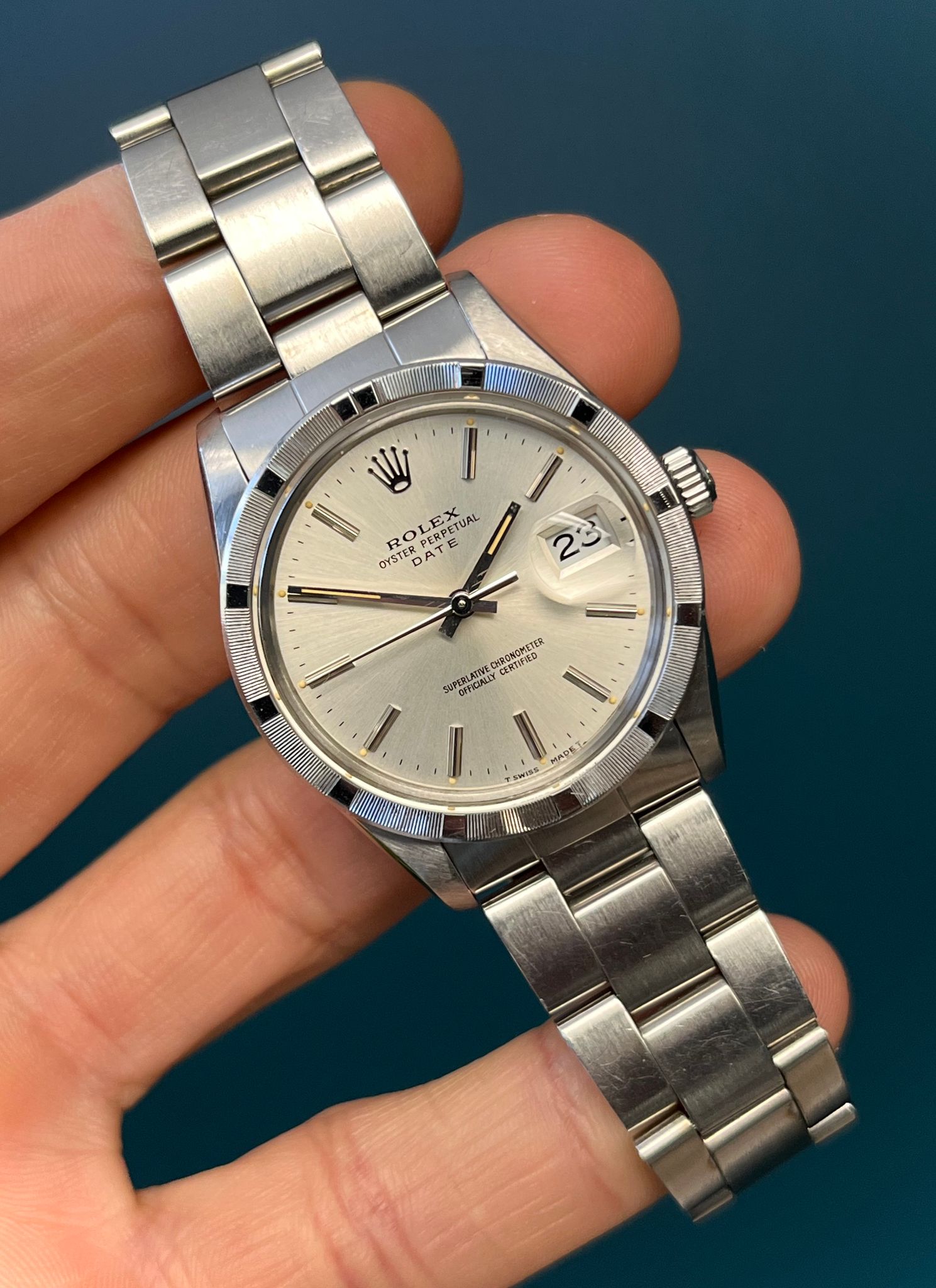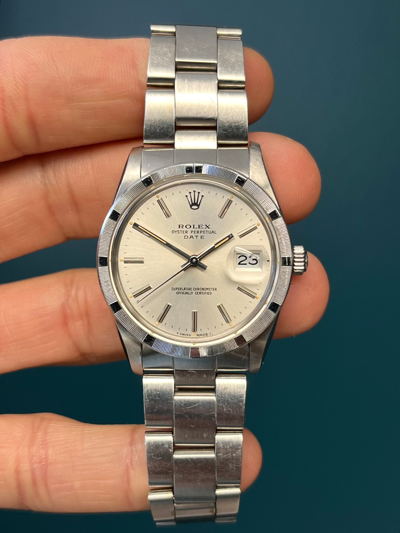 The vintage Rolex Date reference 15010 is a striking timepiece that perfectly balances classic refinement with unique character. Featuring a crisp silver stick dial, this example stands out with its beautifully aged pumpkin patina, adding warmth and depth to its aesthetic. The 34mm stainless steel case, paired with its signature engine-turned bezel, remains in excellent condition, showcasing sharp lines and minimal wear. Powered by the reliable automatic Rolex caliber 3035 movement with a quickset date function, this watch combines vintage charm with everyday practicality. A rare find in such well-preserved condition, this 15010 is a must-have for collectors who appreciate timeless design and unique patina and its original Box and papers.