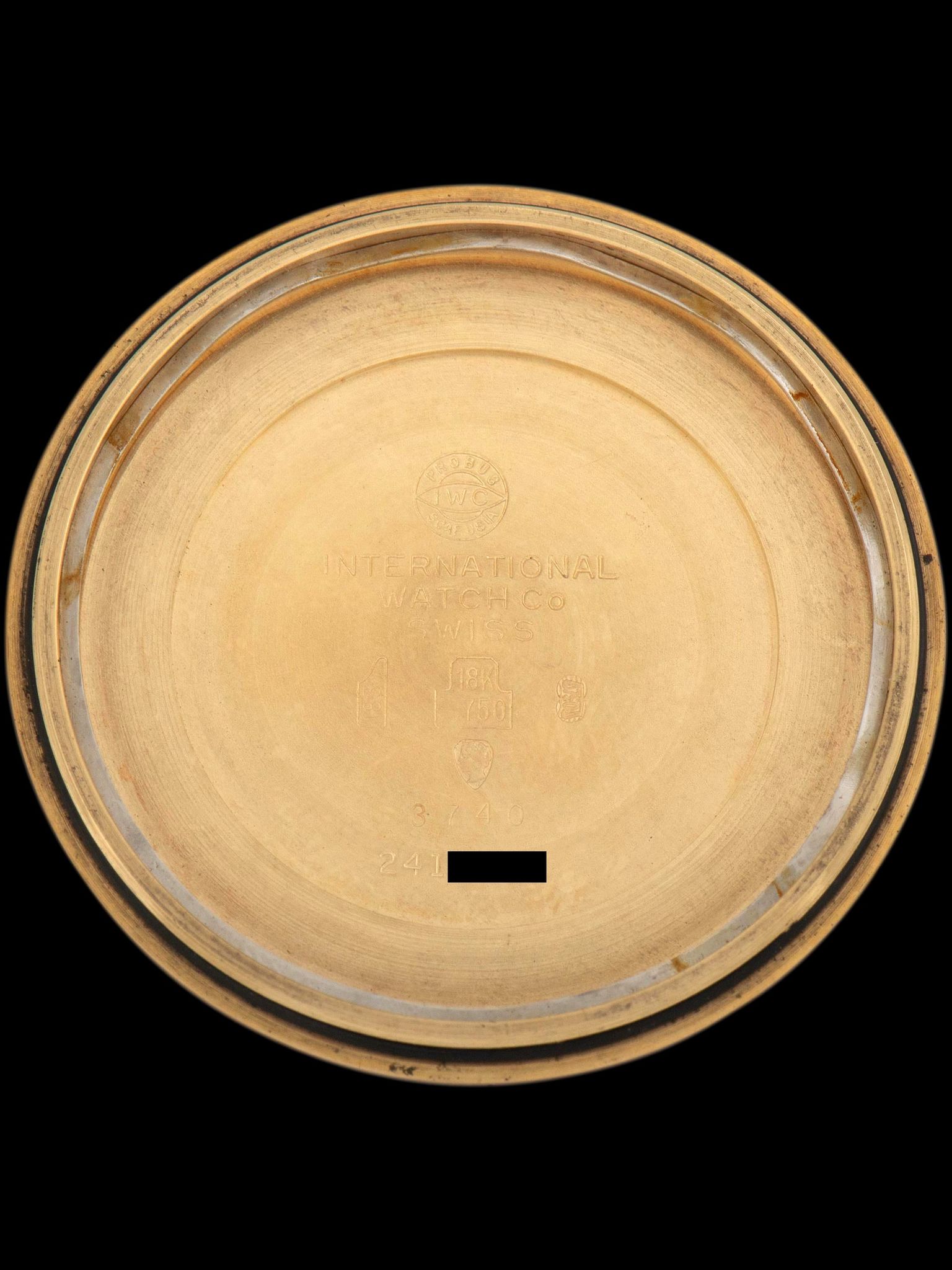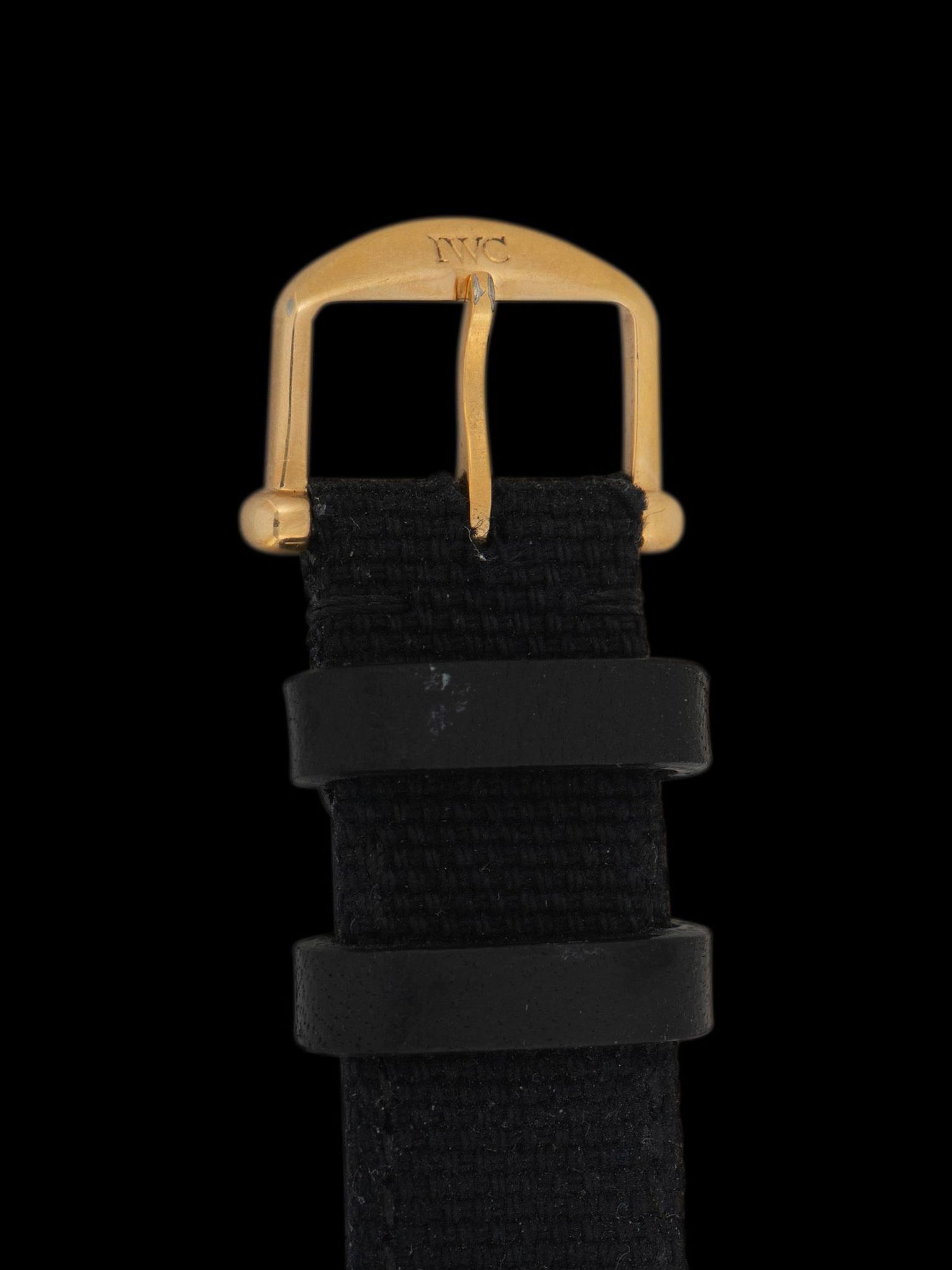The excellent 18K yellow gold case retains full and symmetrical lugs that show gentle signs of use and light evidence of being previously polished. The case retains its original screw-down crown signed with the IWC fish logo and the inverse gold pushers. The case back was previously polished, making the factory engravings very faint, with the limited edition number no longer legible; however, the serial number still remains visibly present. The watch comes supplied on a 2pc canvas and leather strap with a gold plaque IWC tang buckle.