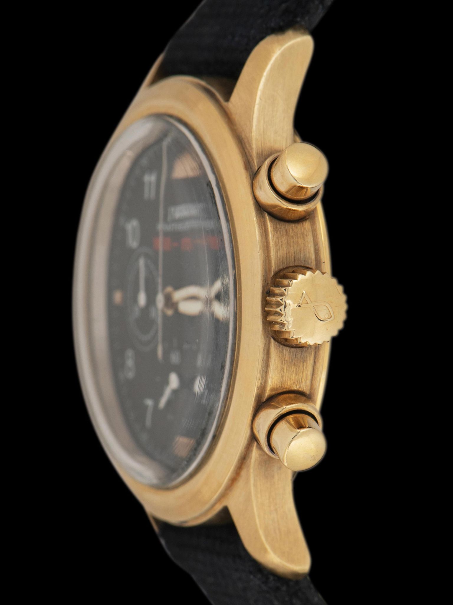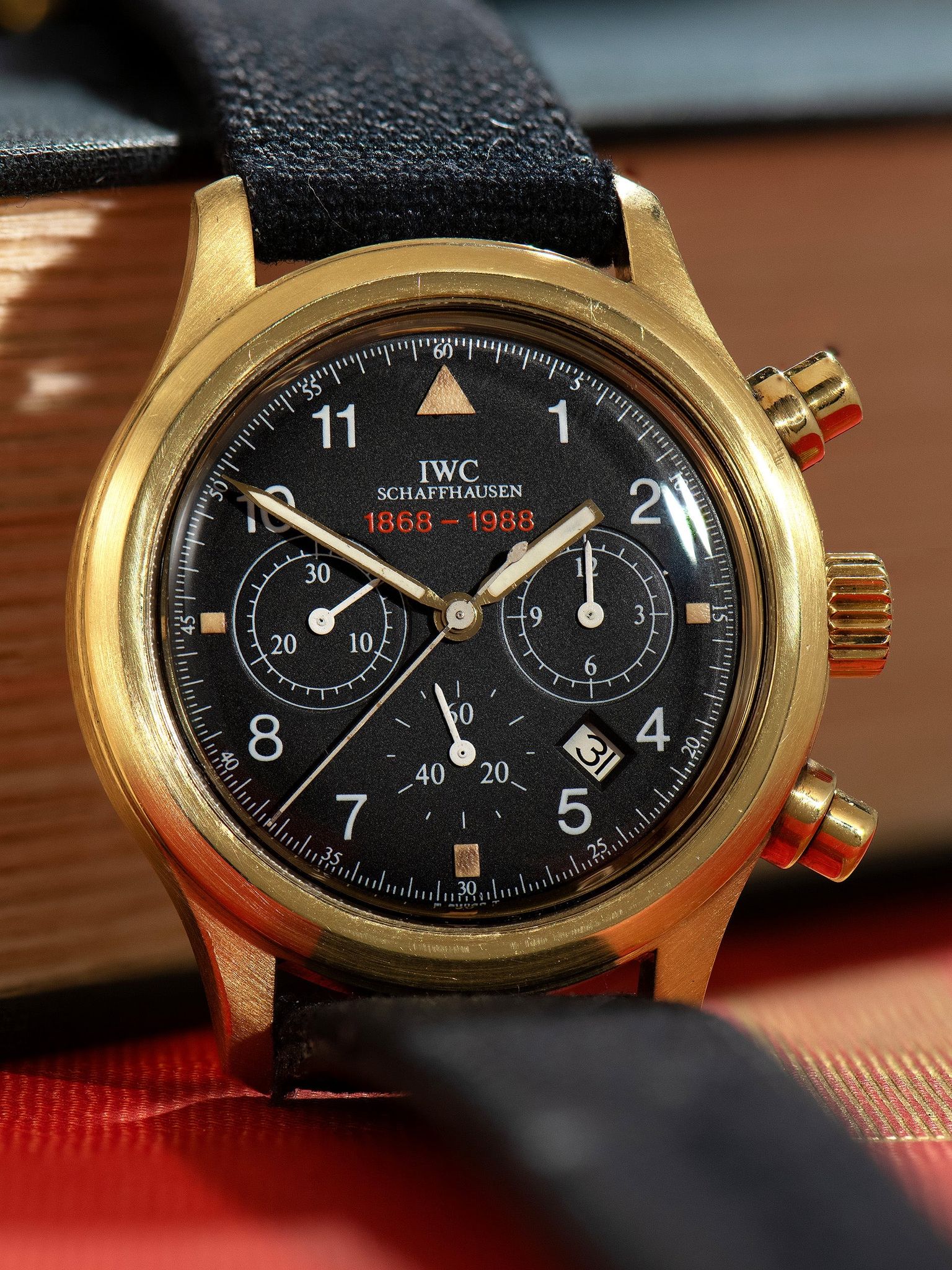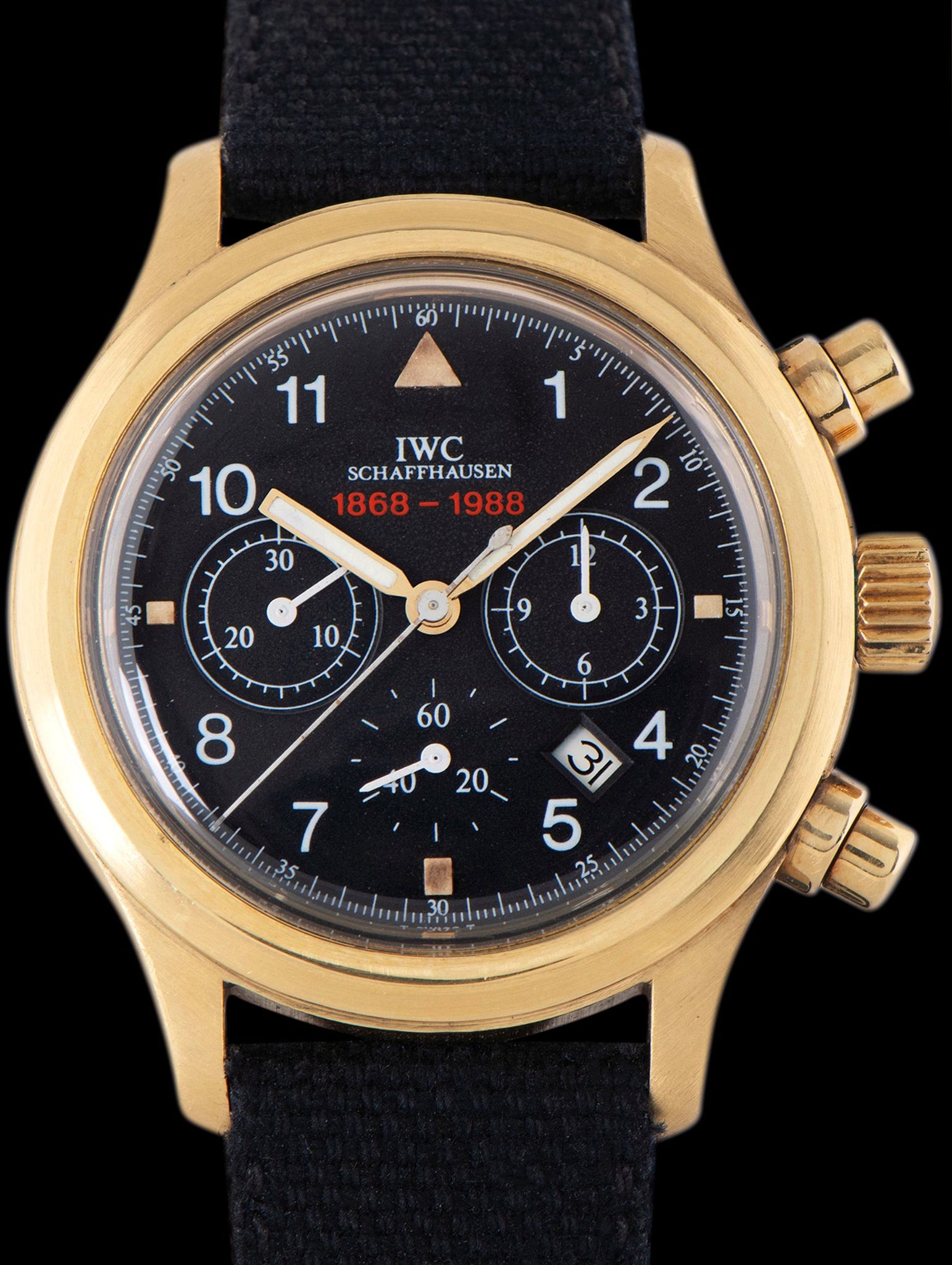 Released in 1988 to commemorate IWC’s 120th anniversary, the IWC Fliegerchronograph ref. 3740 is a striking blend of tradition, utility, and elegance. Marked by the red "1868–1988" printing on the dial, this celebratory model stands out not only for its historical significance but also for its unconventional execution. Housed in a solid 18K yellow gold case, the 3740 brings together IWC’s classic utilitarian, aviation-inspired dial with a precious metal case, a rare and bold design choice for IWC in this era. The juxtaposition of a rugged Flieger-style layout with the warmth of yellow gold reflects IWC’s willingness to experiment during this commemorative release.