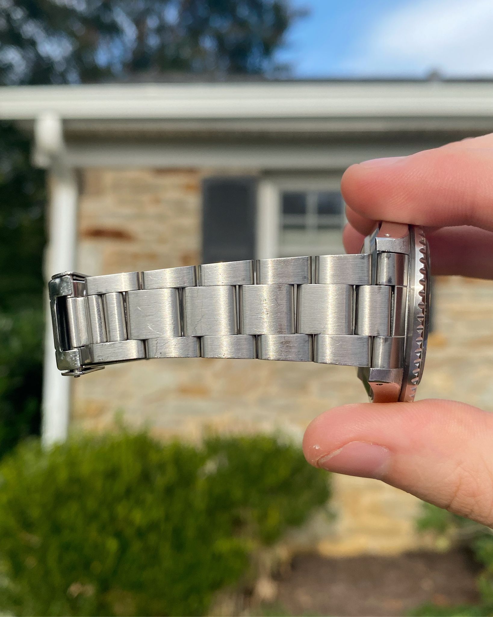 The case appears unpolished, retaining thick even lugs with strong factory brush lines, crisp well defined chamfers, and its original caseback sticker mostly intact. The Oyster bracelet shows minimal stretch, and has stood the test of time well. The dial has been preserved exceptionally well and contains light spidering on its lacquer, which is a common trait found on early gloss dials. Overall the Submariner remains in excellent vintage condition, and is a wonderful one owner example of a seldom seen transitional Submariner reference 168000.