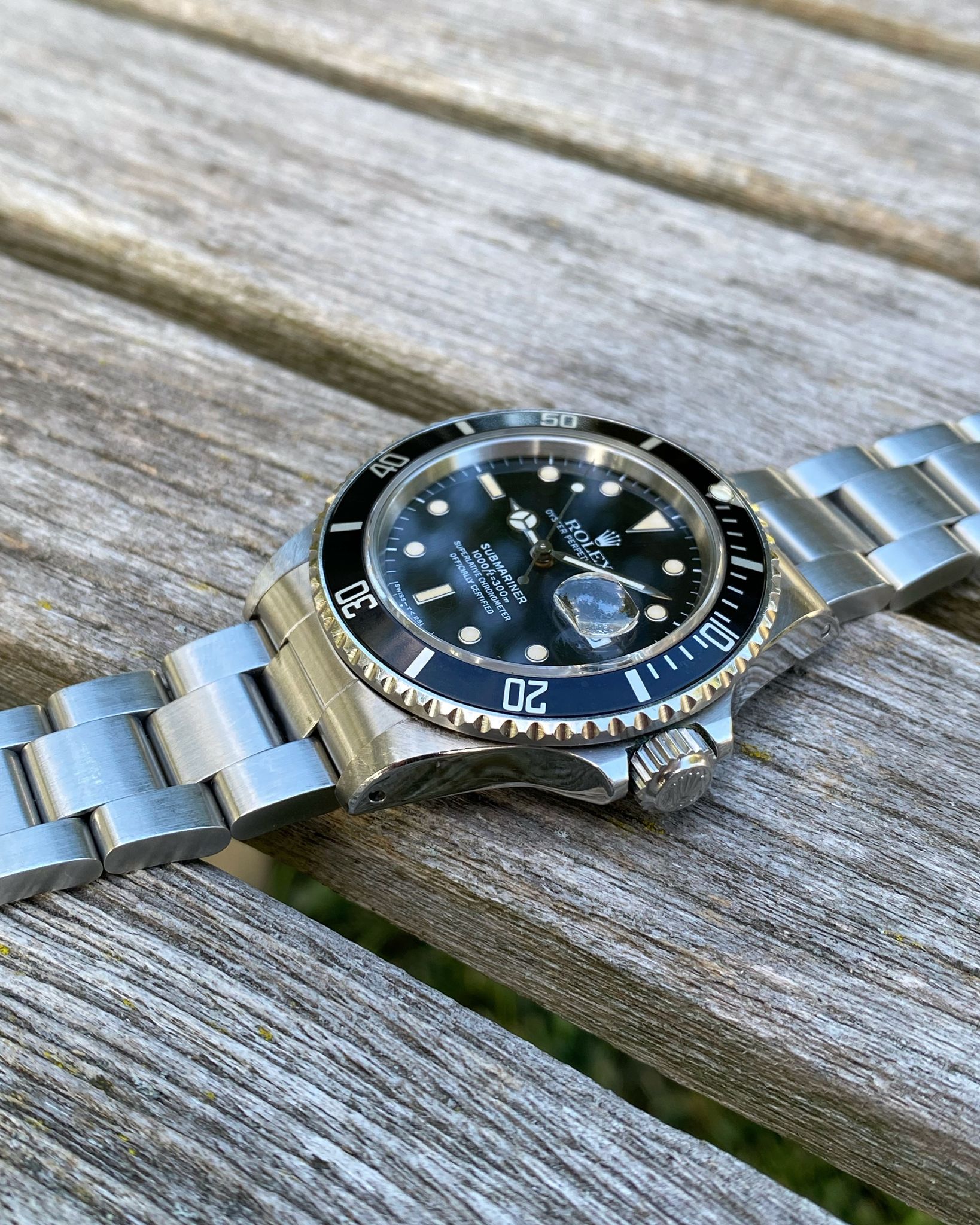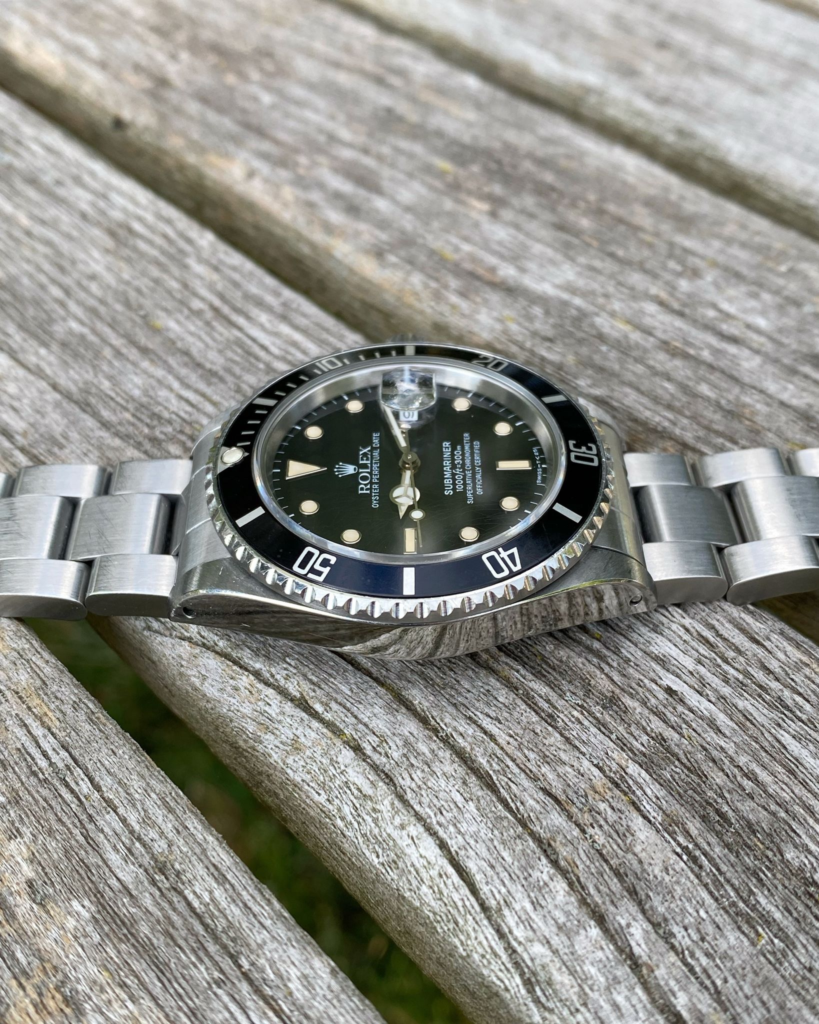 For sale is an excellent condition 40mm stainless steel Rolex Submariner Date. The transitional reference 168000 is a R595,XXX serial, circa 1988 production, and is not accompanied by box or papers.
