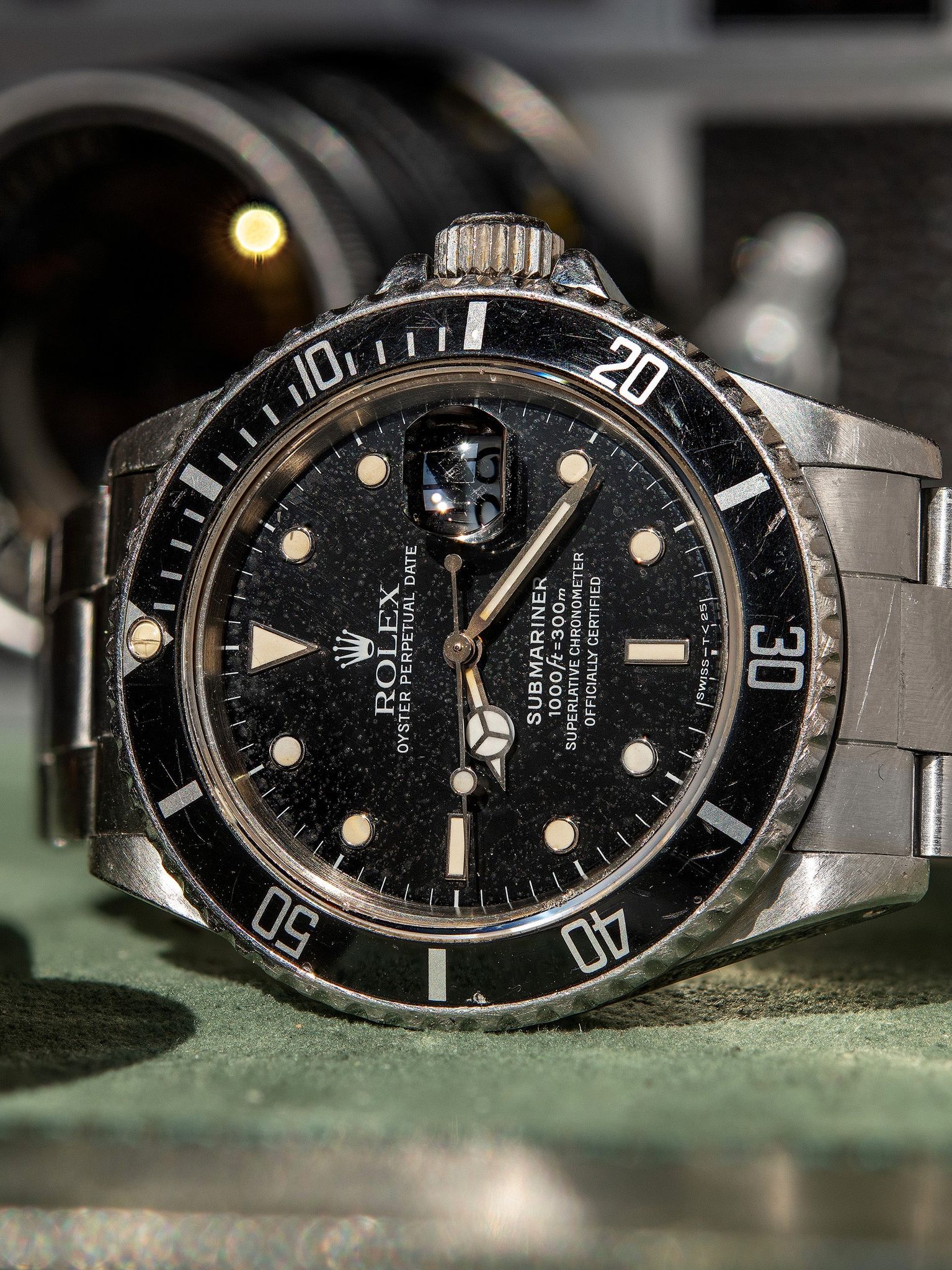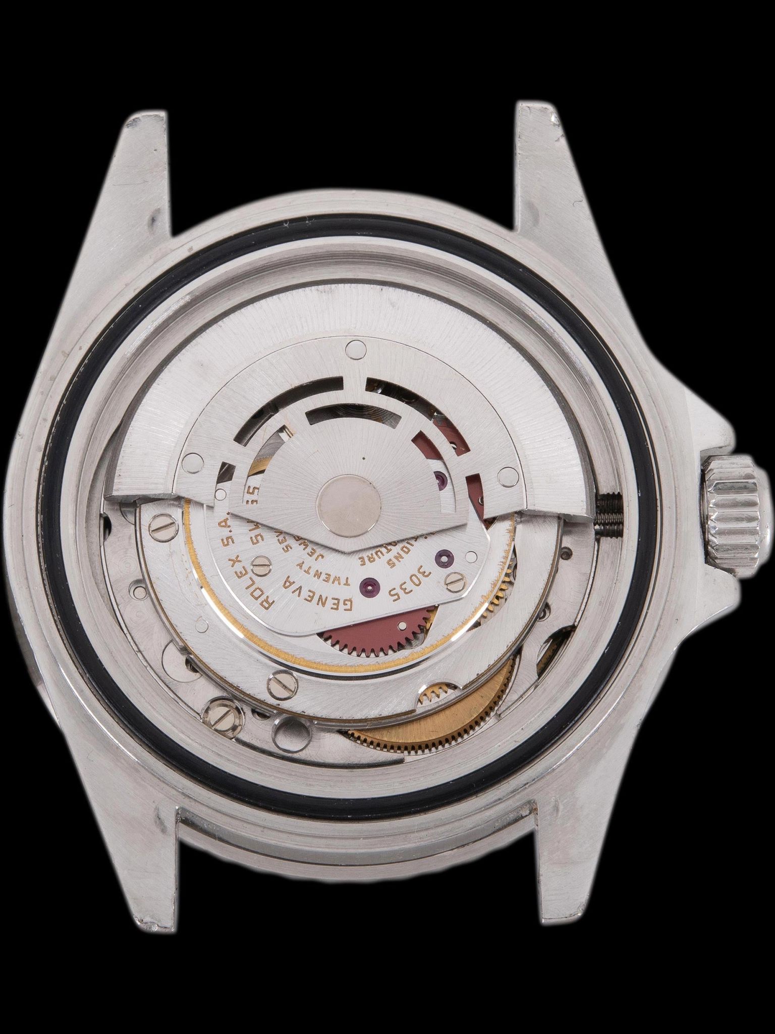 The original glossy black dial with white gold surround markers is in exceptional condition, showing no damage, and features an absolutely beautiful speckled patina that is even throughout. The original tritium lume plots have aged to a charming eggshell color, under UV light inspection there is some superficial cracking present in the 12 o'clock triangle marker and it remains stable, the rest of the lume plots exhibit no imperfections. The original tritium hands match the dial perfectly and show no degradation under UV light inspection. The white date wheel is original with "open" 6's and 9's.
